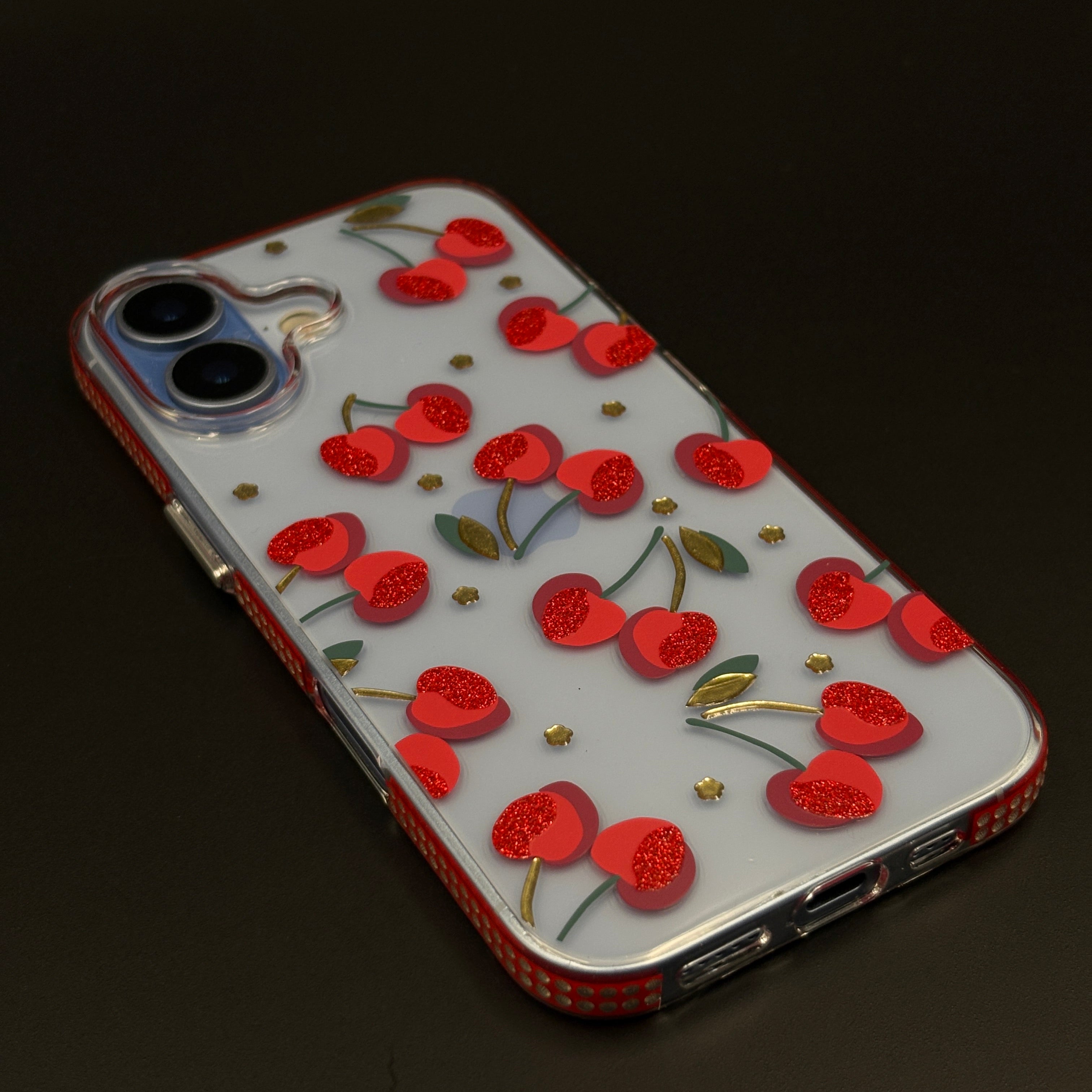 🍒 Cherry Fruit Pattern – Multiple raised cherries with glossy and glitter accents create a cute, eye-catching look that stands out from flat prints.