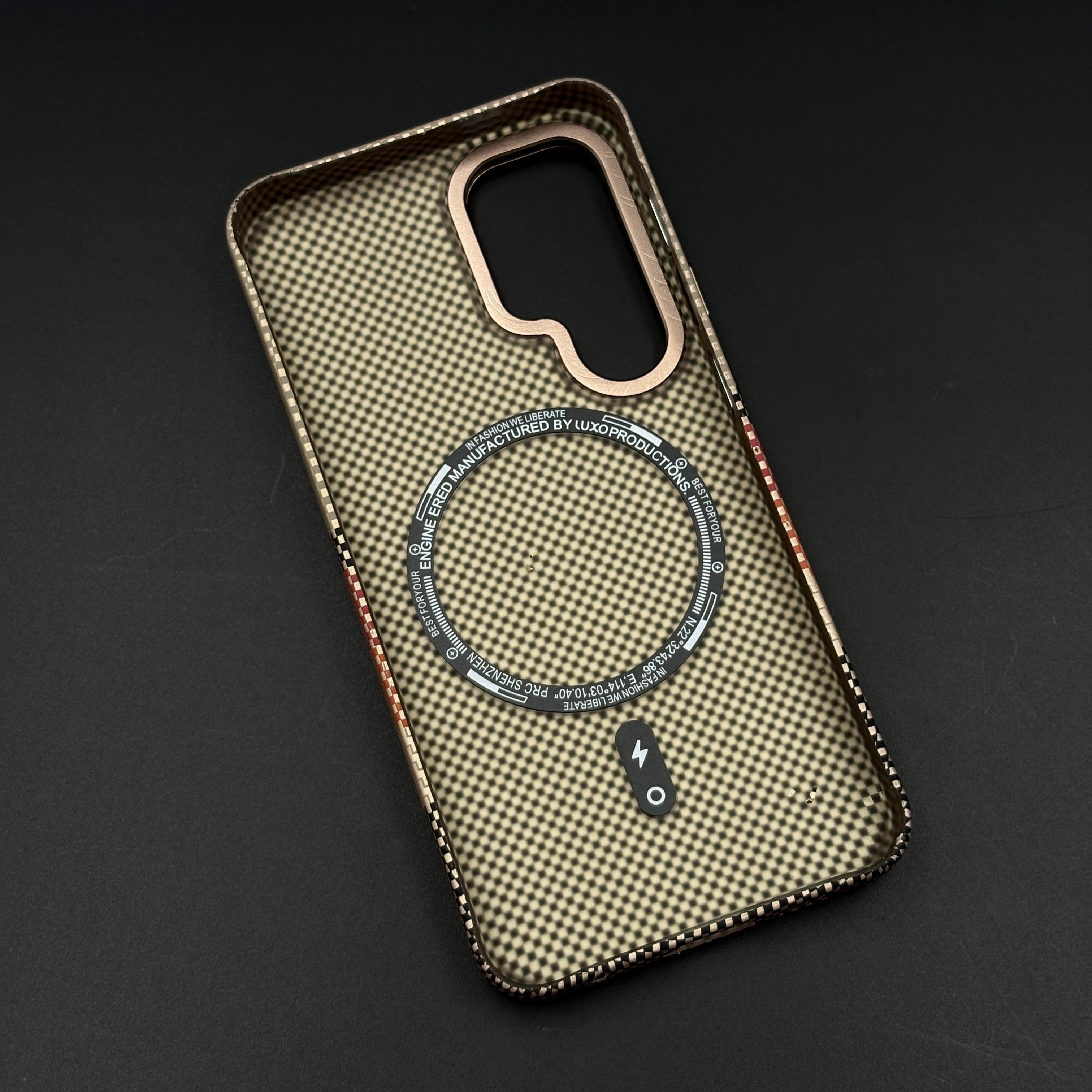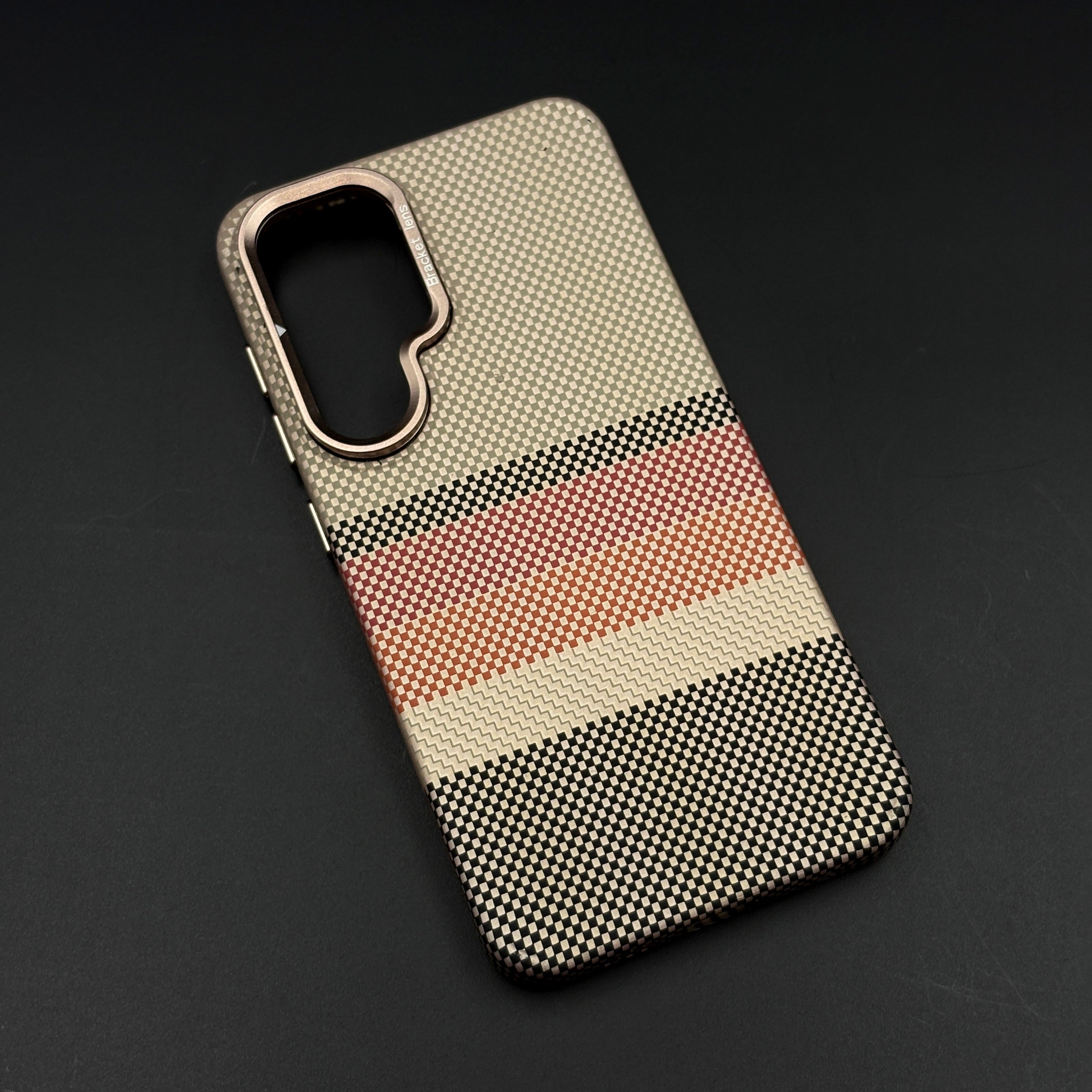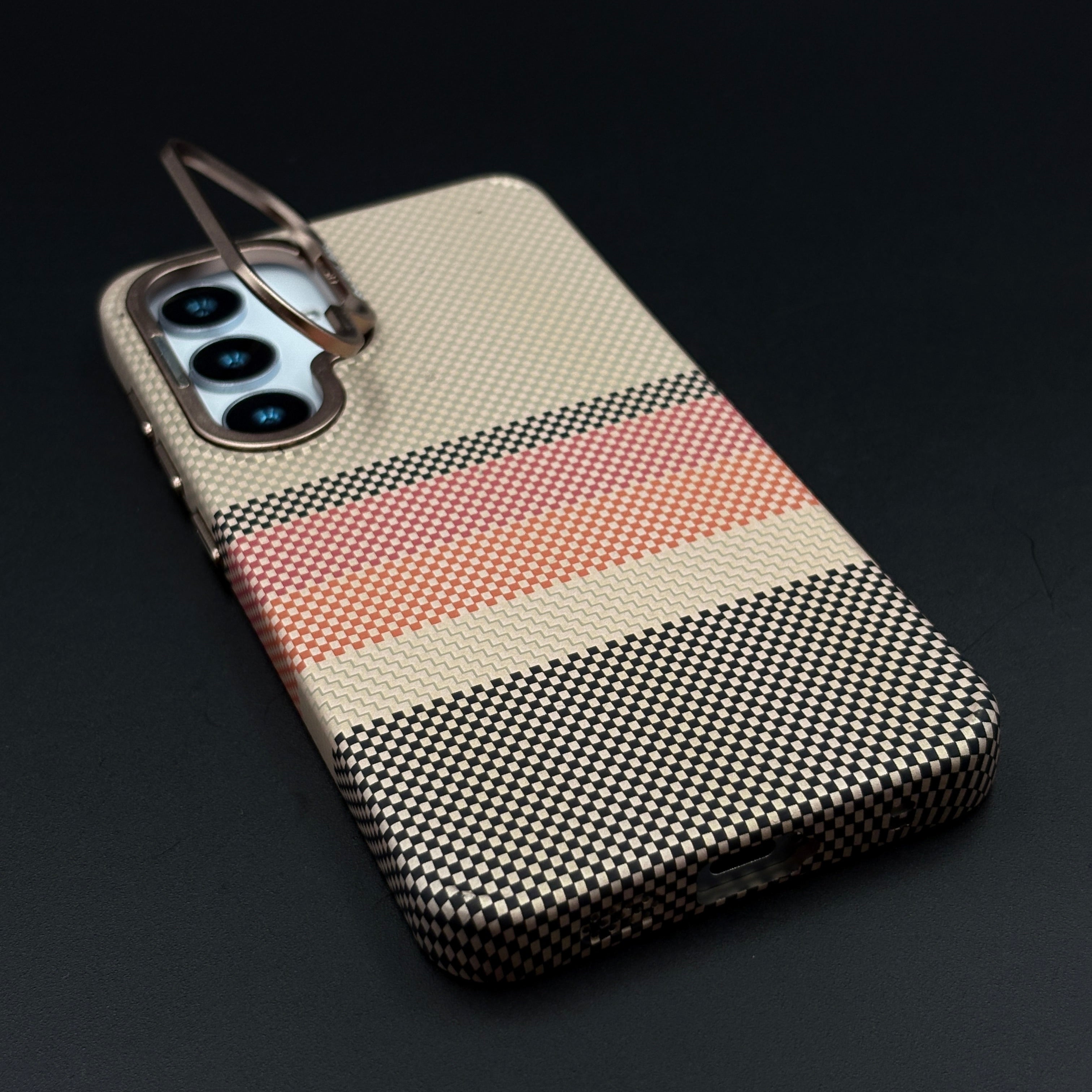 Beige Multi-Stripe Aramid Case with Hidden MagSafe for Samsung Galaxy S24 | Camera Kickstand | Carbon Fibre Feel