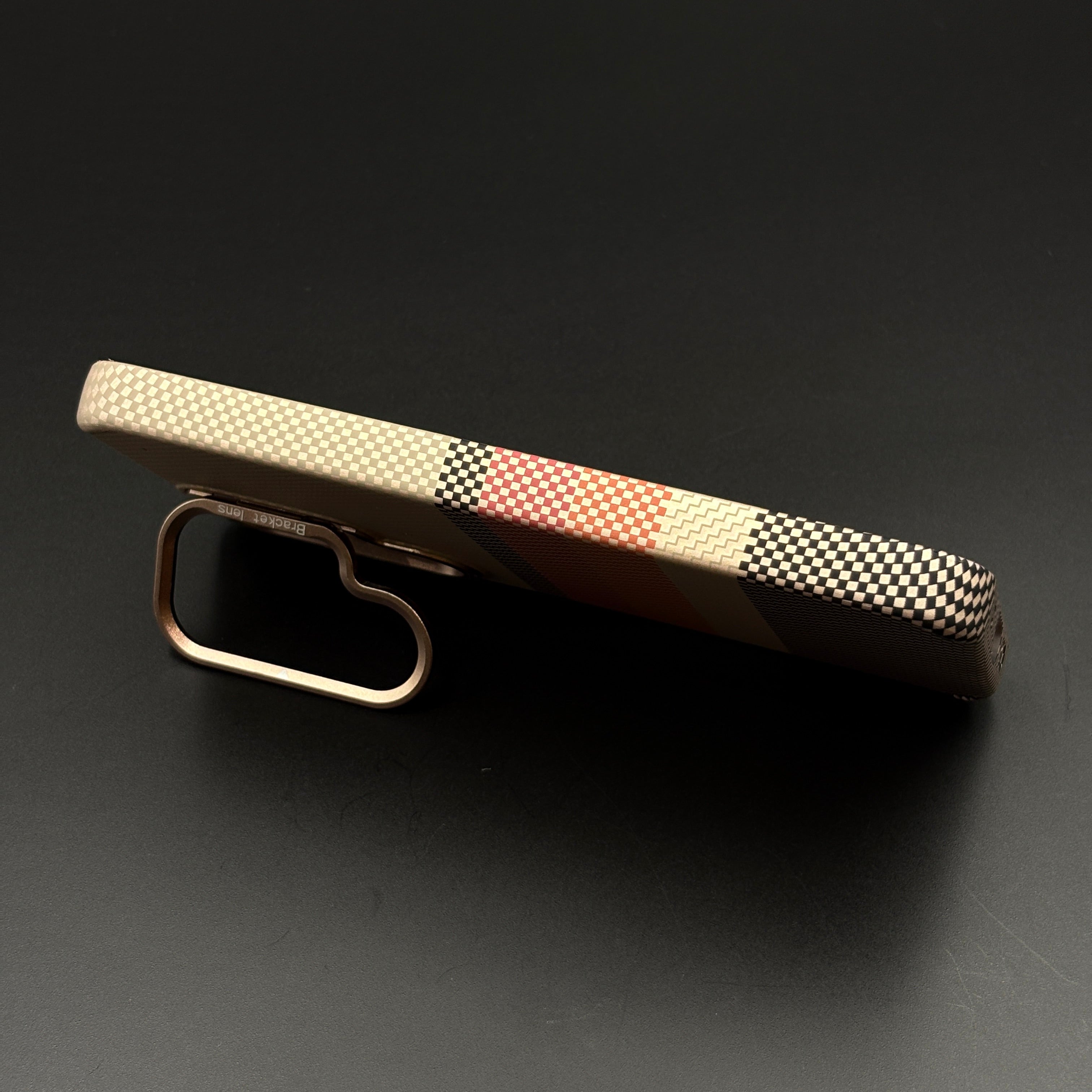 Give your Samsung Galaxy S24 a premium upgrade with this Beige Multi-Stripe Aramid Case, featuring a stylish blend of beige, cream, black, and red stripes over a carbon fibre-inspired texture. With hidden MagSafe capability for seamless wireless charging and a built-in camera kickstand for hands-free convenience, this case blends modern function with designer elegance.