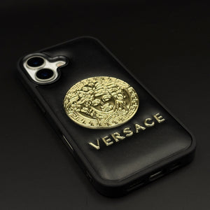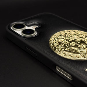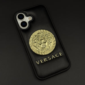 Elevate your iPhone 17 with this bold luxury case featuring a raised signature gold motif on smooth black Cushion. The rich texture and 3D detailing create an iconic, high-end aesthetic that instantly stands out.