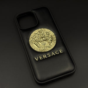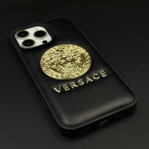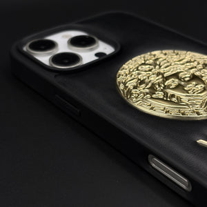 Elevate your iPhone with this bold luxury case featuring a raised signature gold motif on smooth black Cushion. The rich texture and 3D detailing create an iconic, high-end aesthetic that instantly stands out.