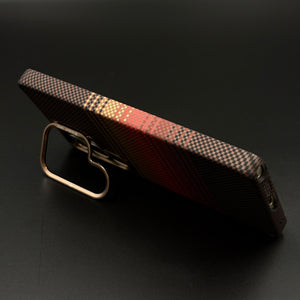 Enhance your Samsung Galaxy S23 Ultra with this Brown Gradient Stripe Aramid Case, offering a sophisticated blend of warm brown, gold, and red stripes over a carbon fibre-inspired texture. Featuring a built-in camera kickstand and hidden MagSafe compatibility, this slim case delivers style, utility, and superior protection for daily use.