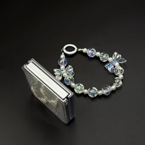 Detachable pearl and iridescent butterfly strap adds convenience and a fashionable touch.