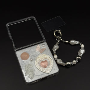Add a touch of elegance to your Galaxy Z Flip 7 with this Butterfly Heart Case featuring a detachable pearl strap. Designed with 3D embossed details, shimmering textures, and luxury charm elements, this case is perfect for those who love both fashion and protection.
