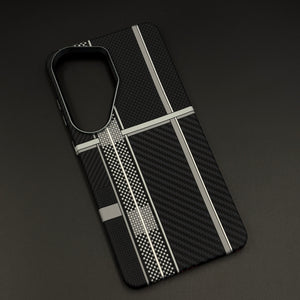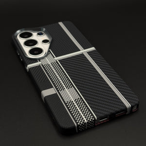 Command understated sophistication with your Samsung Galaxy S26 Ultra using this carbon fibre cross grid hidden MagSafe mobile case cover — a precision-engineered design that layers two distinct carbon fibre textures divided by sharp metallic silver grid lines for a striking, architectural aesthetic.