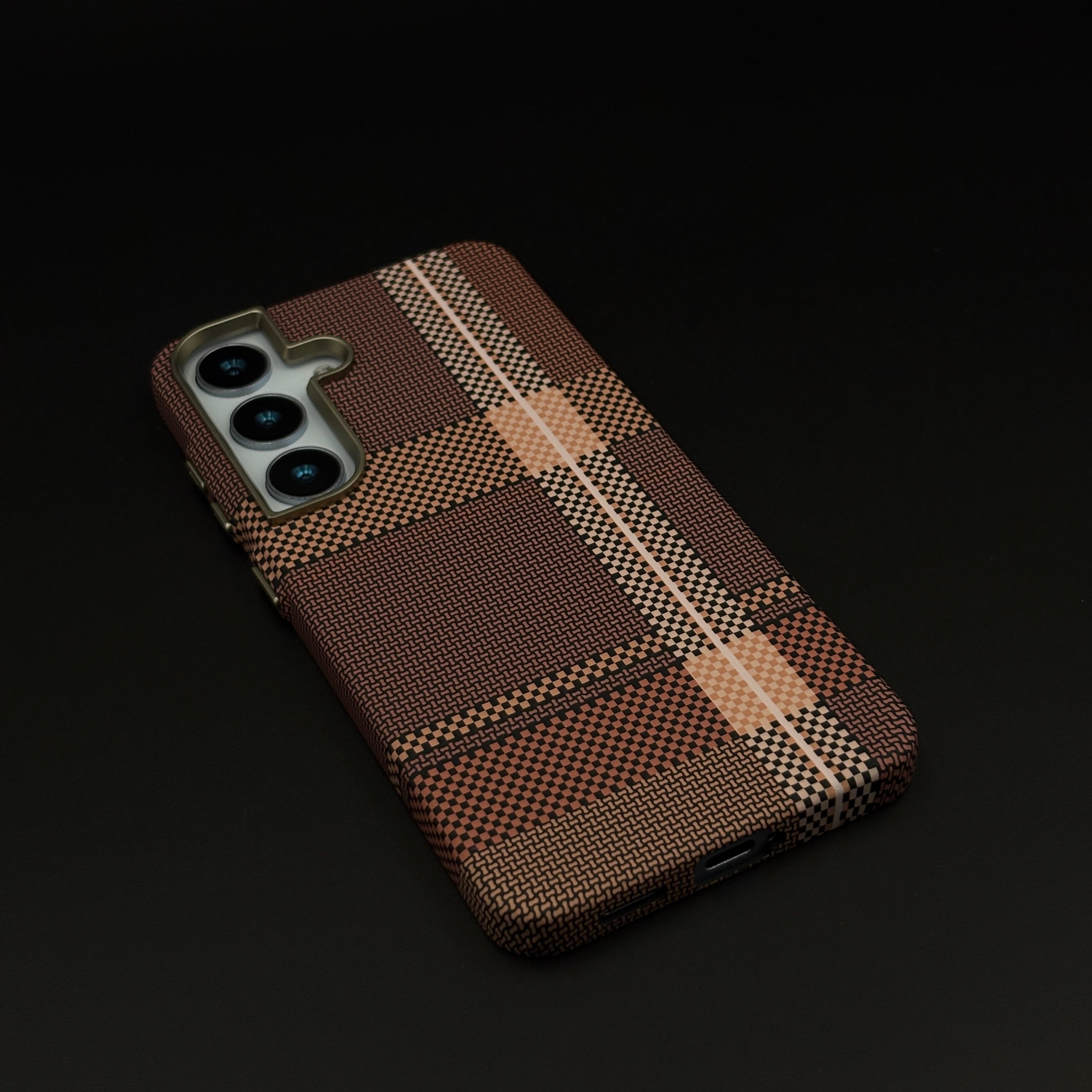 Dress your Galaxy S24 | S25 in refined chestnut plaid—featuring a premium aramid fibre build, genuine carbon fibre texture, and an invisible MagSafe ring for seamless wireless charging and slim protection.