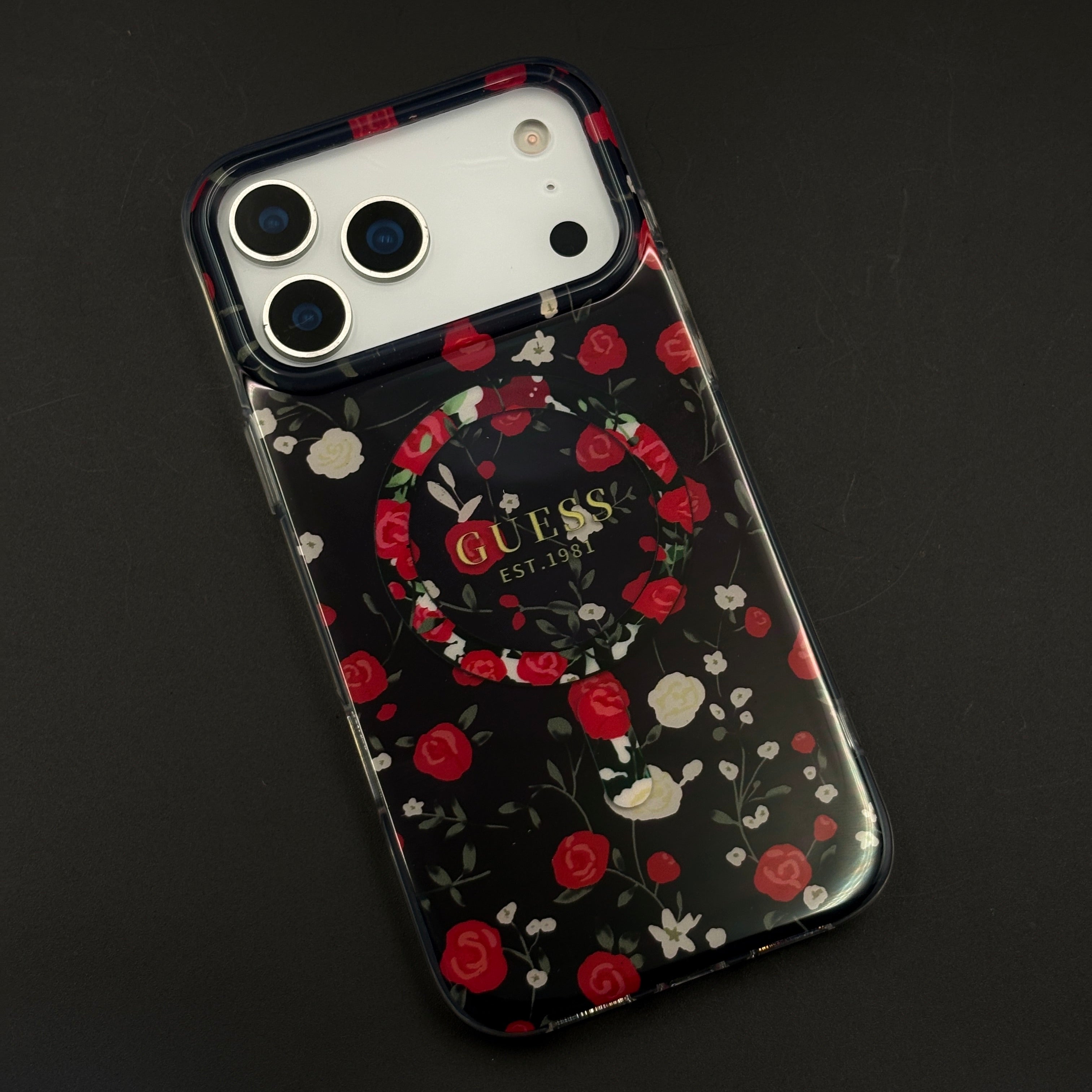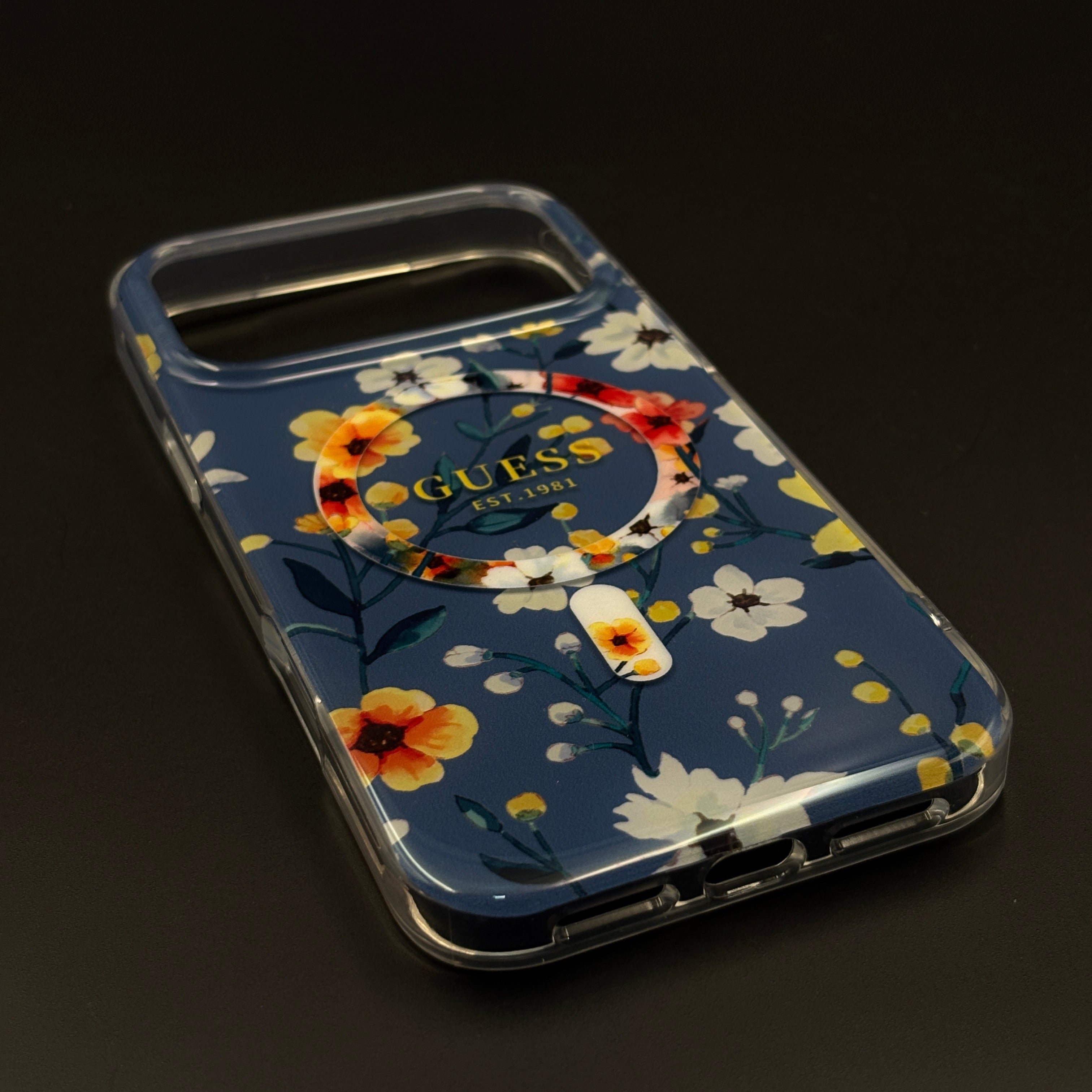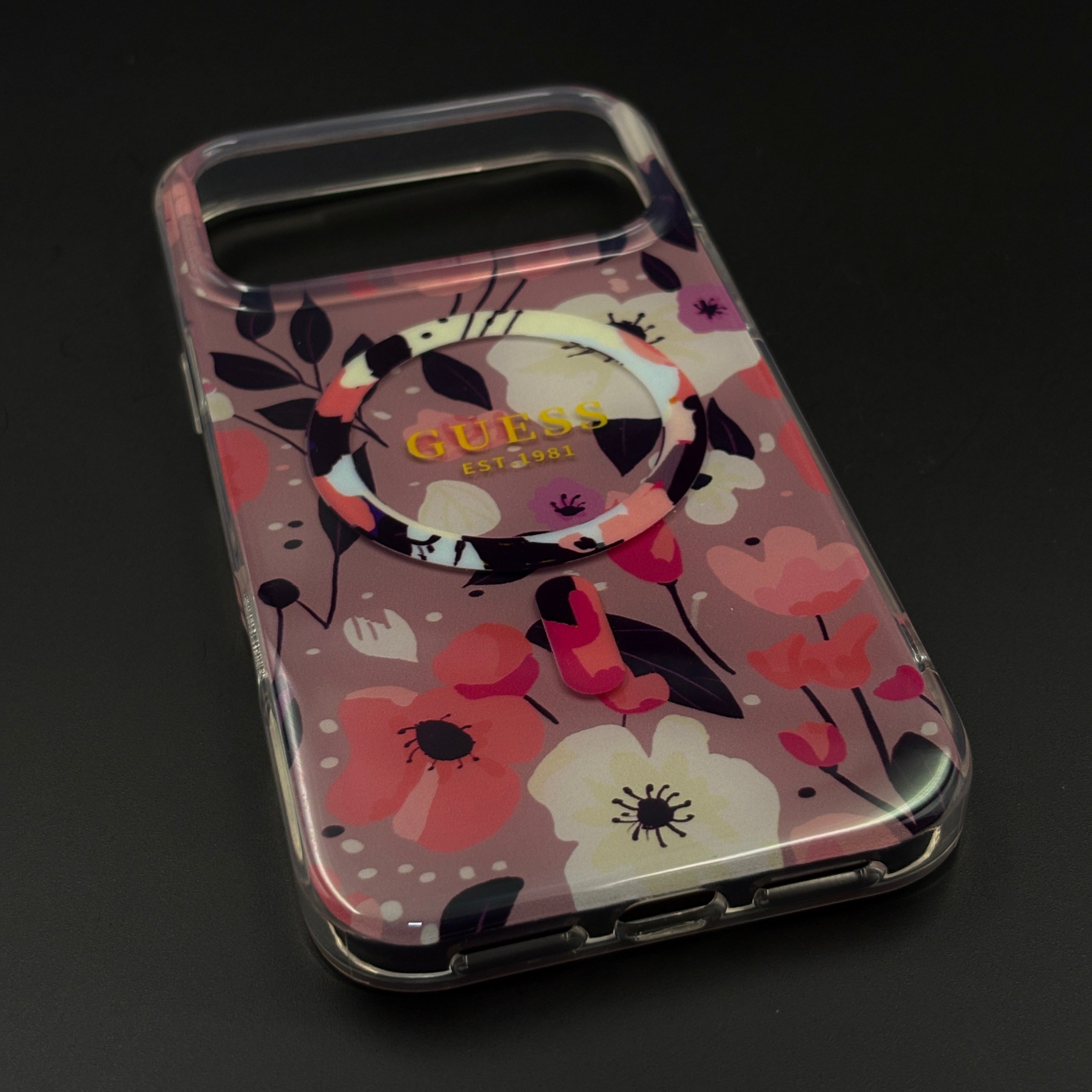 Circular MagSafe-compatible magnetic ring at the centre with a subtle printed label detail for a clean, fashion-forward accent.