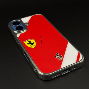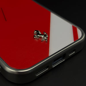 Channel pure racing passion on your iPhone with this FR Horse metal style frame hard case cover — a bold Rosso-inspired design featuring a sleek silver metal-look frame, glossy red back panel, and dual prancing horse emblems that make your phone feel like a piece of paddock‑ready machinery.