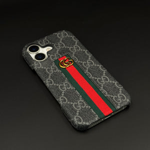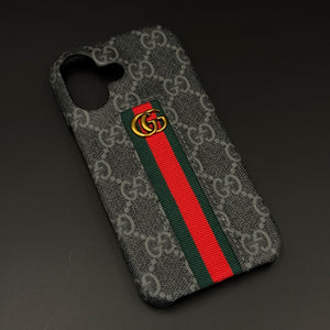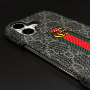 Dress your iPhone 17 in luxury with this GG embossed black case—featuring iconic monogram texturing, a bold green and red center stripe, and gold accent emblem for unmistakable designer flair and reliable daily protection.
