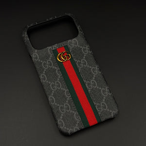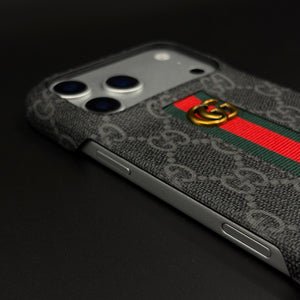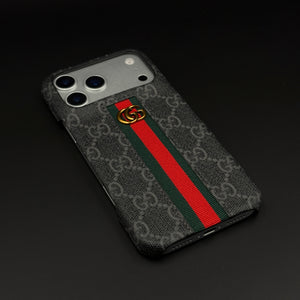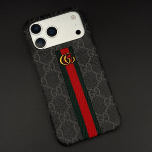 Dress your iPhone 17 series in luxury with this GG embossed black case—featuring iconic monogram texturing, a bold green and red center stripe, and gold accent emblem for unmistakable designer flair and reliable daily protection.