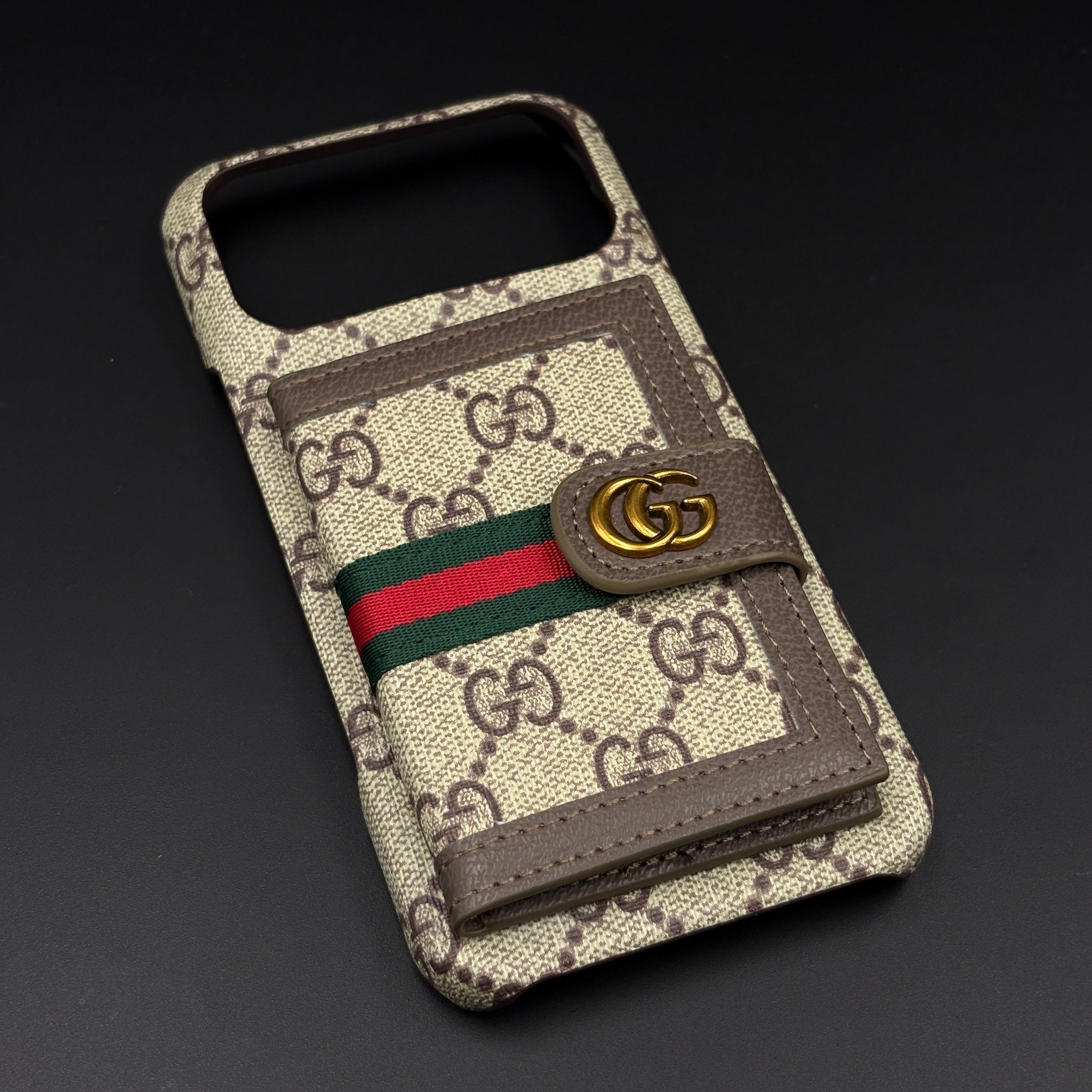 Showcase timeless designer style with this GG Monogram Cardholder Case for iPhone 17 Series—featuring premium canvas with an iconic double-G motif, a classic green-red stripe, and a gold tone emblem card slot for fashion and function.
