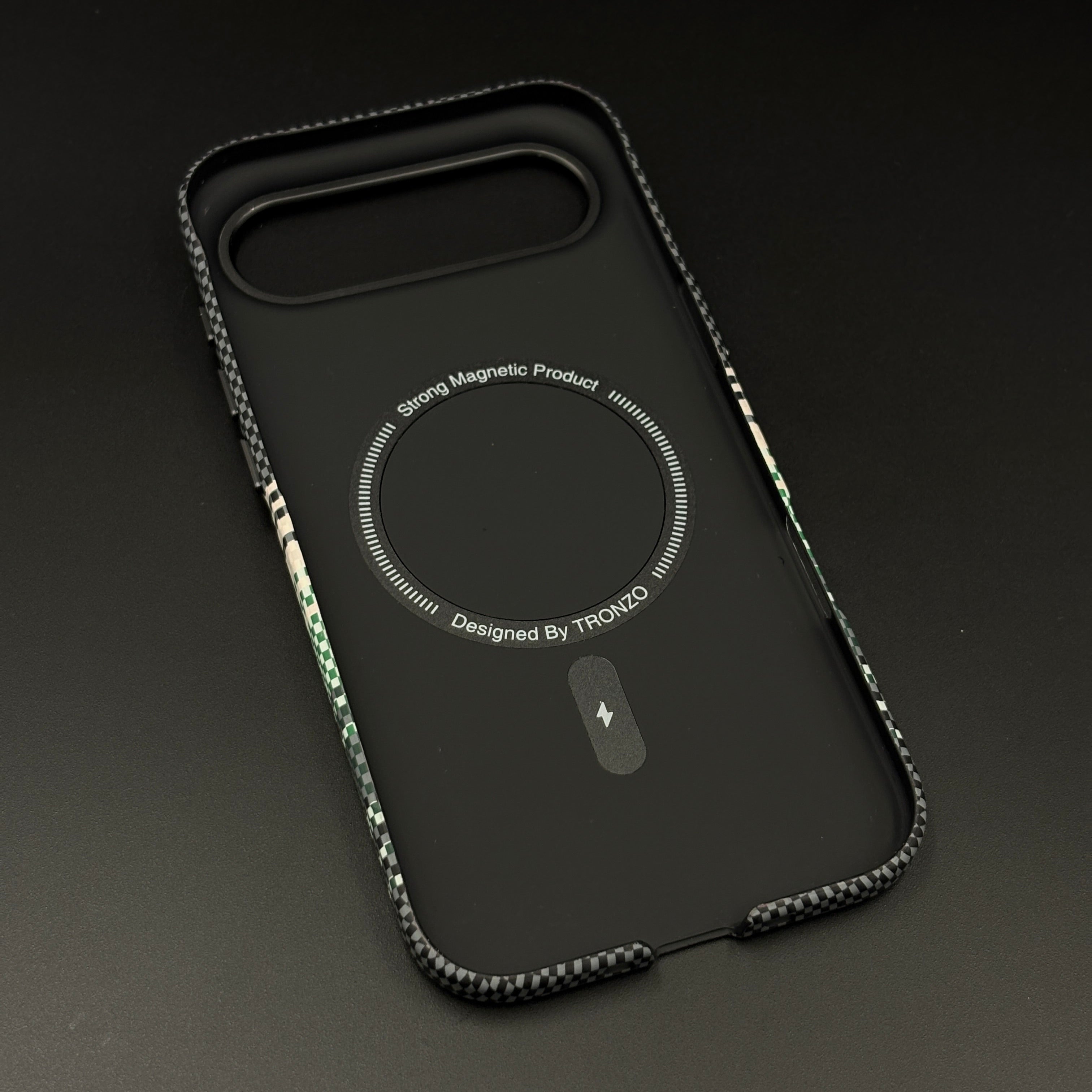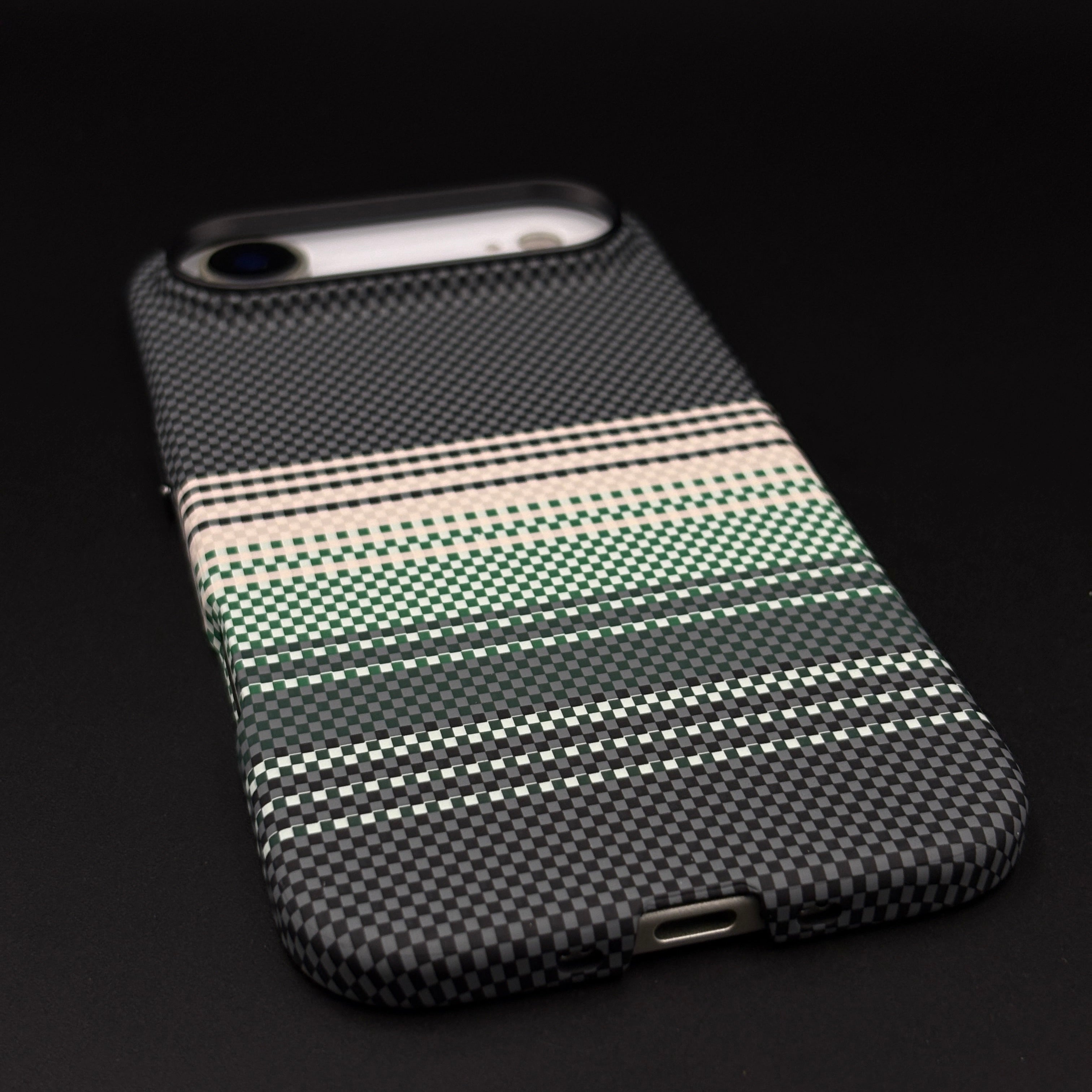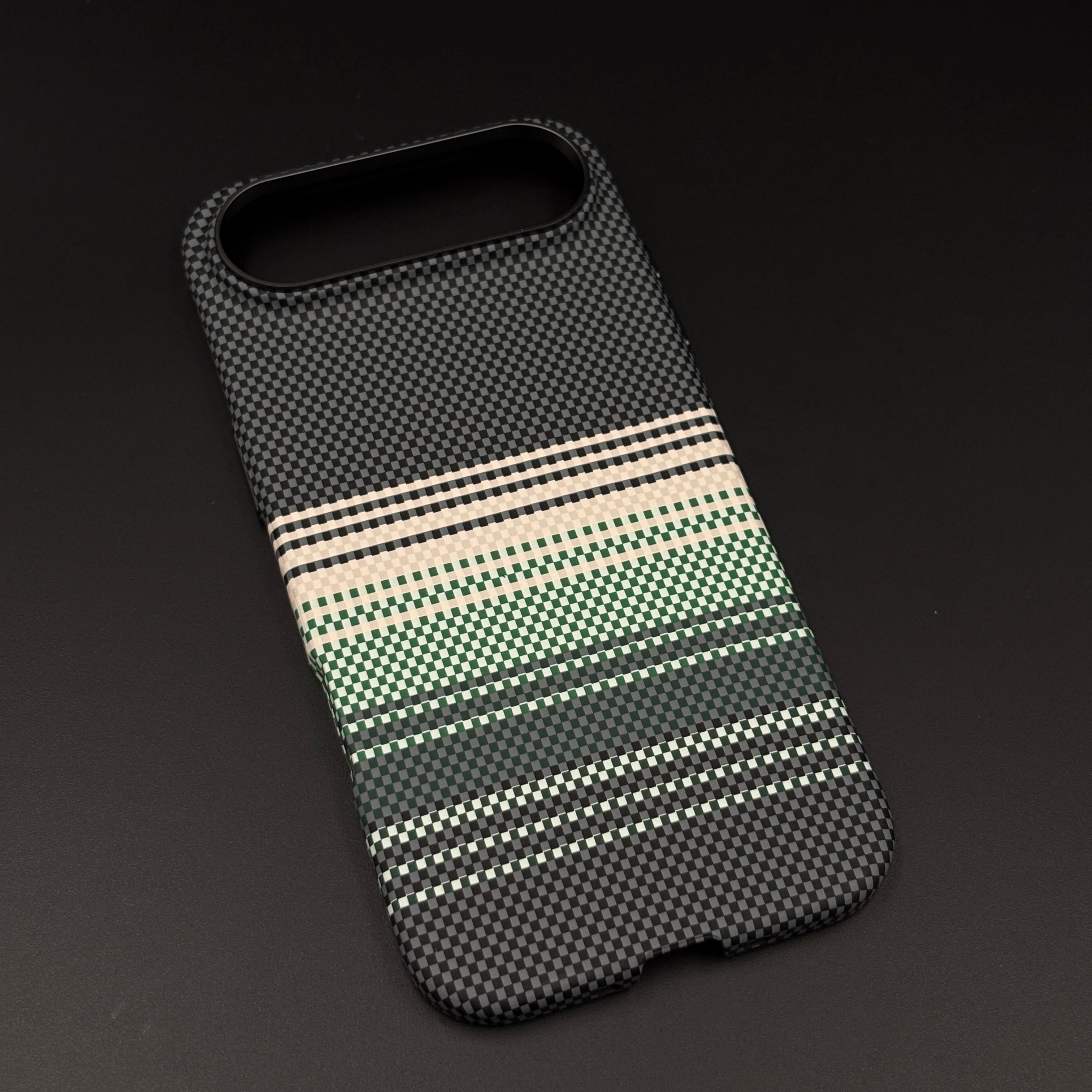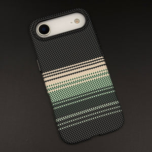 Elevate your iPhone 17 Air with this contemporary case—featuring a woven carbon fiber texture base with bold horizontal green, black, and cream stripes for a unique, sporty premium aesthetic