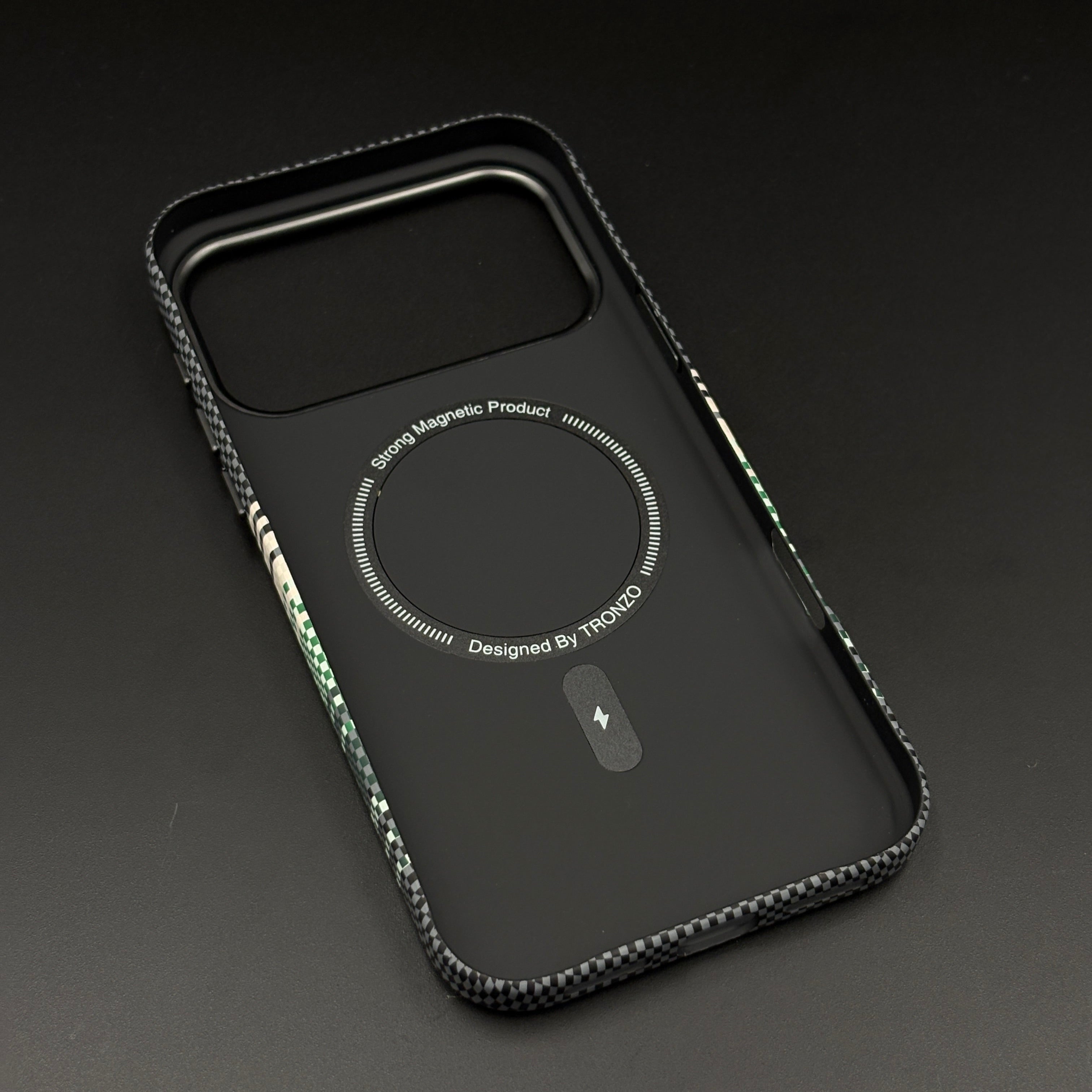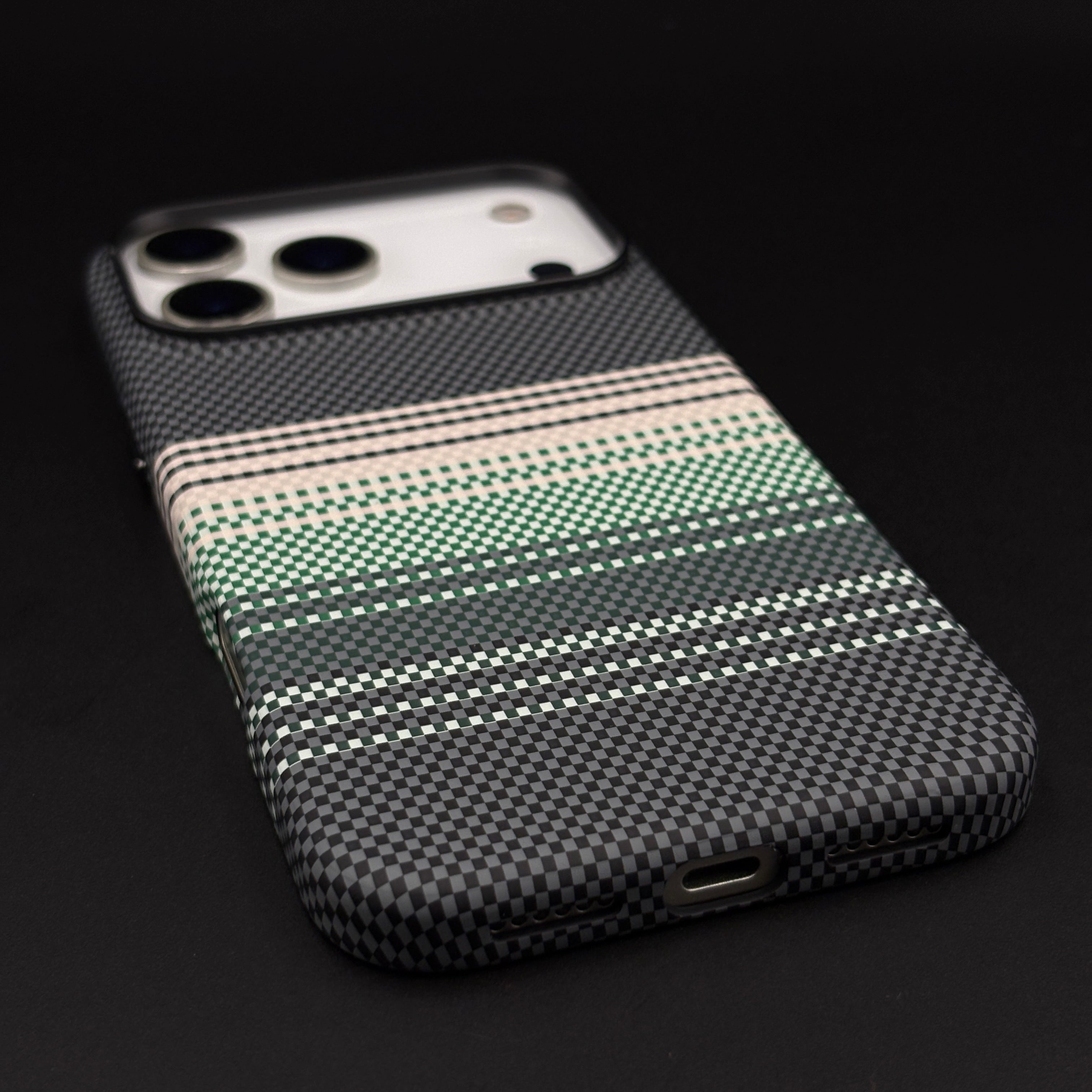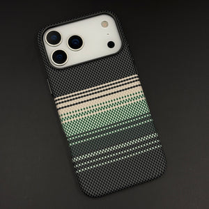 Green White Striped Premium Mobile Case Cover for iPhone 17 Series | Rare Aramid Texture Finish | Real Carbon Fibre Feel | Hidden MagSafe