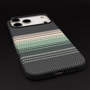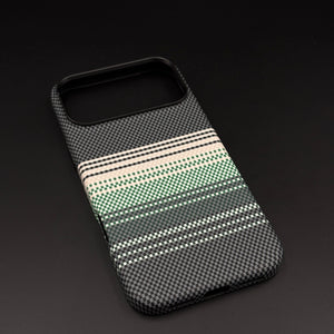 Elevate your iPhone 17 Series with this contemporary case—featuring a woven carbon fiber texture base with bold horizontal green, black, and cream stripes for a unique, sporty premium aesthetic