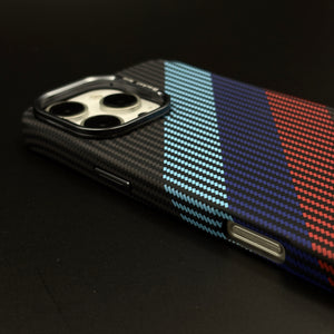 Experience advanced protection and dynamic style with this iPhone Aramid Texture Case, combining a carbon fibre feel, triple stripe color, and hidden MagSafe compatibility. The integrated camera kickstand makes hands-free usage a breeze, while the durable aramid material delivers lightweight strength and race-inspired texture.
