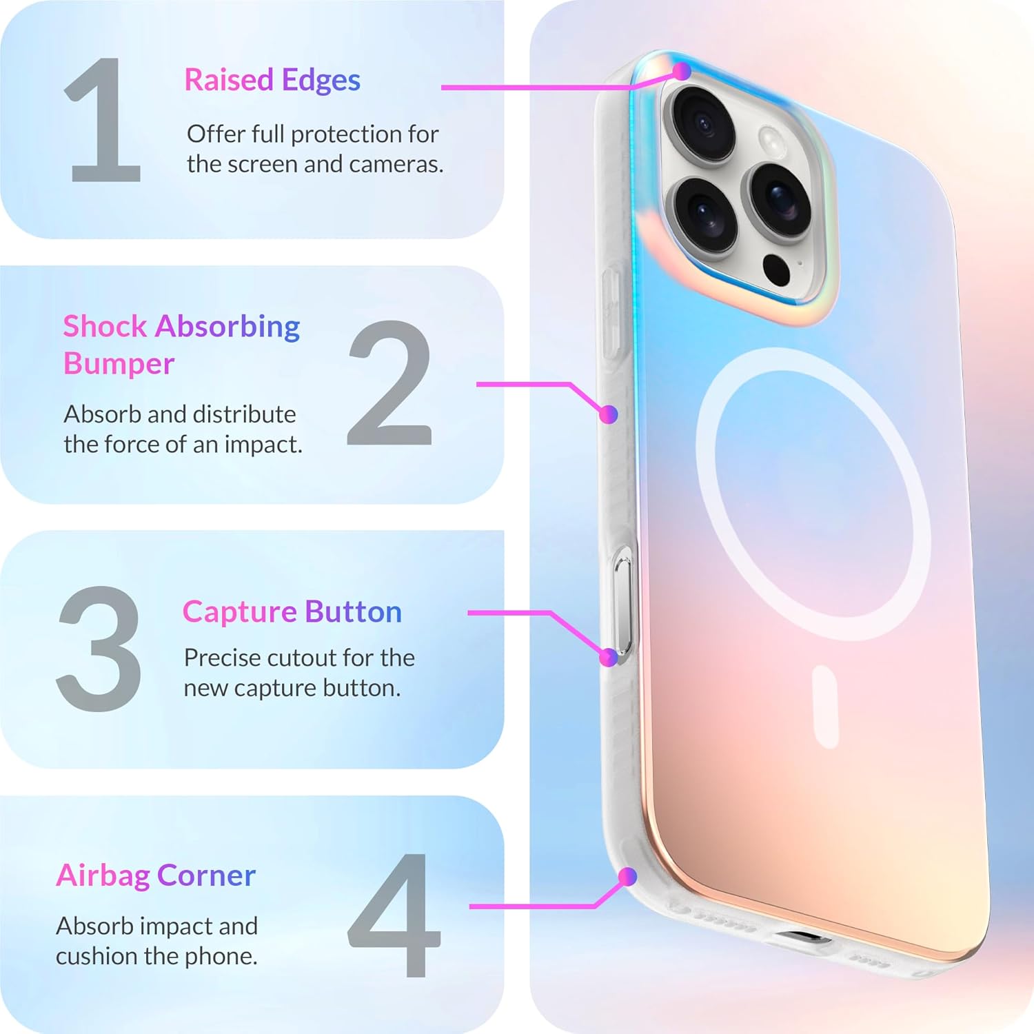 - Vibrant Color Dynamics: Iridescent phone case features a unique color change effect that shifts with different angles and light, your phone will showcase a vibrant and ever-changing display of hues.