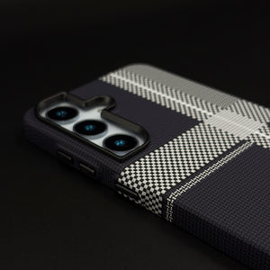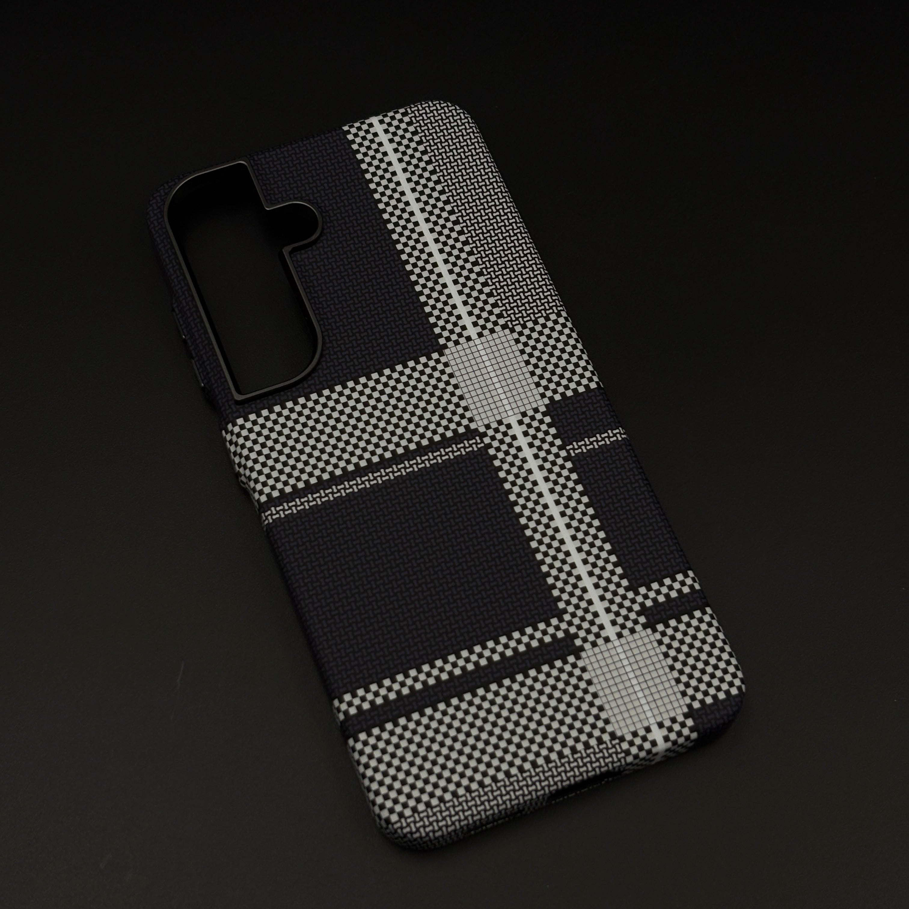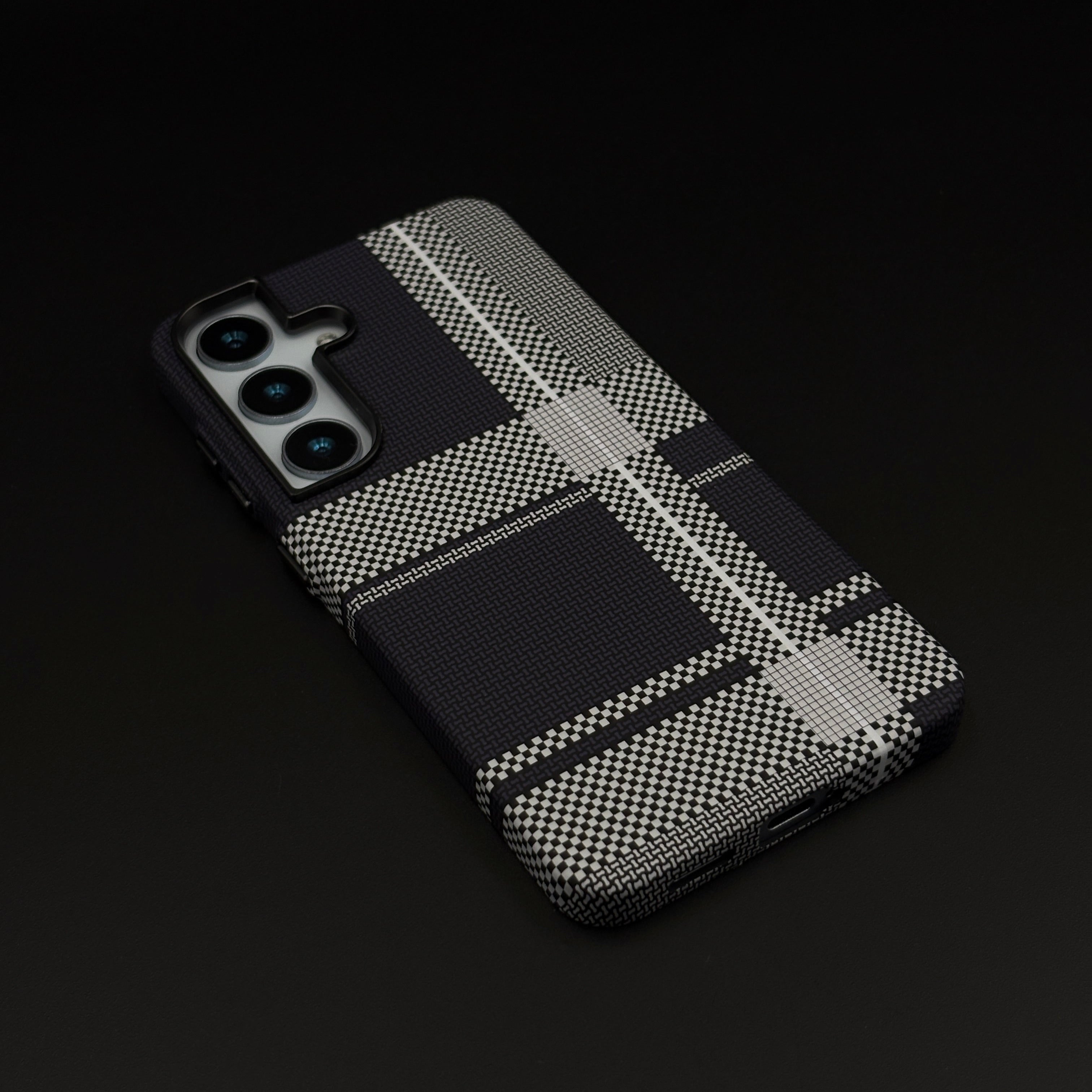 Elevate your Samsung Galaxy S24 | S25 with this ivory plaid aramid case—featuring a rare carbon fibre texture finish, premium grid design, and an invisible MagSafe ring for seamless wireless charging in a true luxury shell.