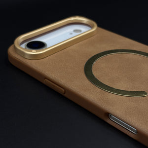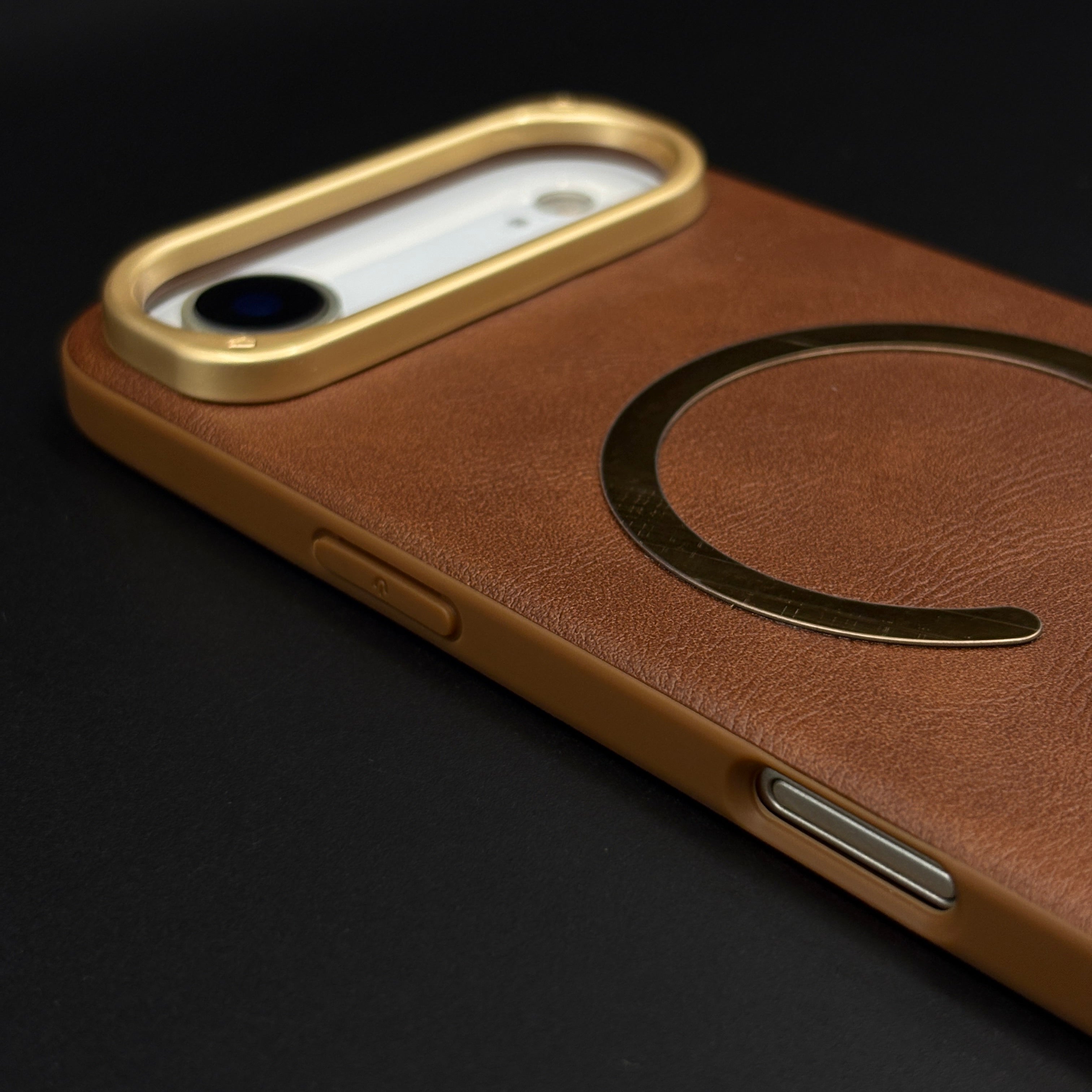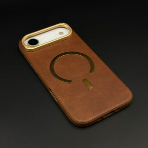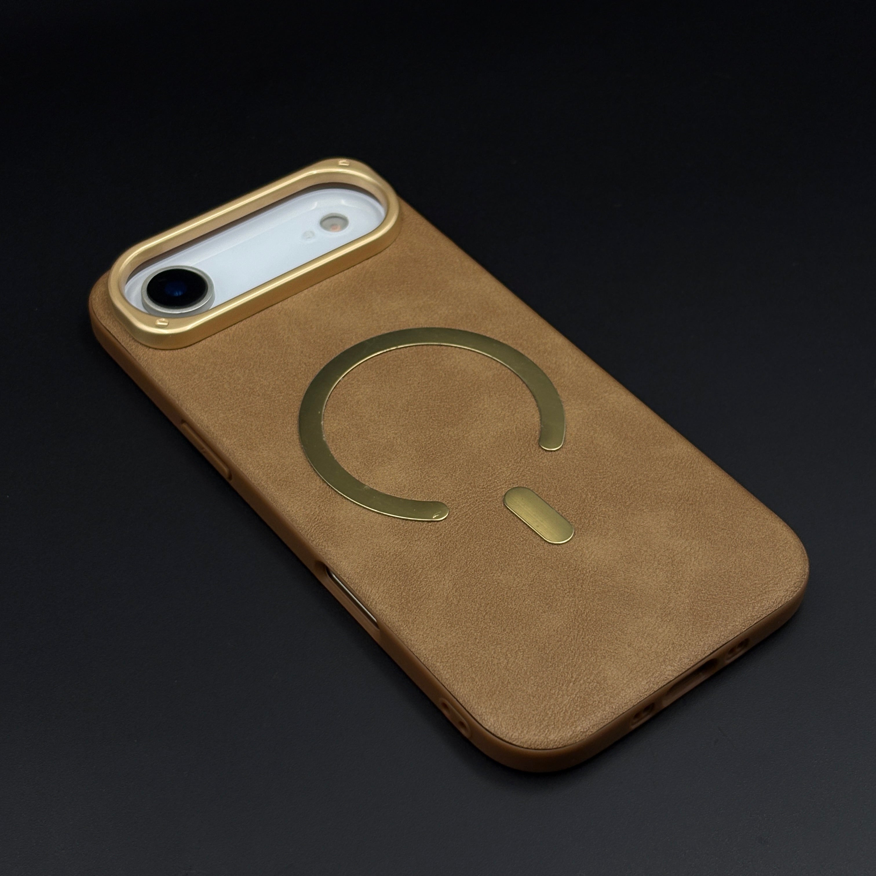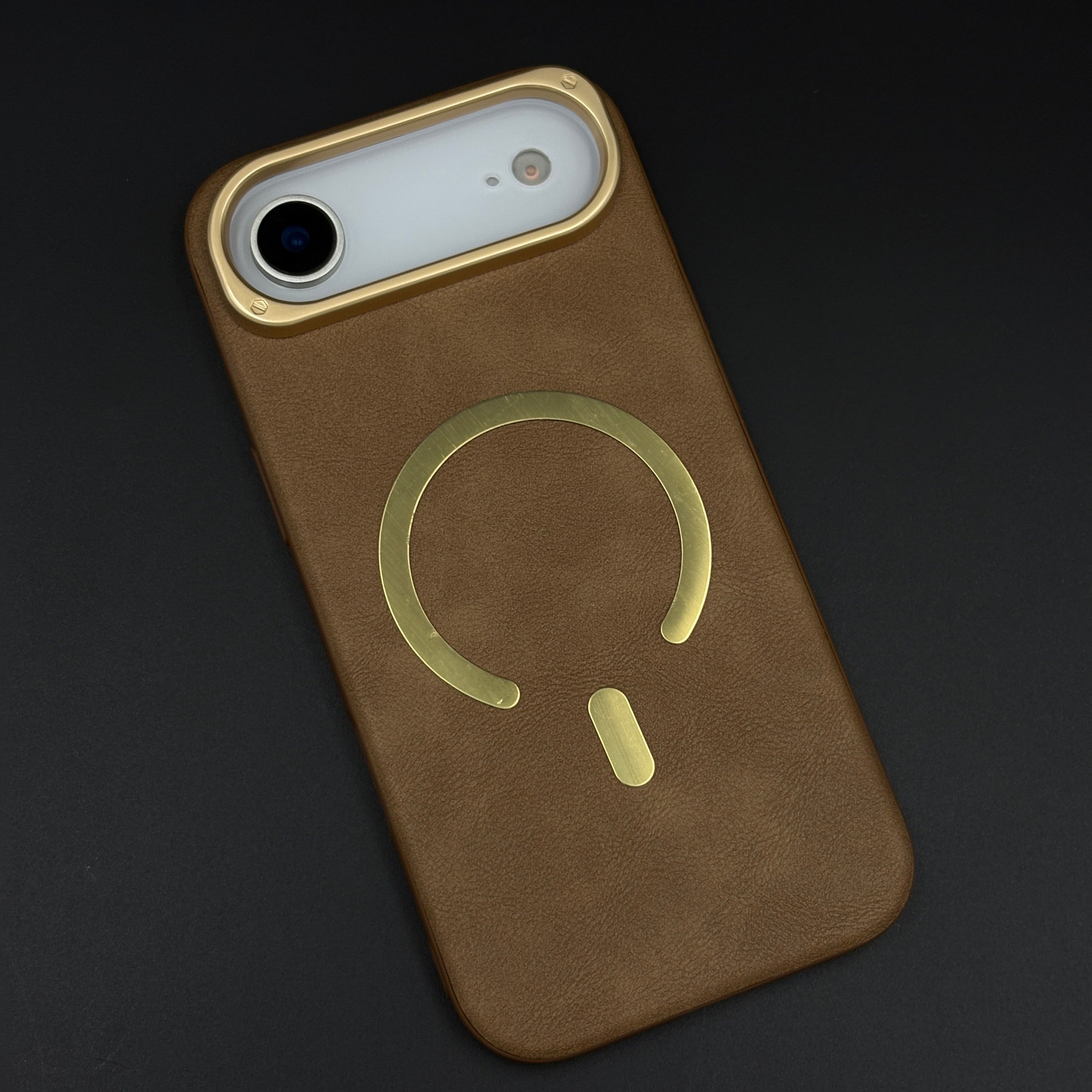 Protect your iPhone 17 Air with this leather MagSafe case, featuring a soft-touch leather finish, integrated magnetic ring for fast wireless charging, and raised gold-tone camera bezel for everyday scratch and drop protection.