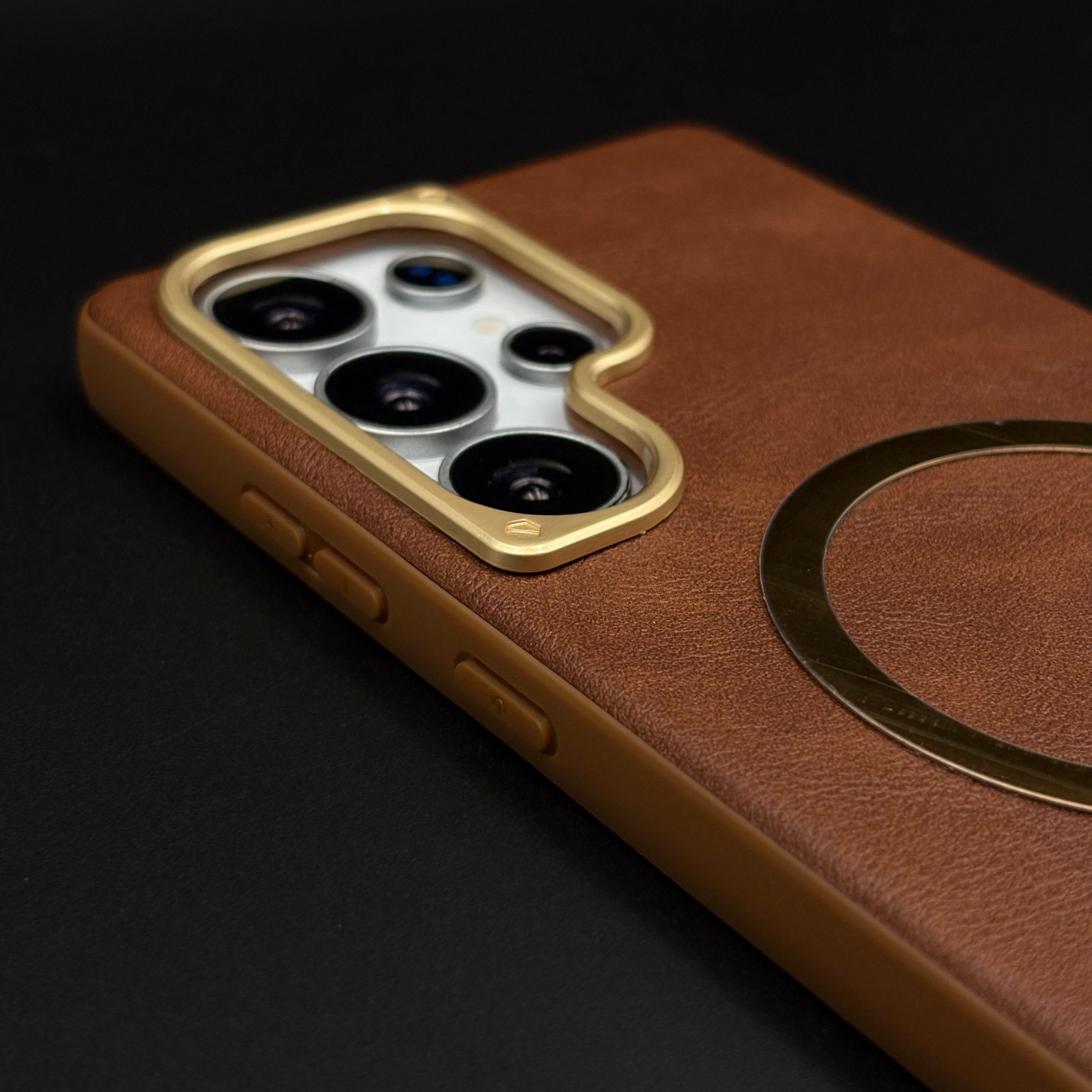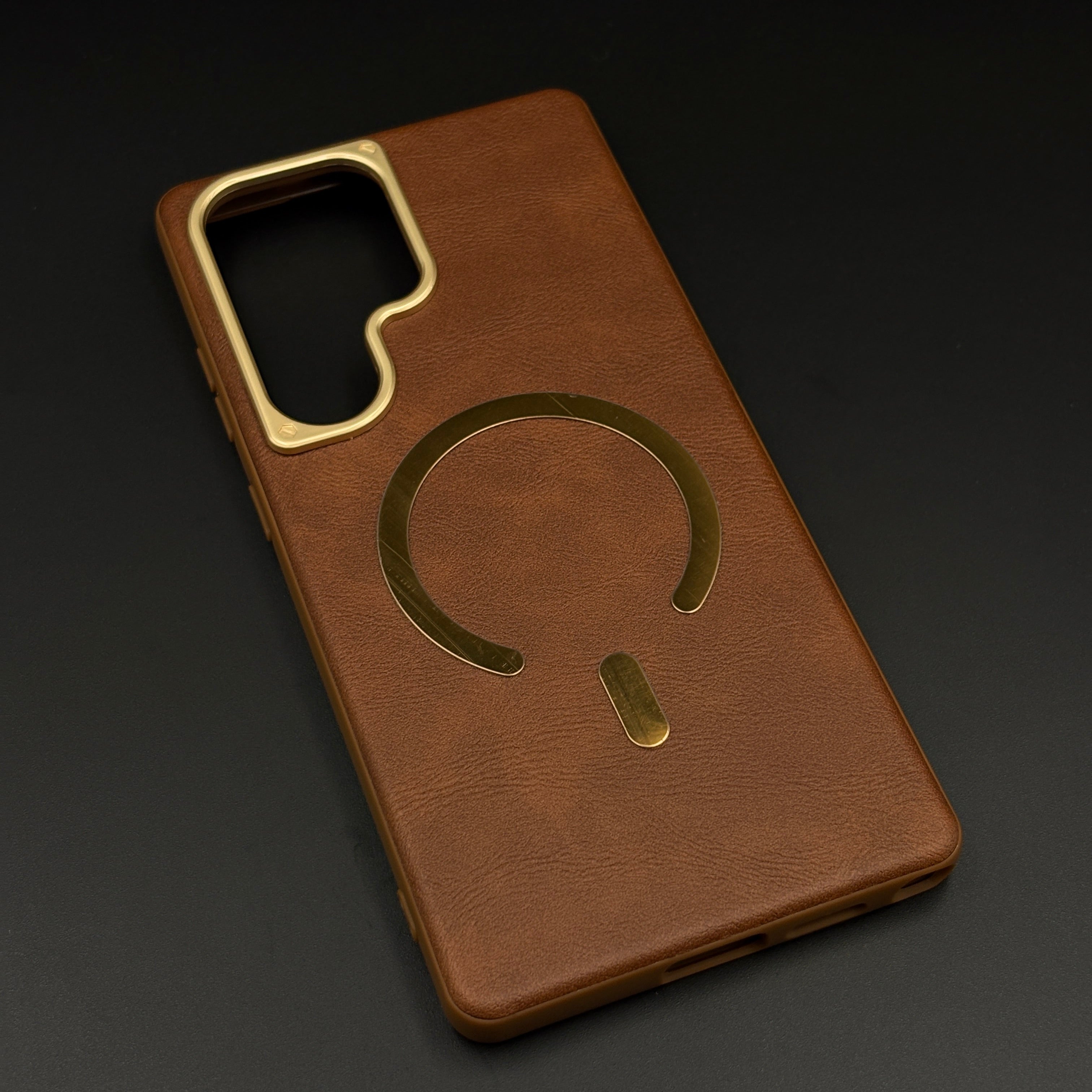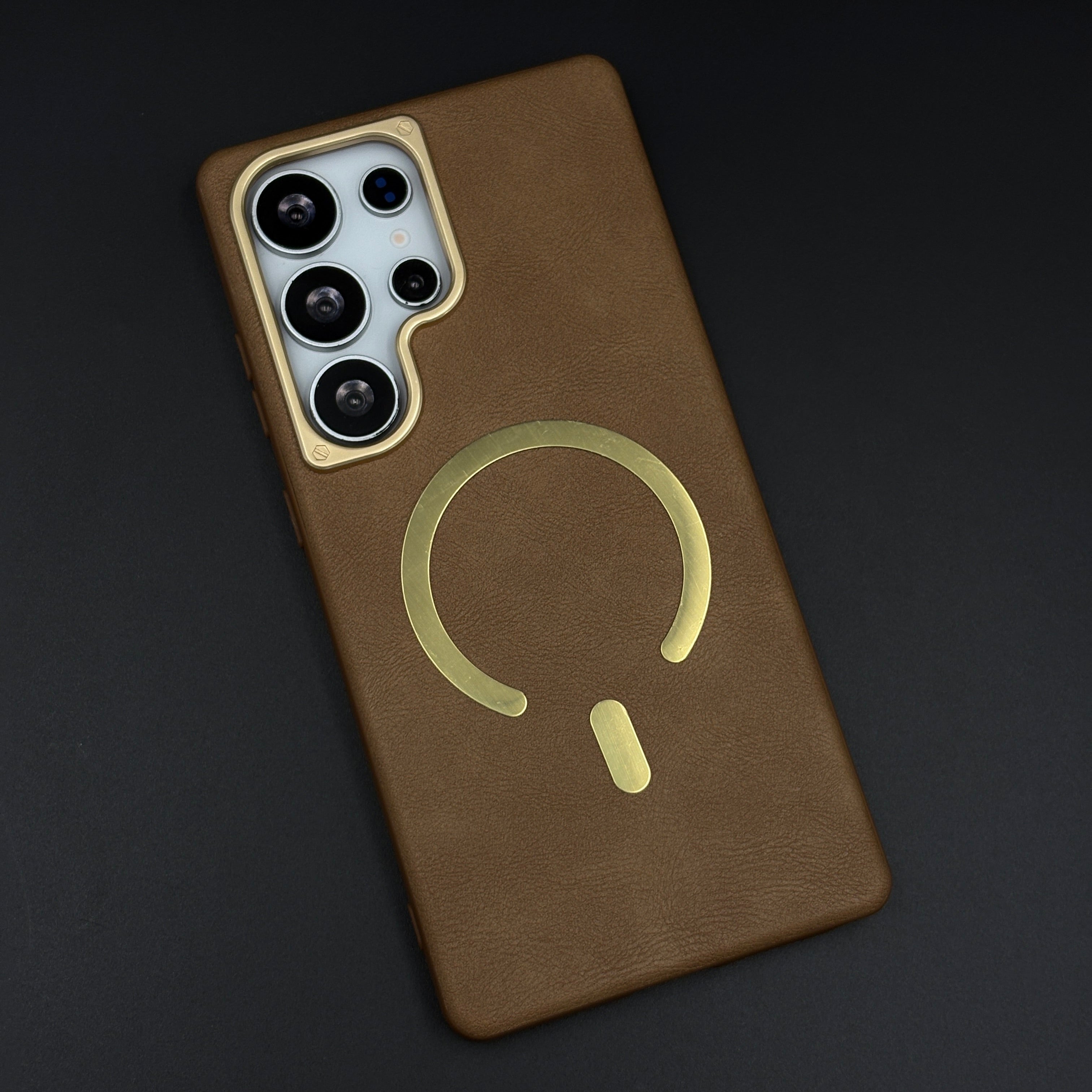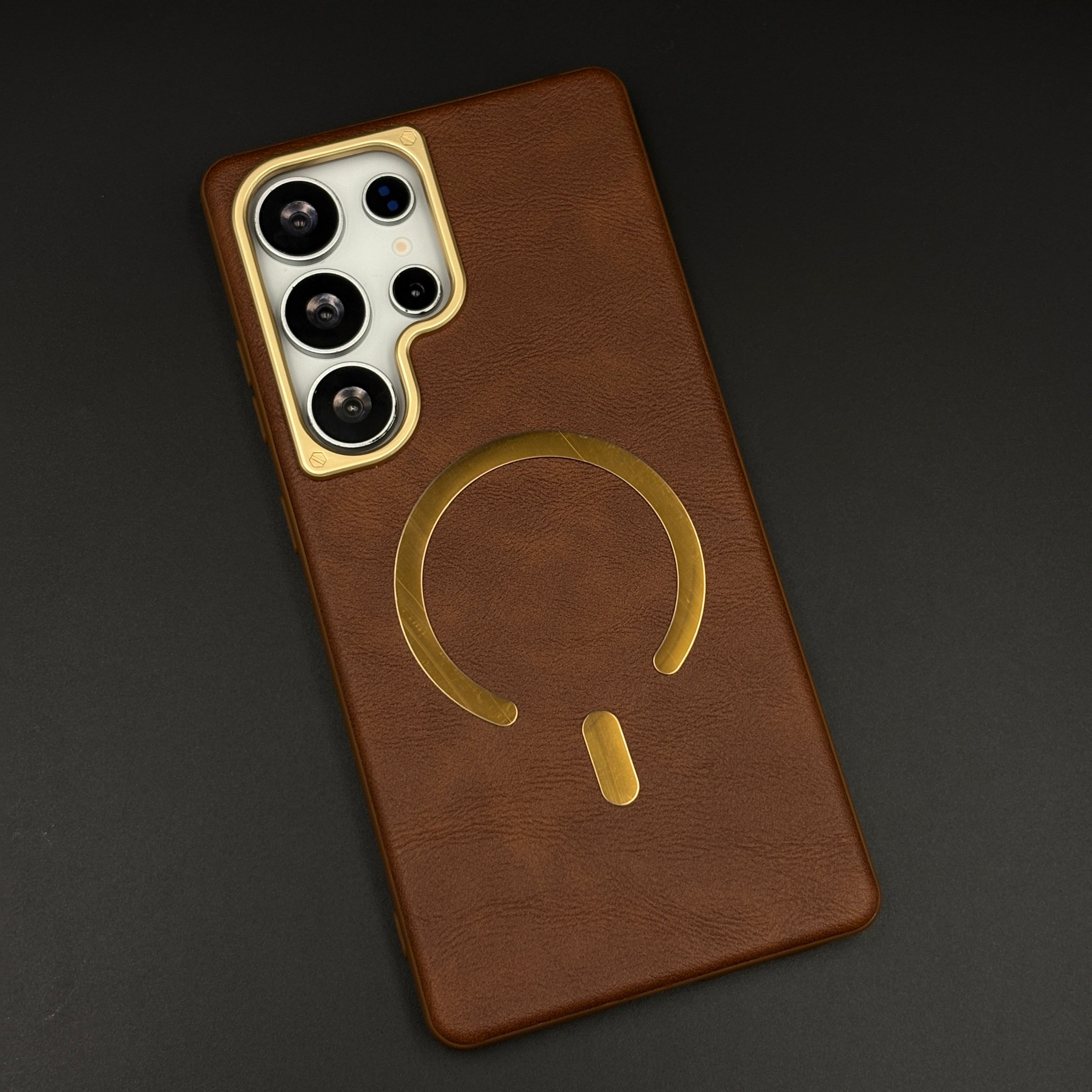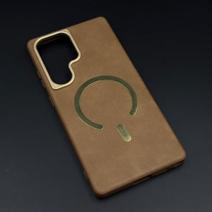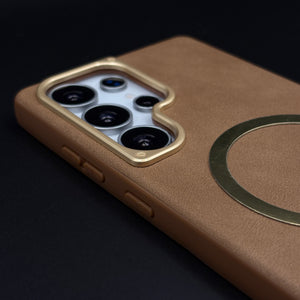 Protect your Samsung Galaxy S25 Ultra with this leather MagSafe case, featuring a soft-touch leather finish, integrated magnetic ring for fast wireless charging, and raised gold-tone camera bezel for everyday scratch and drop protection.