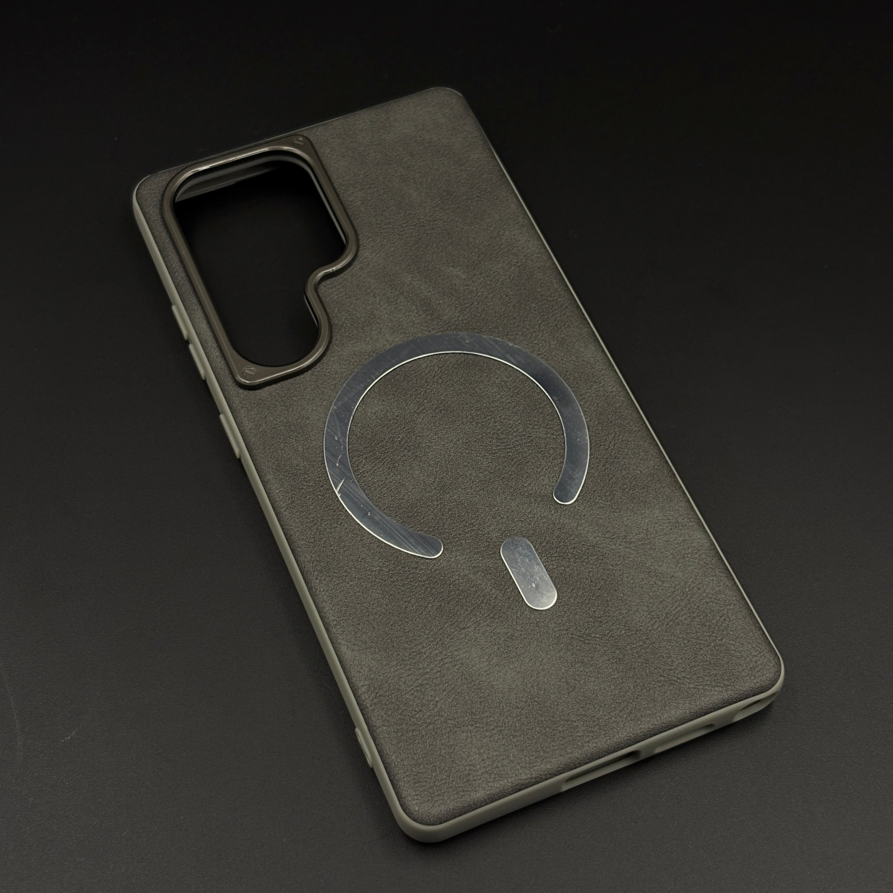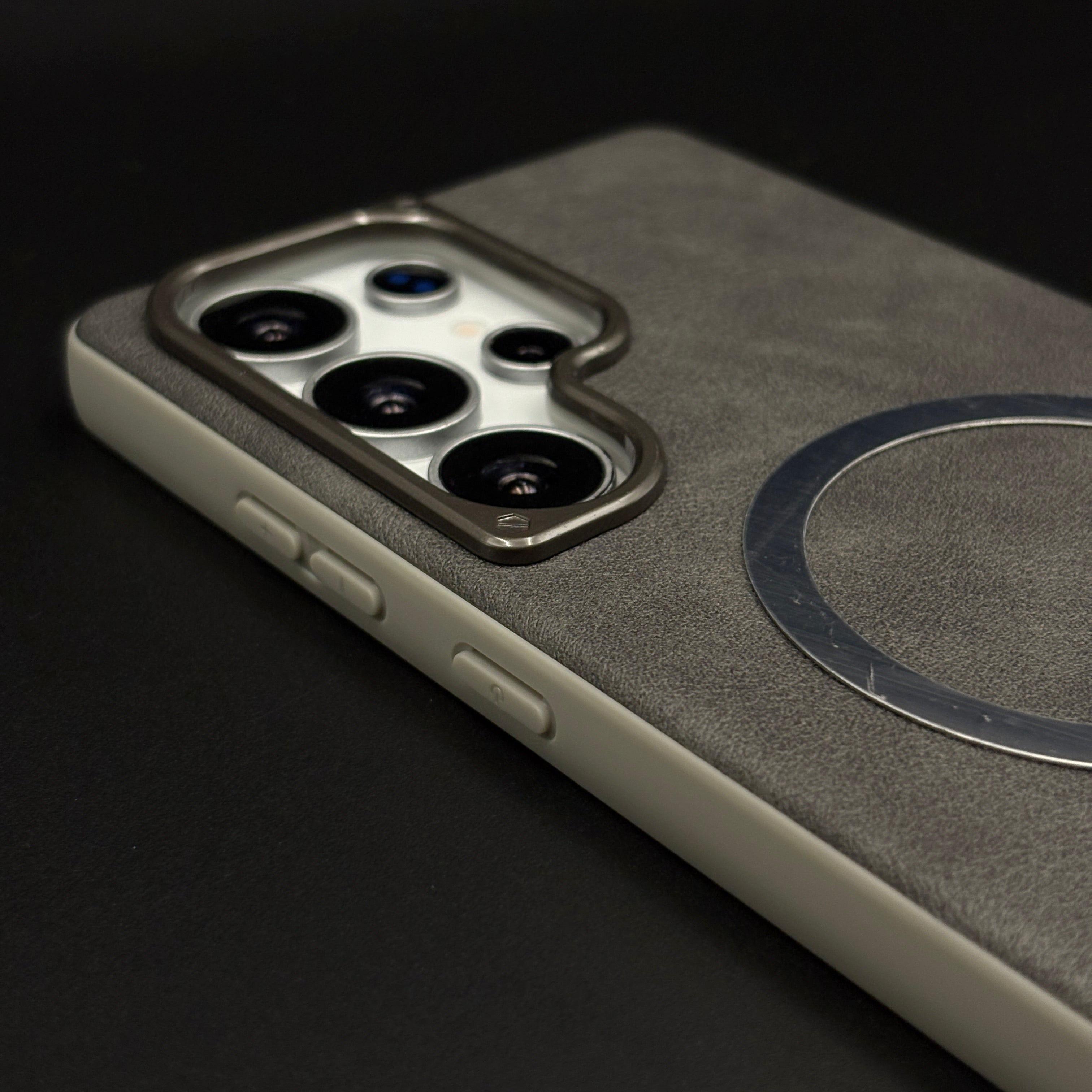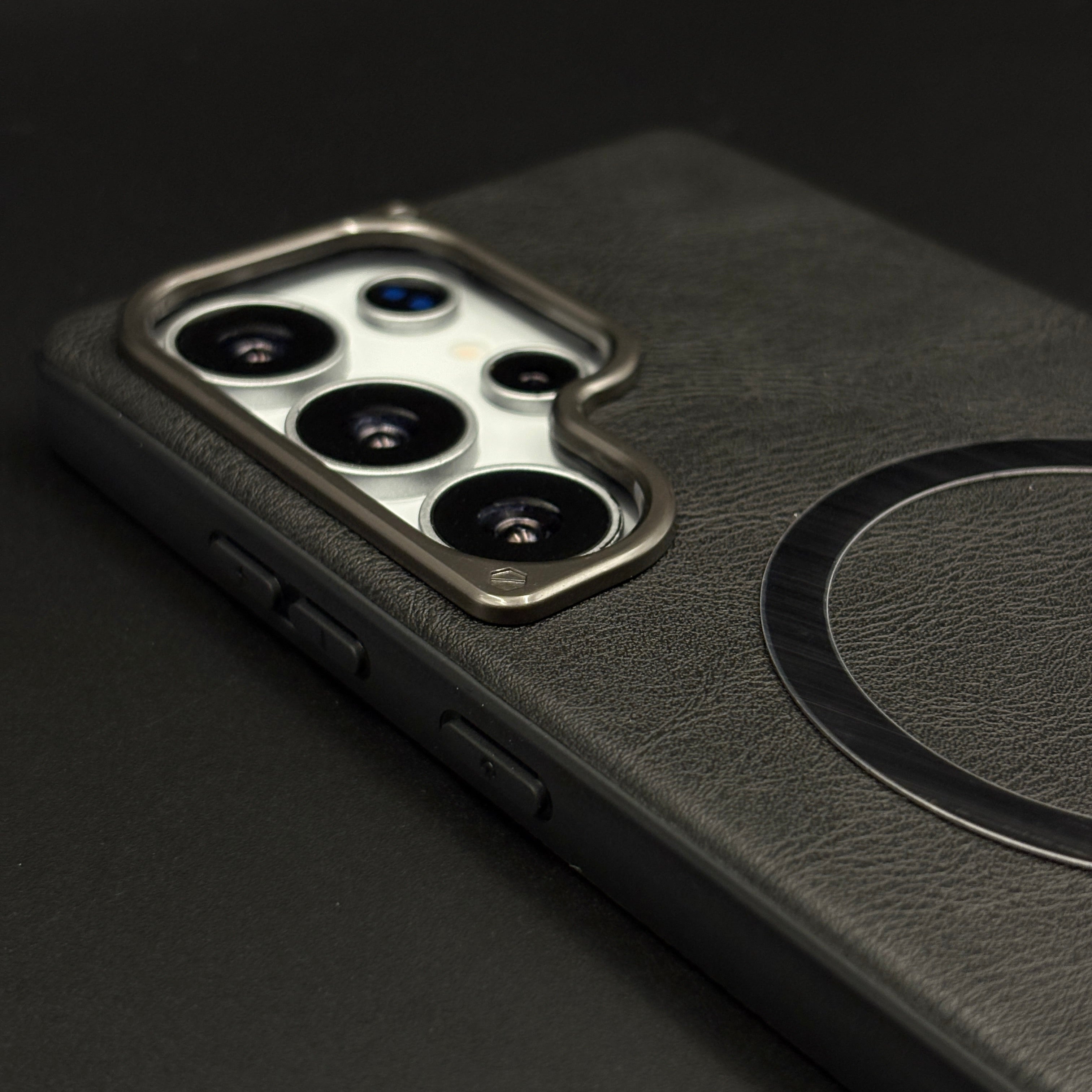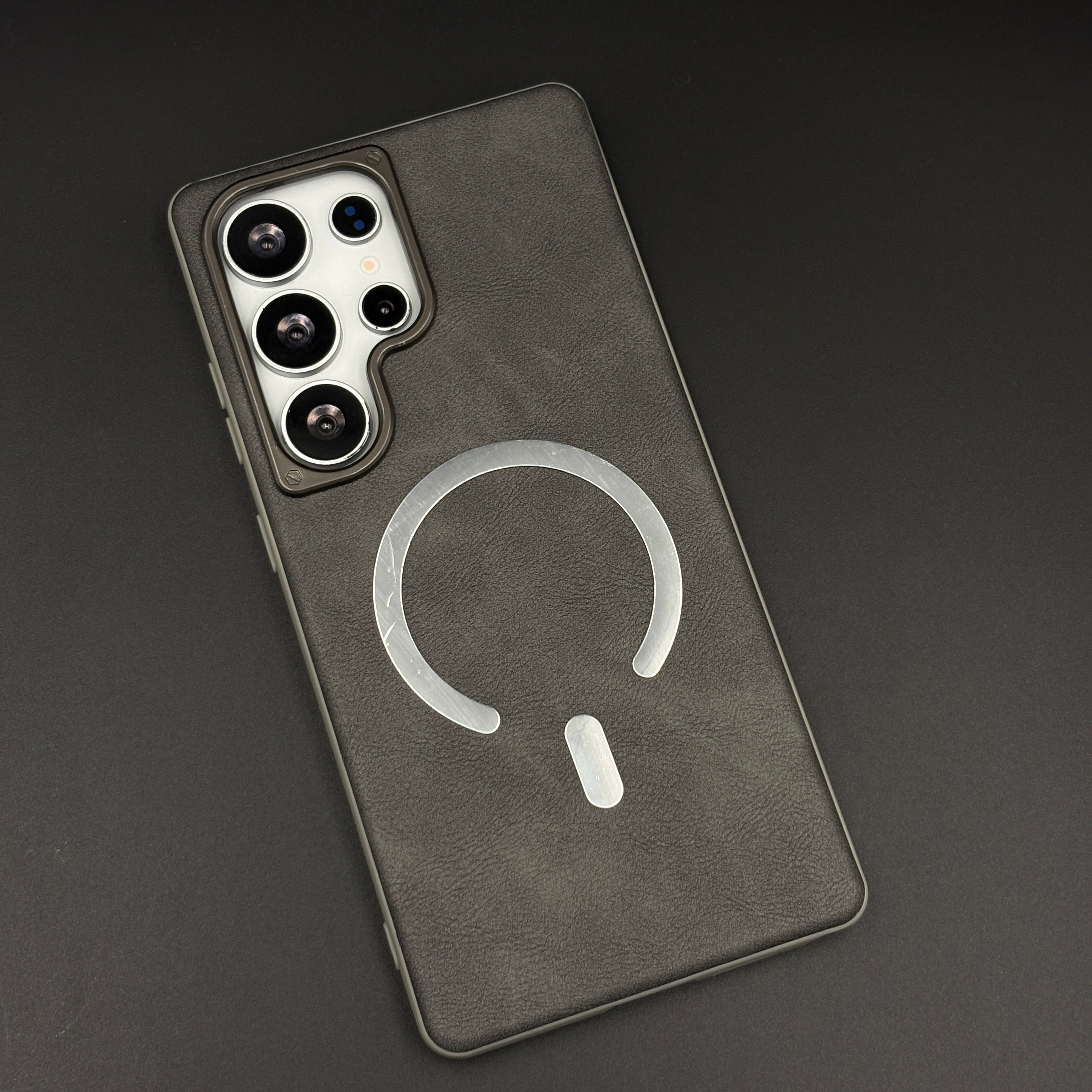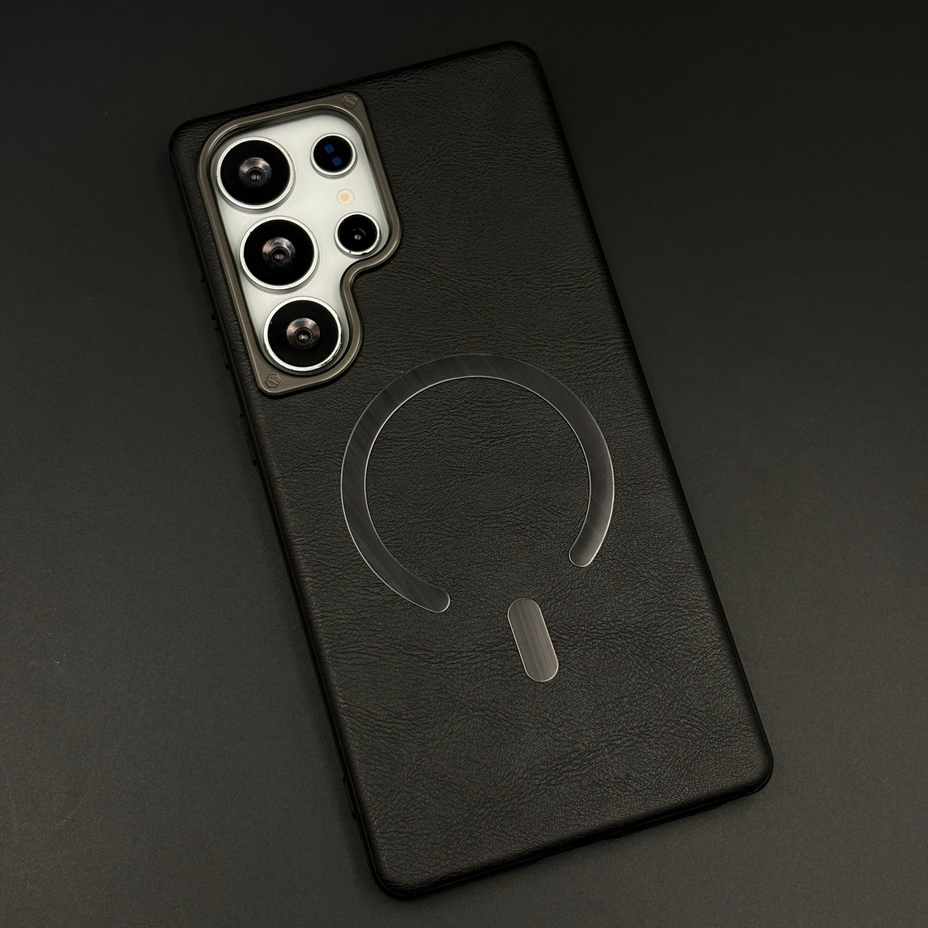 Protect your Samsung Galaxy S25 Ultra with this leather MagSafe case, featuring a soft-touch leather finish, integrated magnetic ring for fast wireless charging, and raised gold-tone camera bezel for everyday scratch and drop protection.
