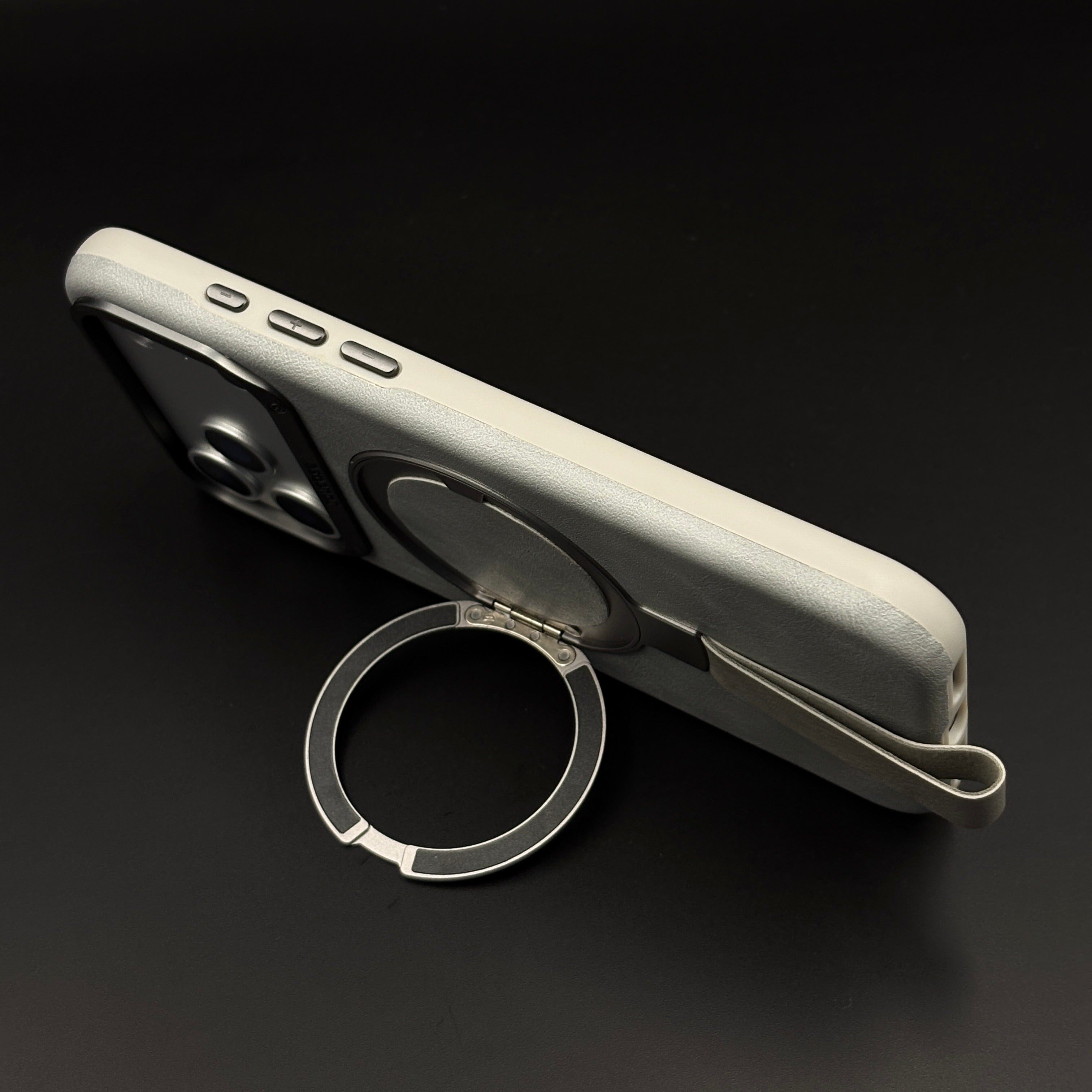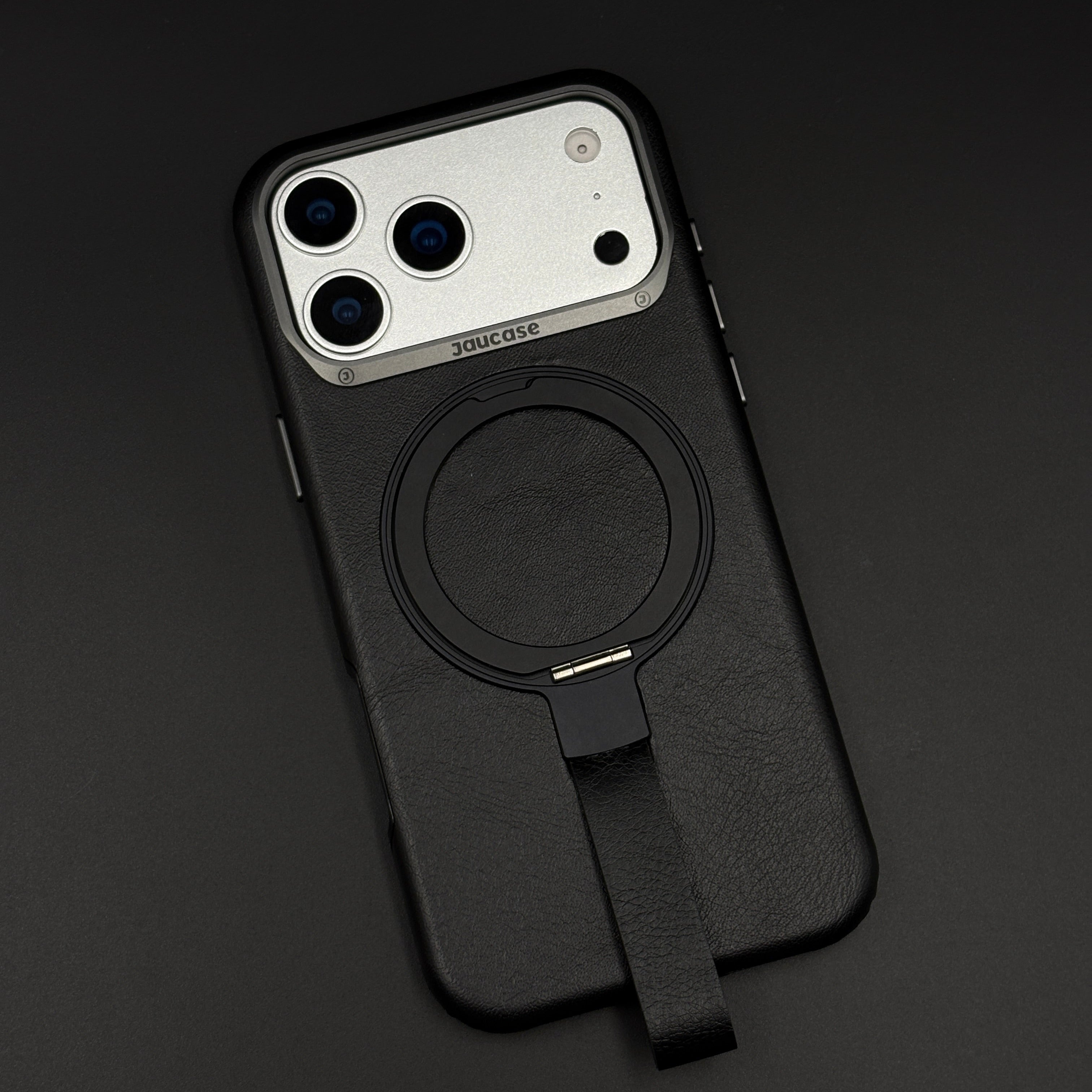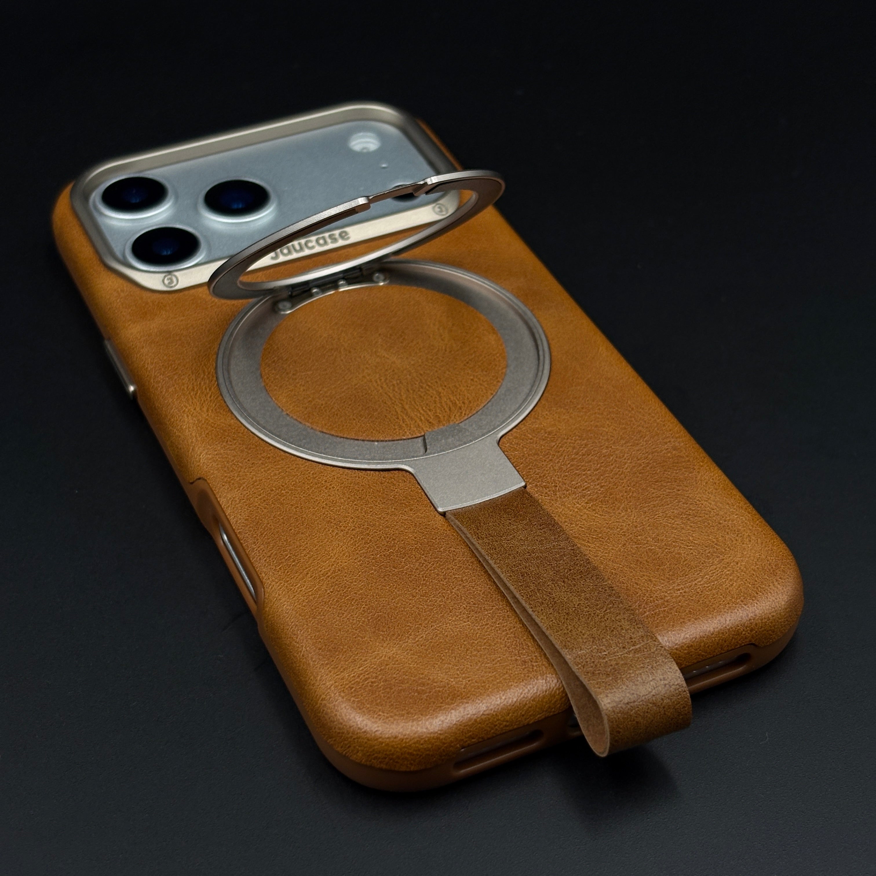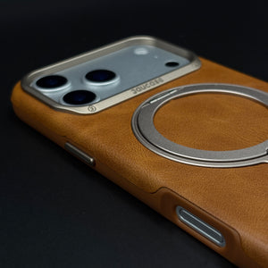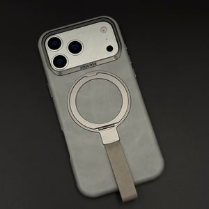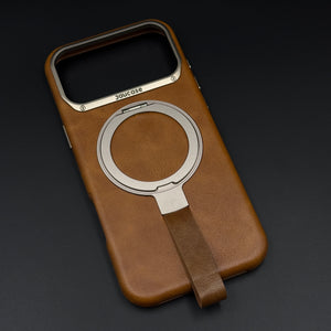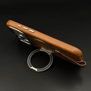 Carry and protect your iPhone 17 Series with this leather MagSafe ring stand case, featuring a built-in magnetic ring for strong MagSafe connection, integrated folding stand, and pull-out strap for secure one-hand grip and easy carrying.