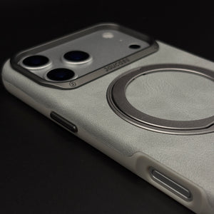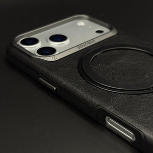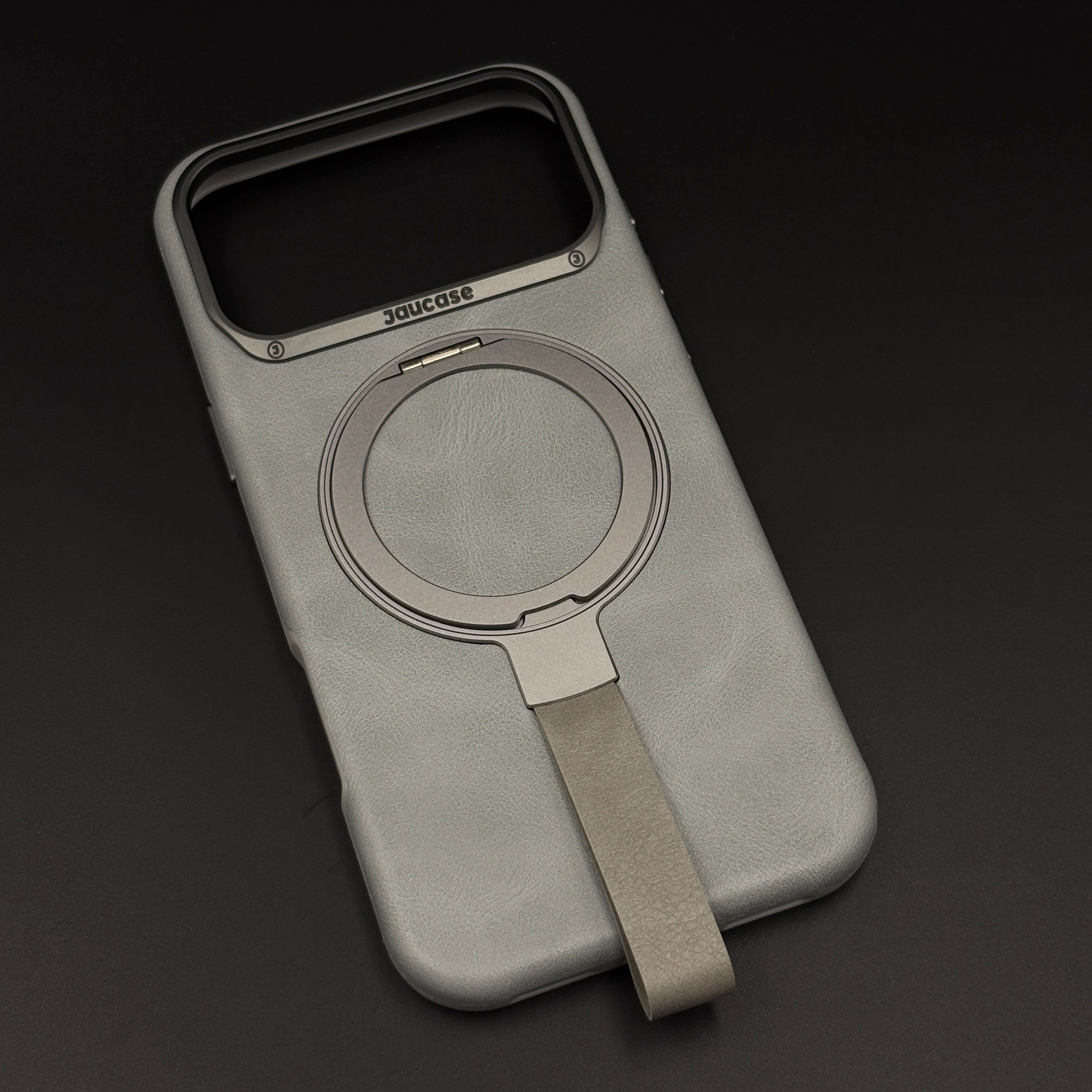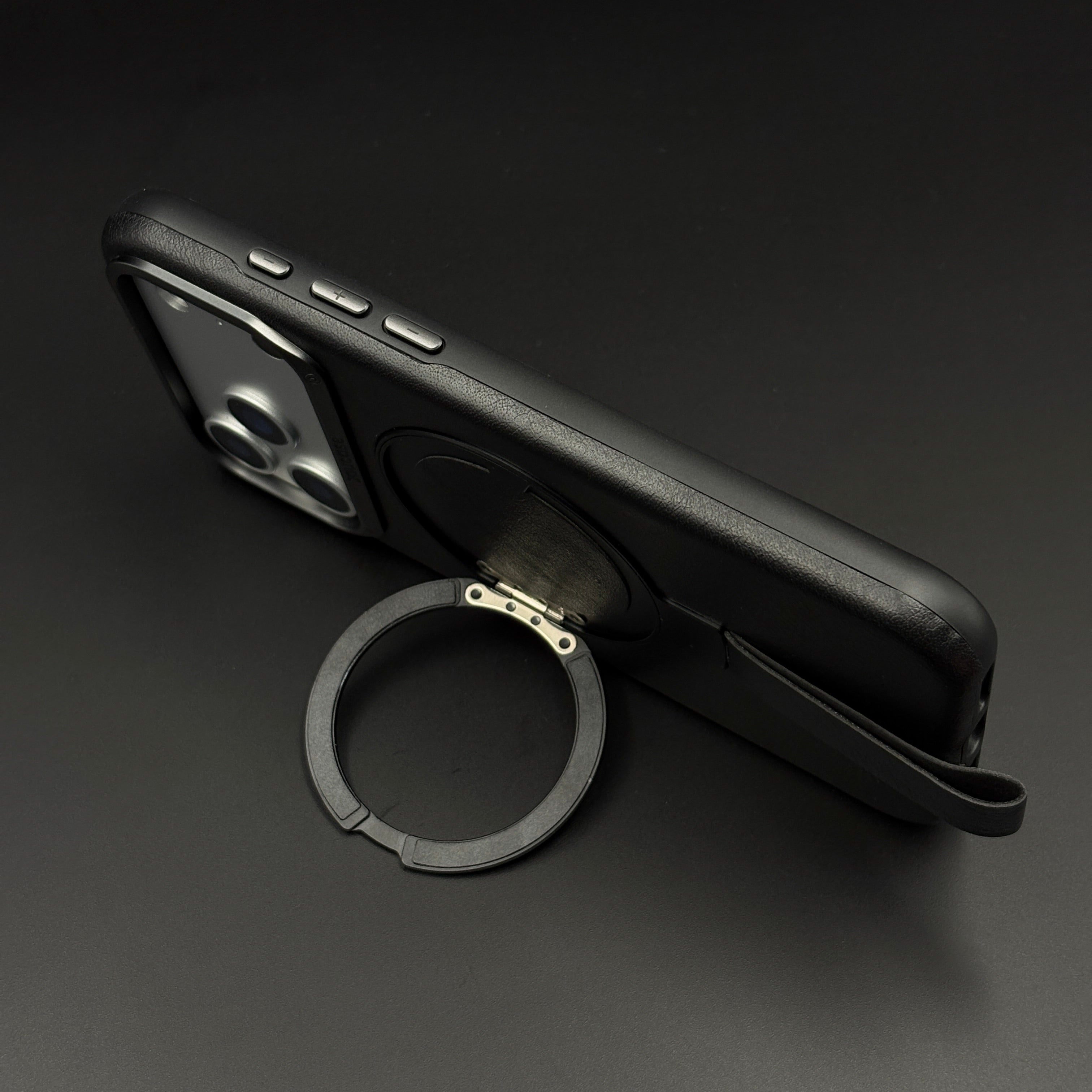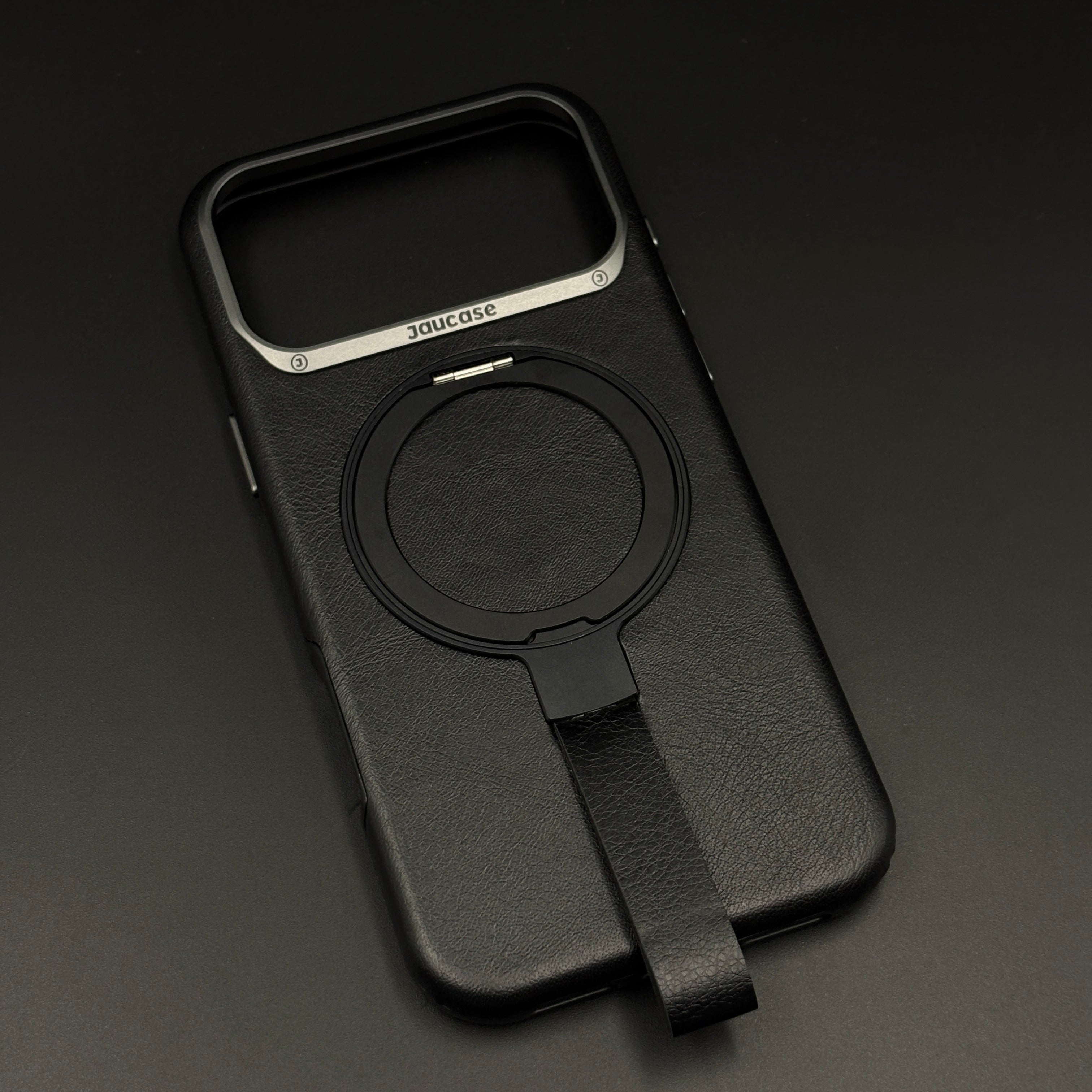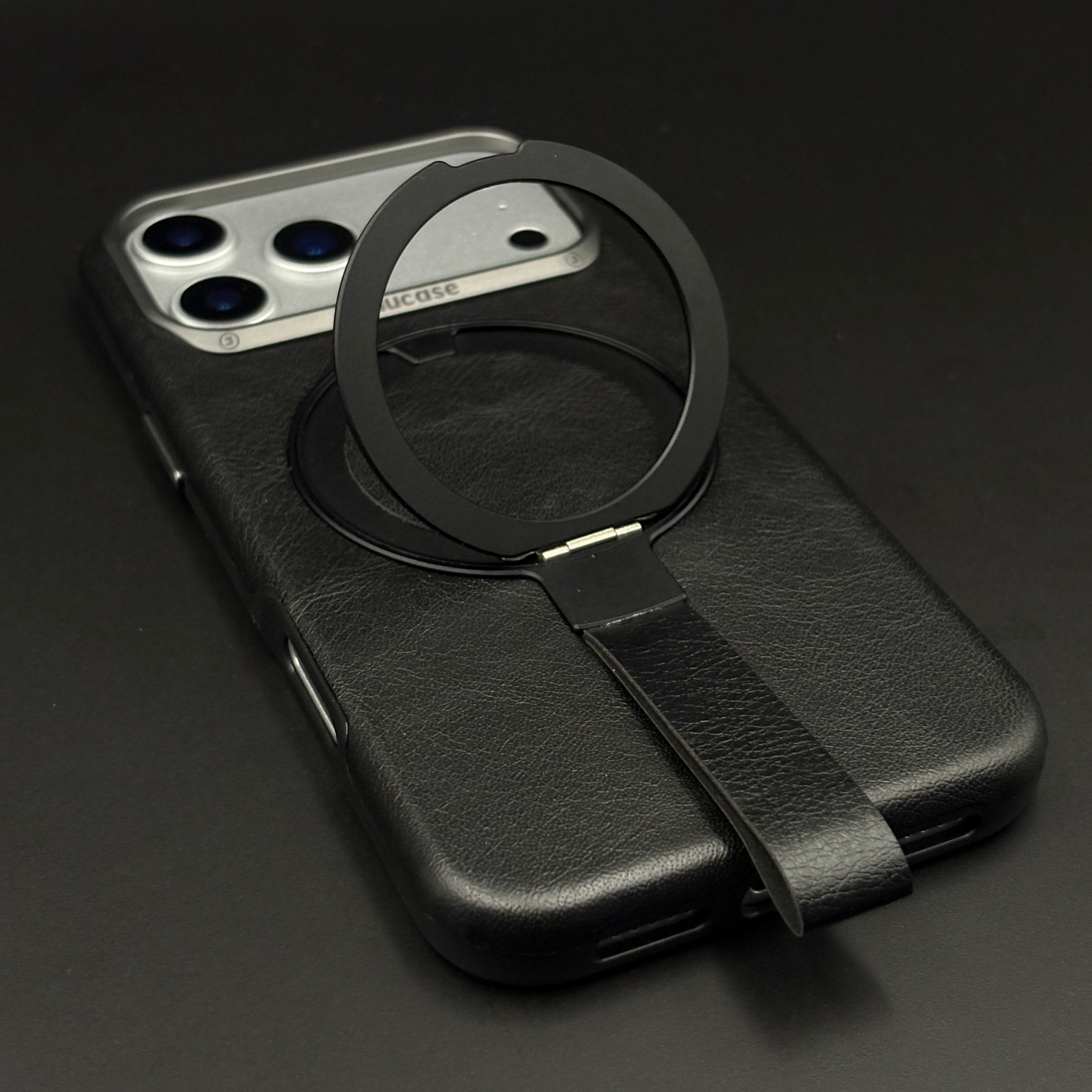 Carry and protect your iPhone 17 Series with this leather MagSafe ring stand case, featuring a built-in magnetic ring for strong MagSafe connection, integrated folding stand, and pull-out strap for secure one-hand grip and easy carrying.