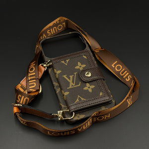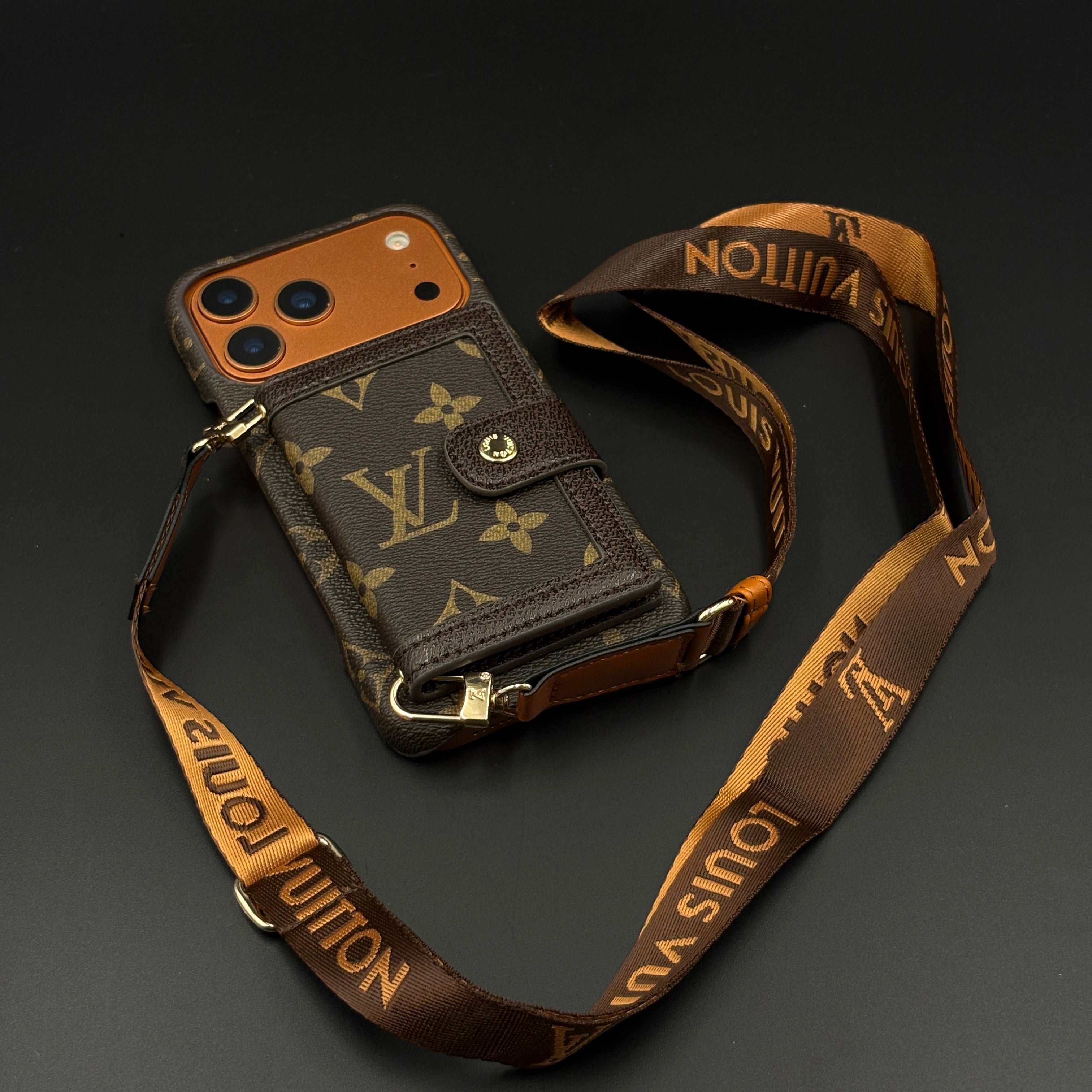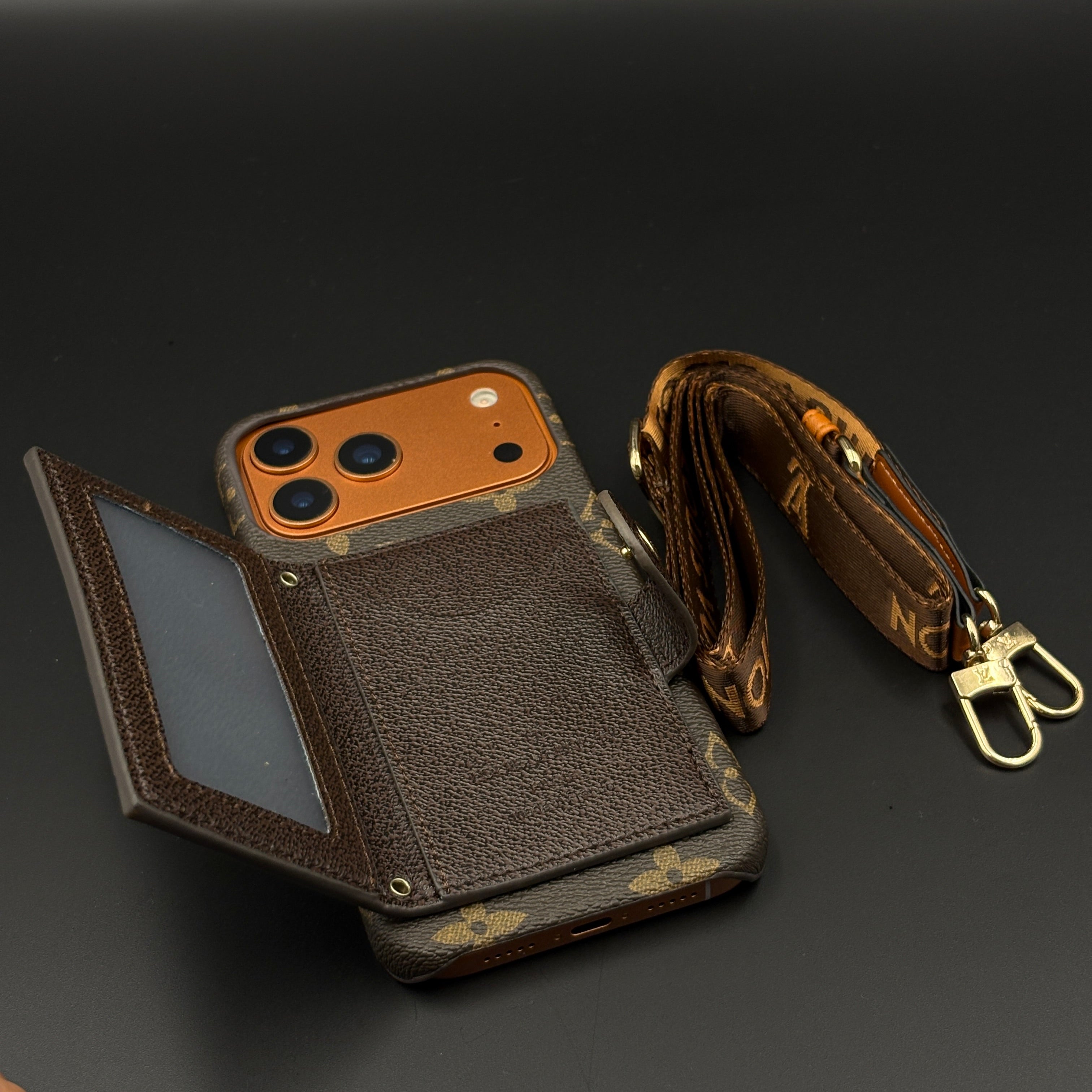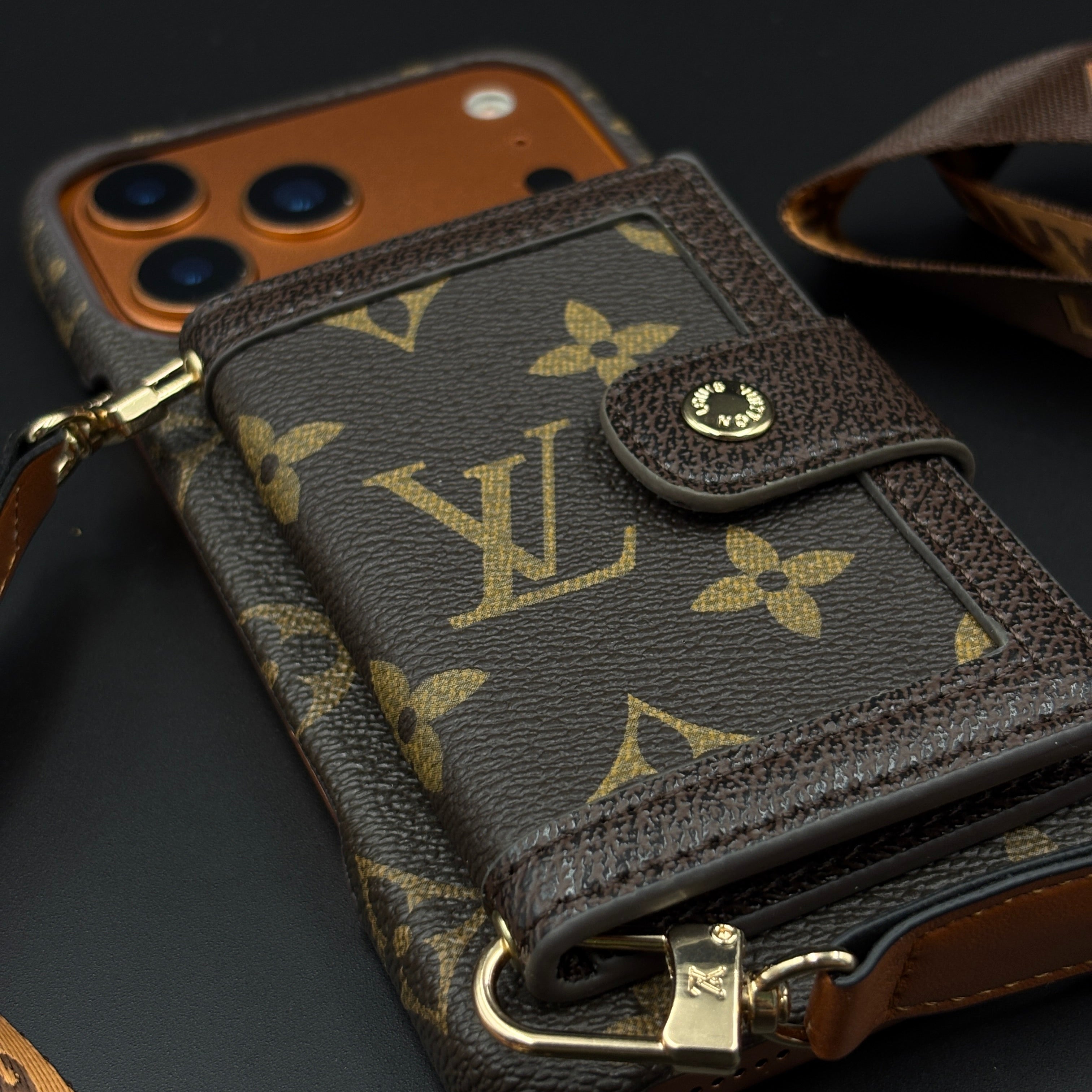 Luxury Brand Brown Wallet Case with Sling for iPhone 17 Series | Crossbody Strap | Card Holder