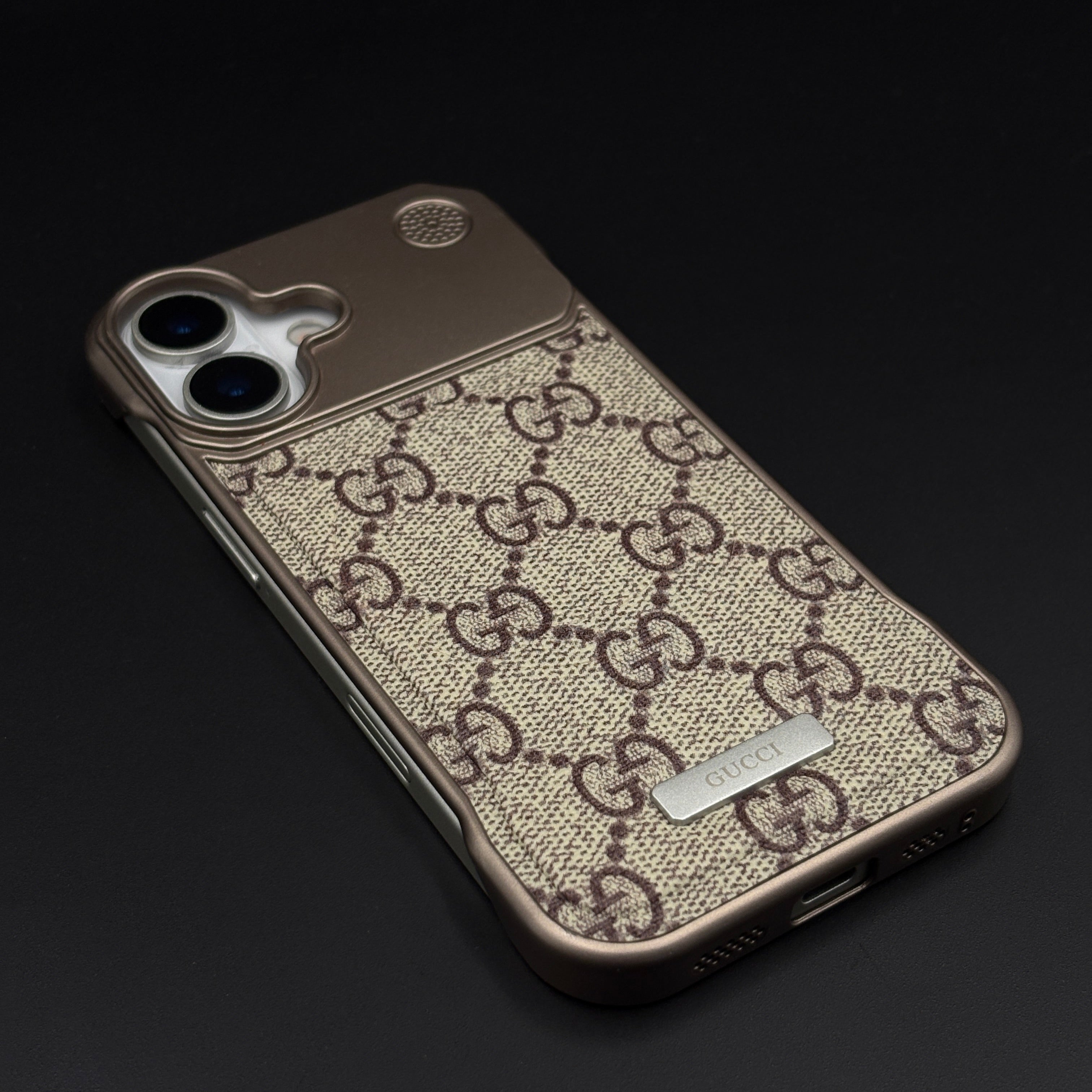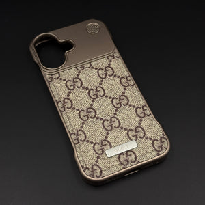 Luxury Branded GG Pattern Fabric Mobile Case for iPhone 17 | Premium Brown Texture Fabric