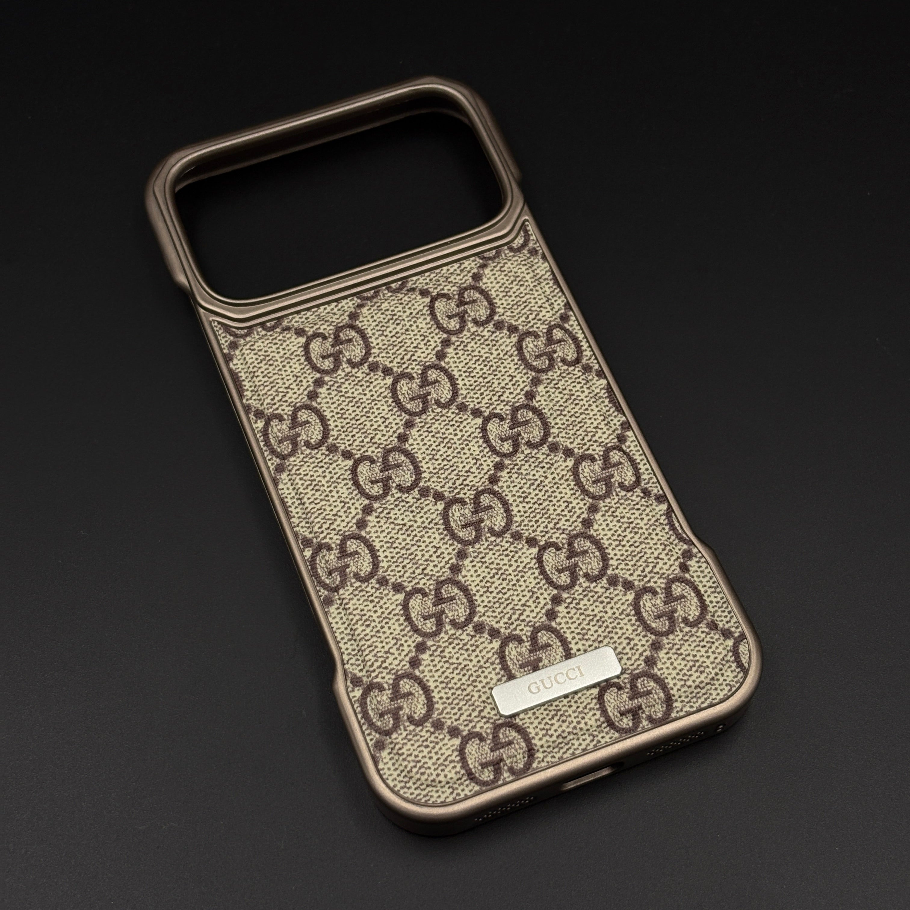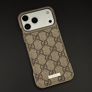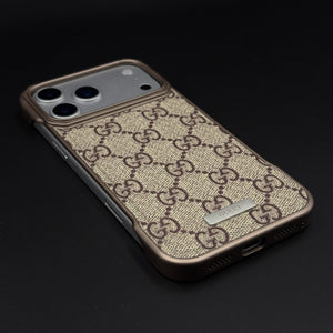 Luxury Branded GG Pattern Fabric Mobile Case for iPhone 17 Series | Premium Brown Texture Fabric