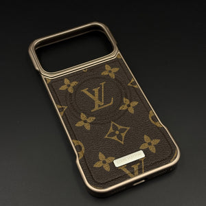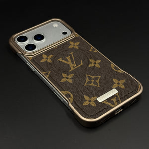 Upgrade your iPhone 17 Series with this vintage-inspired monogram leather case featuring deep brown tones and a refined textured finish. The metallic frame adds a premium edge, creating a timeless designer-style look.