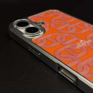 Give your iPhone 17 a bold luxury touch with this designer-inspired case featuring an intricate interlock pattern and a sparkling metallic “H” initial. The vibrant orange base and polished metal frame create a modern, upscale aesthetic.