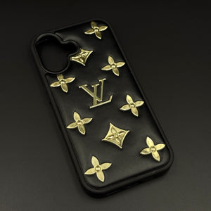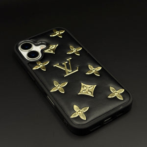Transform your iPhone 17 with this ultra-luxury leather-textured case featuring multiple raised gold emblems for a bold, designer-inspired statement. The black Cushioned surface paired with 3D metallic detailing creates a rich, high-end aesthetic.