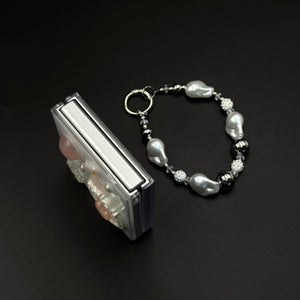 Detachable pearl and metallic charm strap adds convenience and chic style.