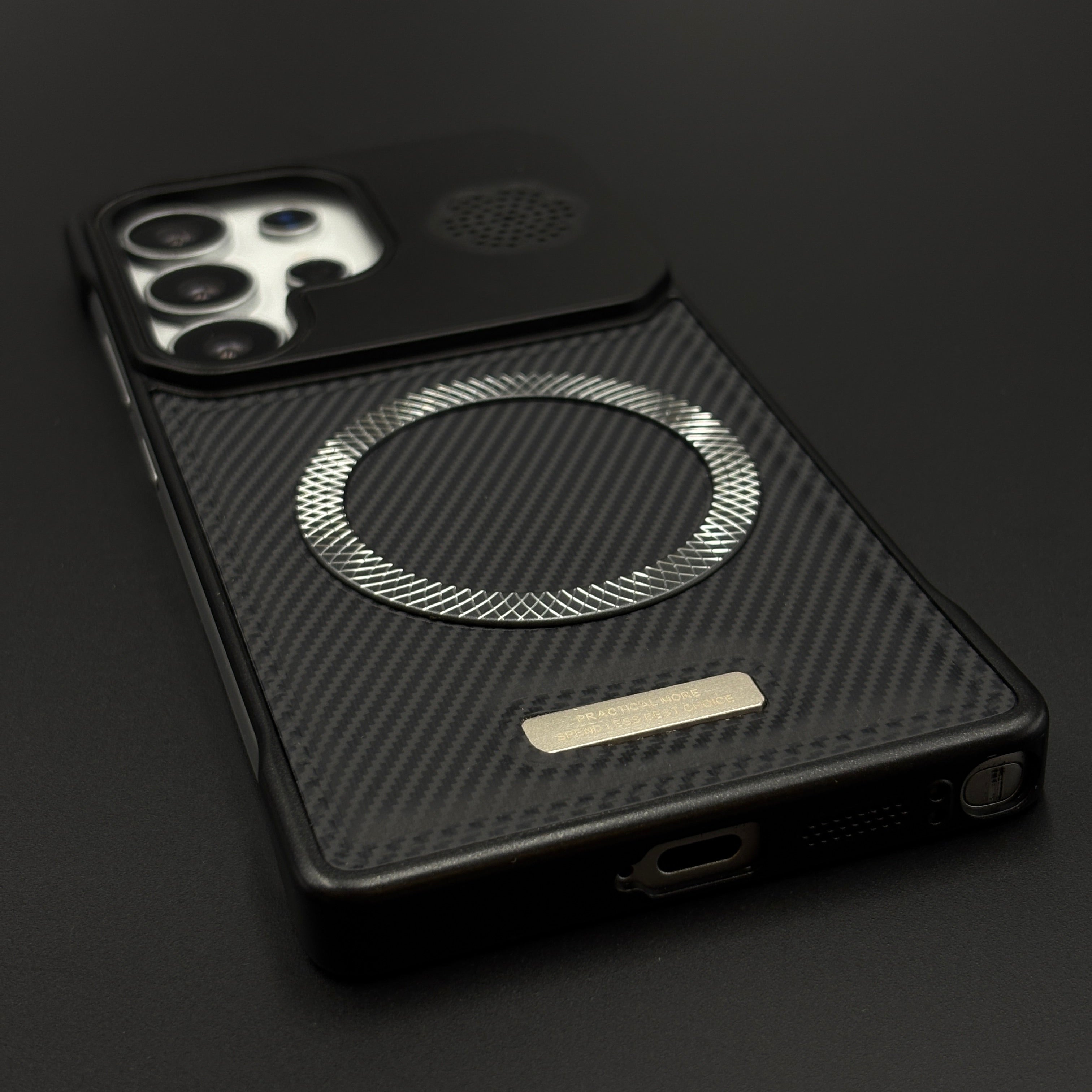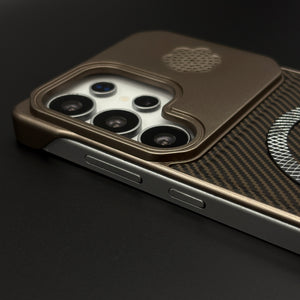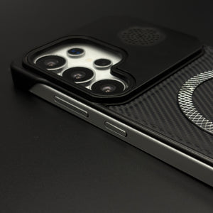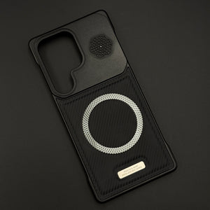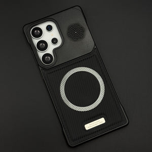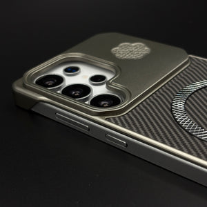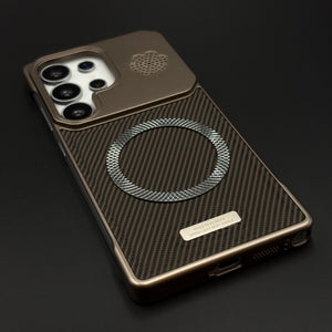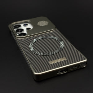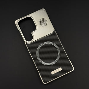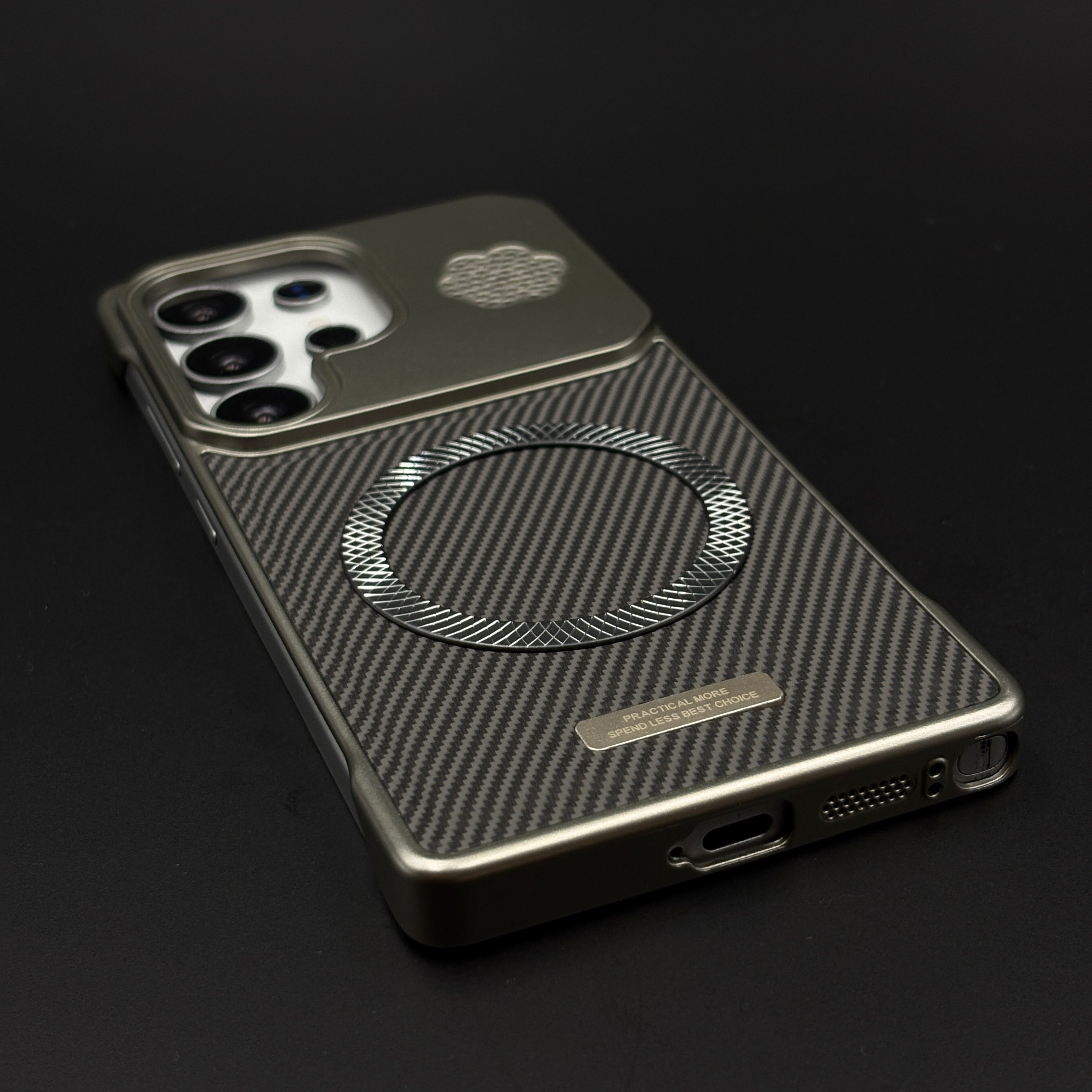 Enjoy luxury and high-tech style with this borderless dual-tone MagSafe case for Samsung Galaxy S25 Ultra. Designed with a modern metallic upper shell and carbon fiber texture below, it delivers premium grip, magnetic convenience, and all-around protection.