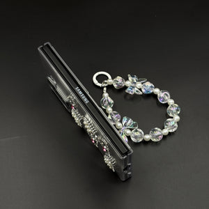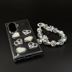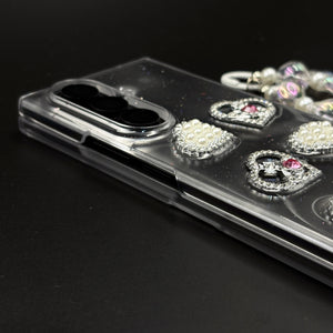 Style meets protection with this luxury Galaxy Z Fold 7 case featuring pearl-embellished heart charms, rhinestone accents, and a detachable beaded strap. The clear glitter finish showcases your phone while adding sparkle, elegance, and grip. Perfect for fashion-forward users who want durable protection with a glamorous touch.