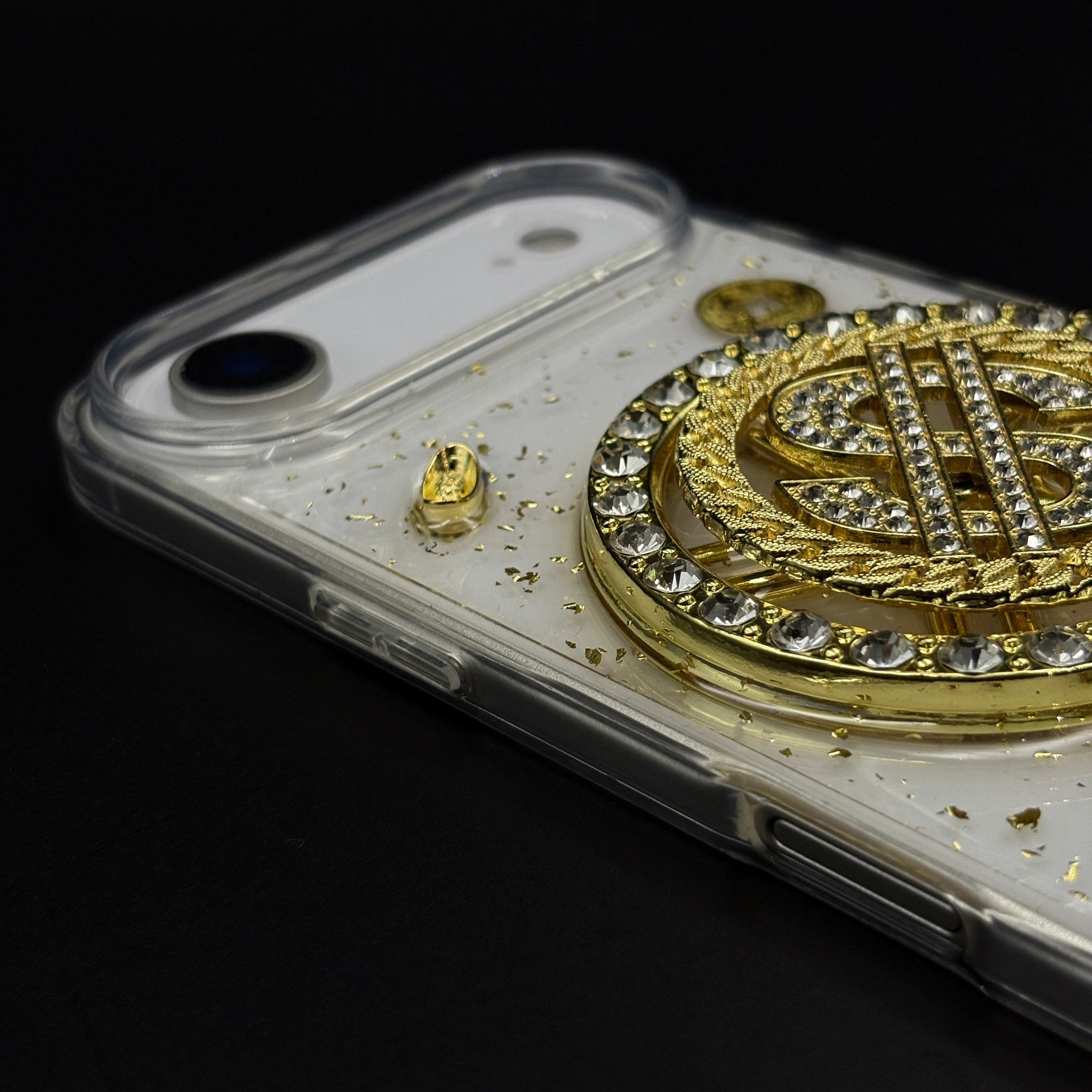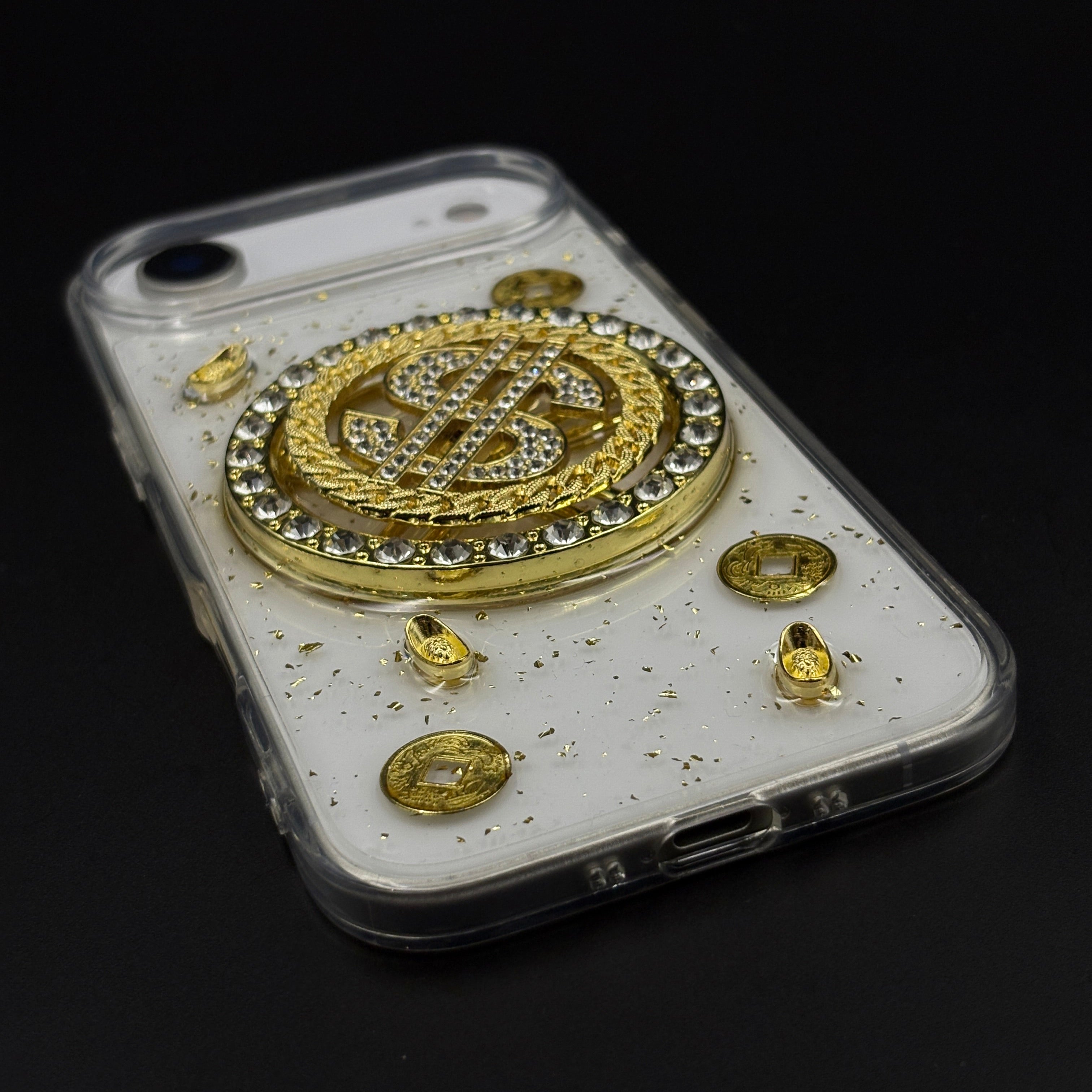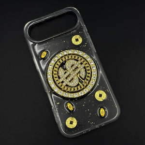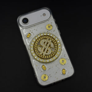 Make a statement with the Luxury Rotating Dollar Case designed exclusively for the iPhone series. Featuring a golden, rotating dollar emblem surrounded by sparkling stones, this case screams luxury, style, and confidence. The sturdy hard-shell body offers reliable protection, while the attached pearl and gold beaded strap adds convenience and elegance—perfect for on-the-go glam.