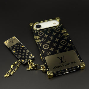 Luxury Trunk Phone Case Cover with Chain for iPhone 17 Air | Designer Metal Frame | Gold Monogram