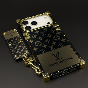 Luxury Trunk Phone Case Cover with Chain for iPhone 17 Series | Designer Metal Frame | Gold Monogram