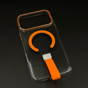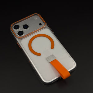 Protect your iPhone 17 Series with this crystal-clear MagSafe case—featuring an easy-grip finger strap holder, built-in magnetic ring, and vibrant accent color for comfort and wireless charging convenience.