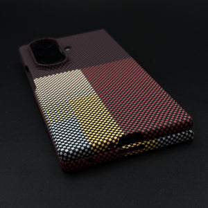 Upgrade your Samsung Galaxy Z Fold 6 with this Maroon Block Aramid Case featuring modern geometric blocks in maroon, beige, mustard, and grey, all on a tactile carbon fibre-inspired texture. The case combines hidden MagSafe compatibility for effortless wireless charging and a built-in camera kickstand for easy hands-free use, making it both striking and practical for daily wear.