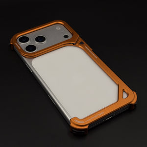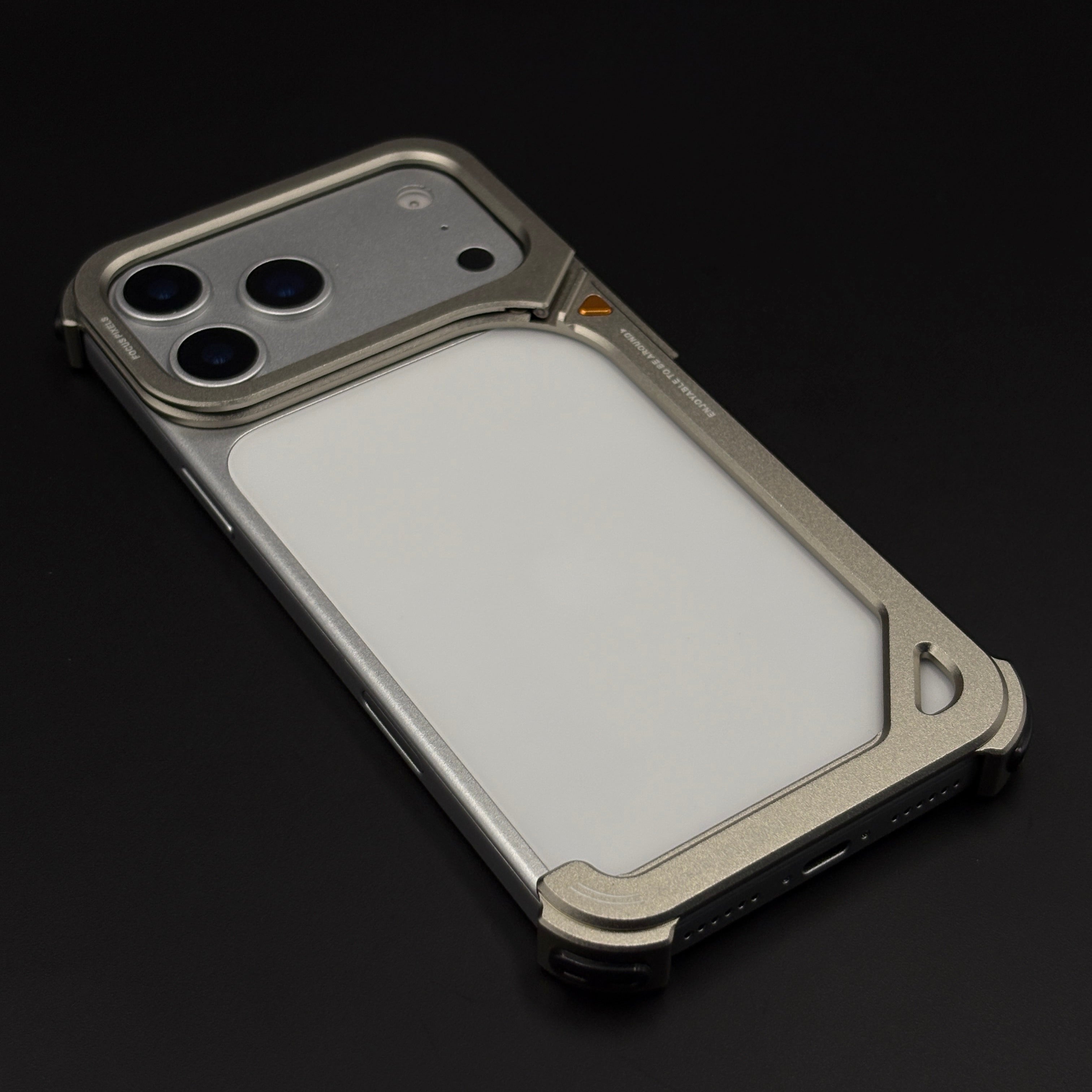 Give your iPhone 17 Series an industrial upgrade with this metal bumper back case, featuring an exposed aluminum-style frame, reinforced corner guards, and a semi‑transparent back panel that showcases the Apple logo while adding everyday drop protection.