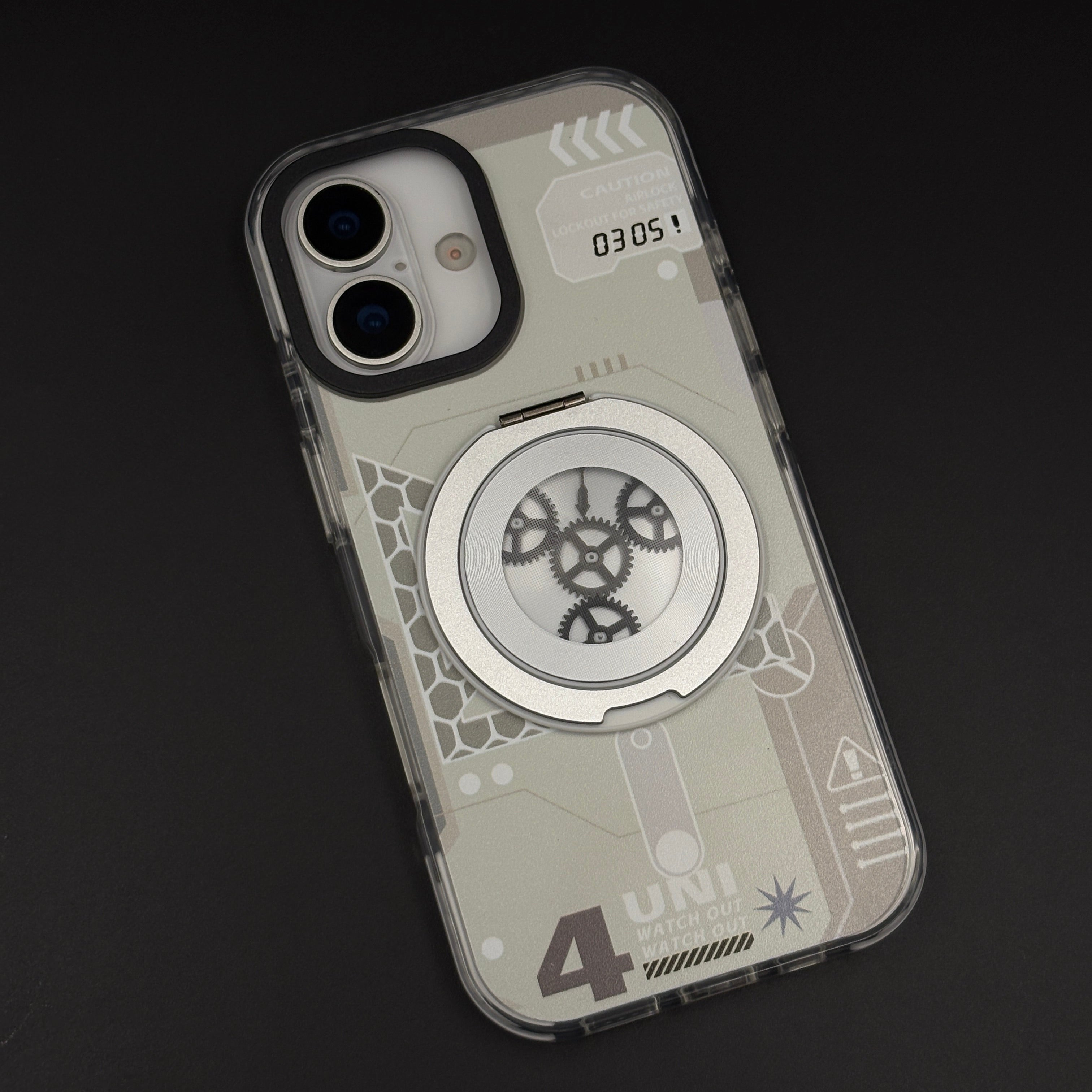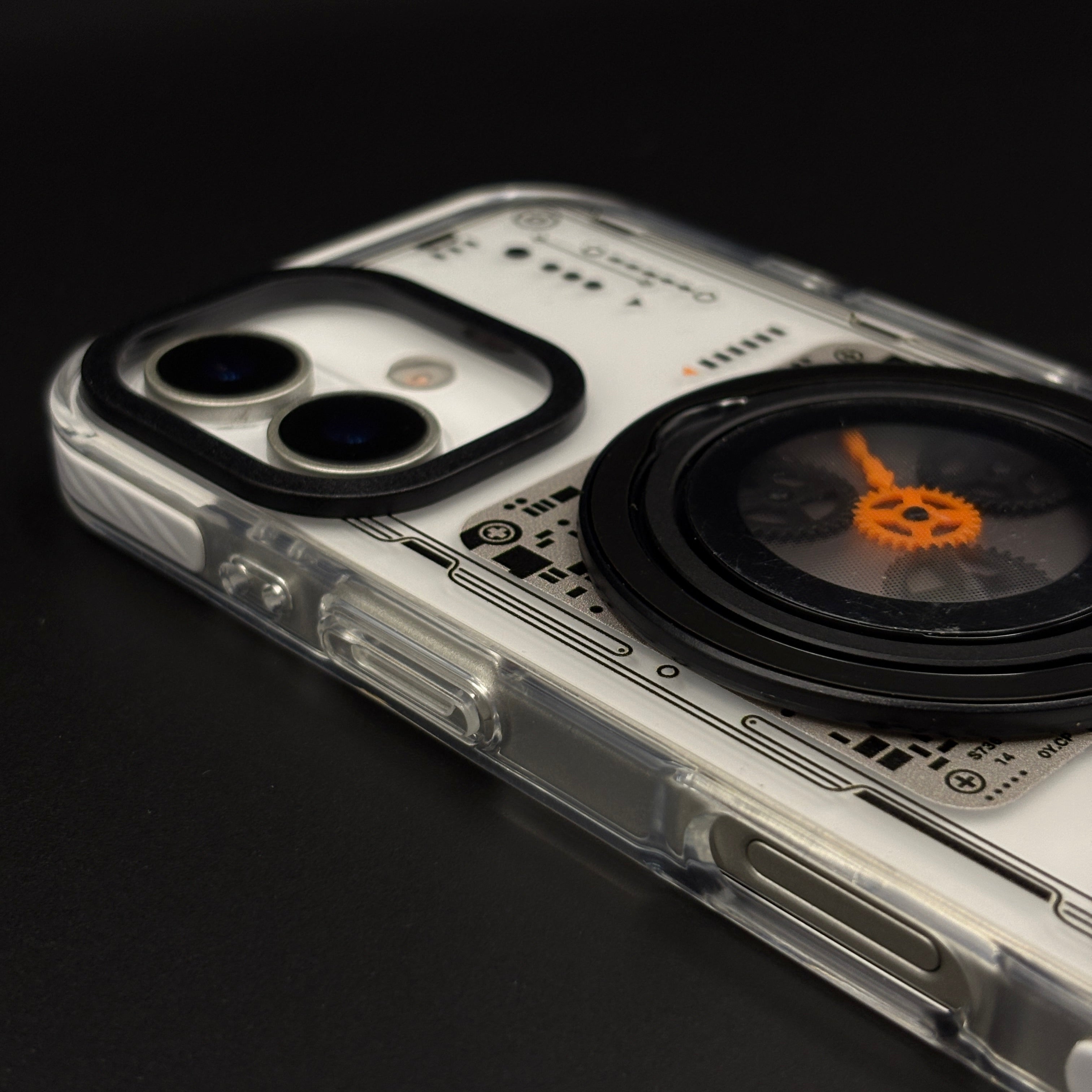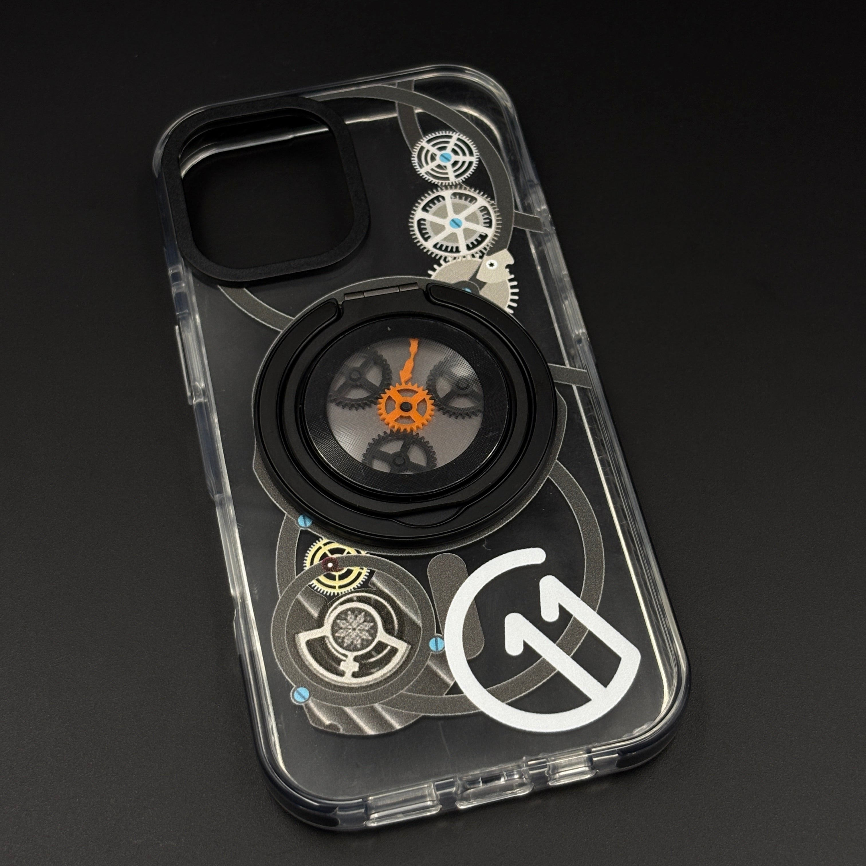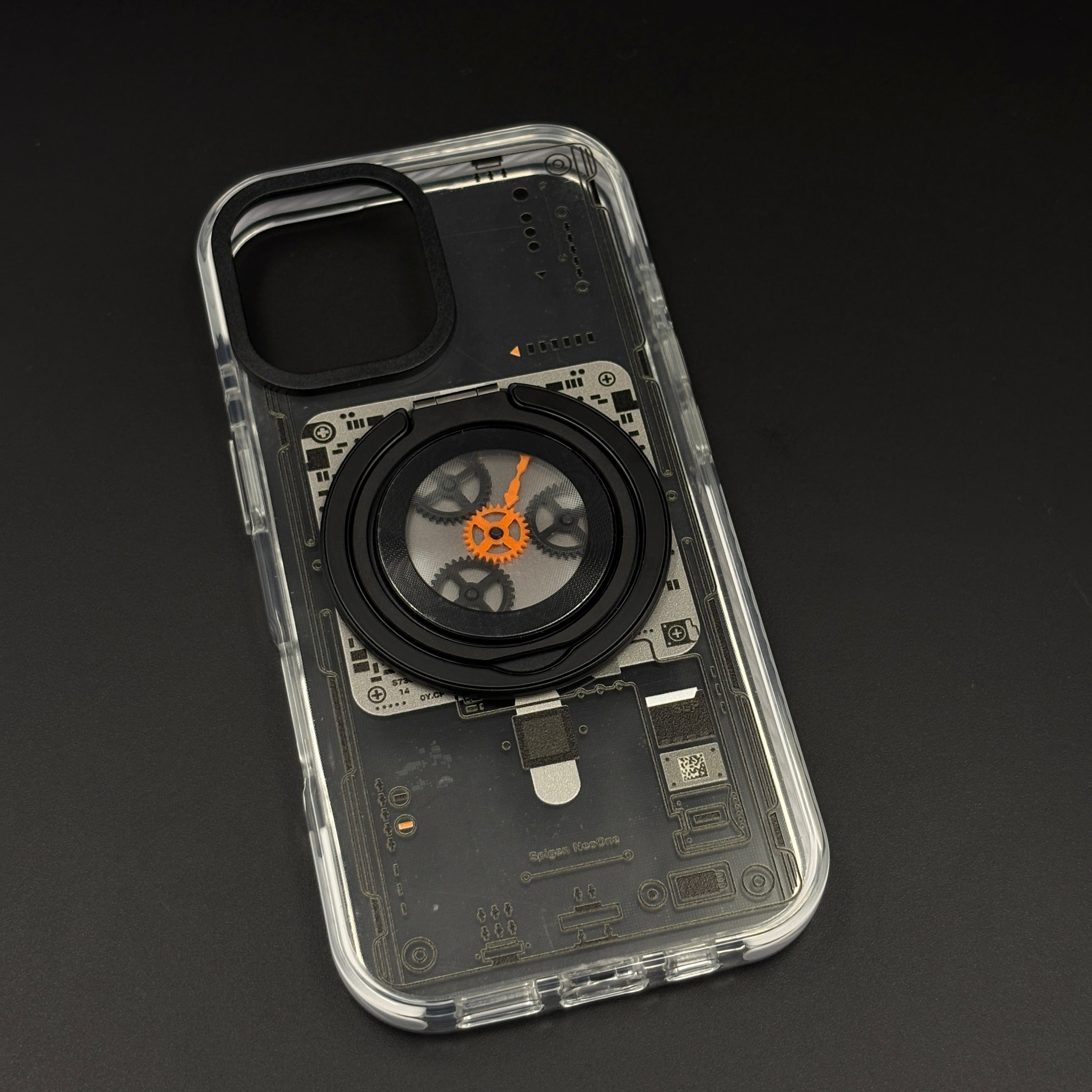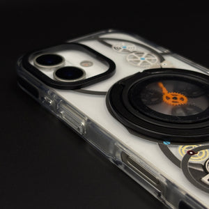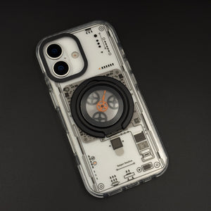 Transform your iPhone 17 with this metal rotating stand MagSafe case, featuring a cyberpunk-inspired transparent design, embedded gear-ring kickstand, and strong magnetic compatibility for hands-free viewing and wireless charging.
