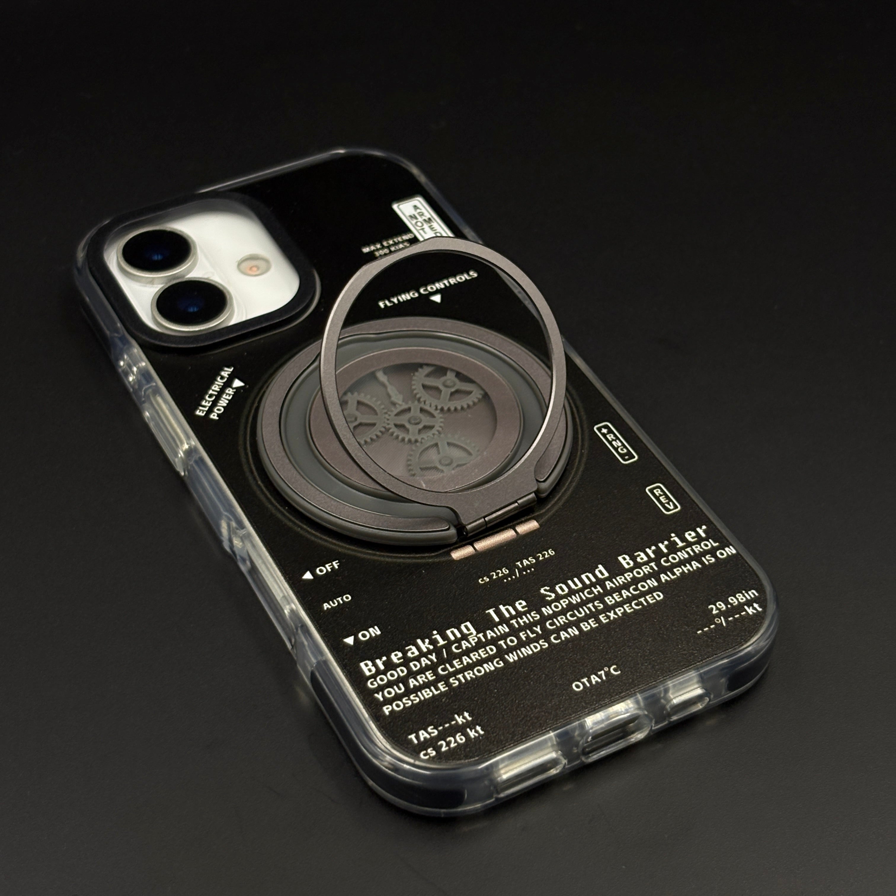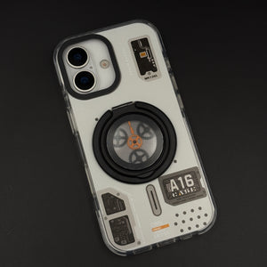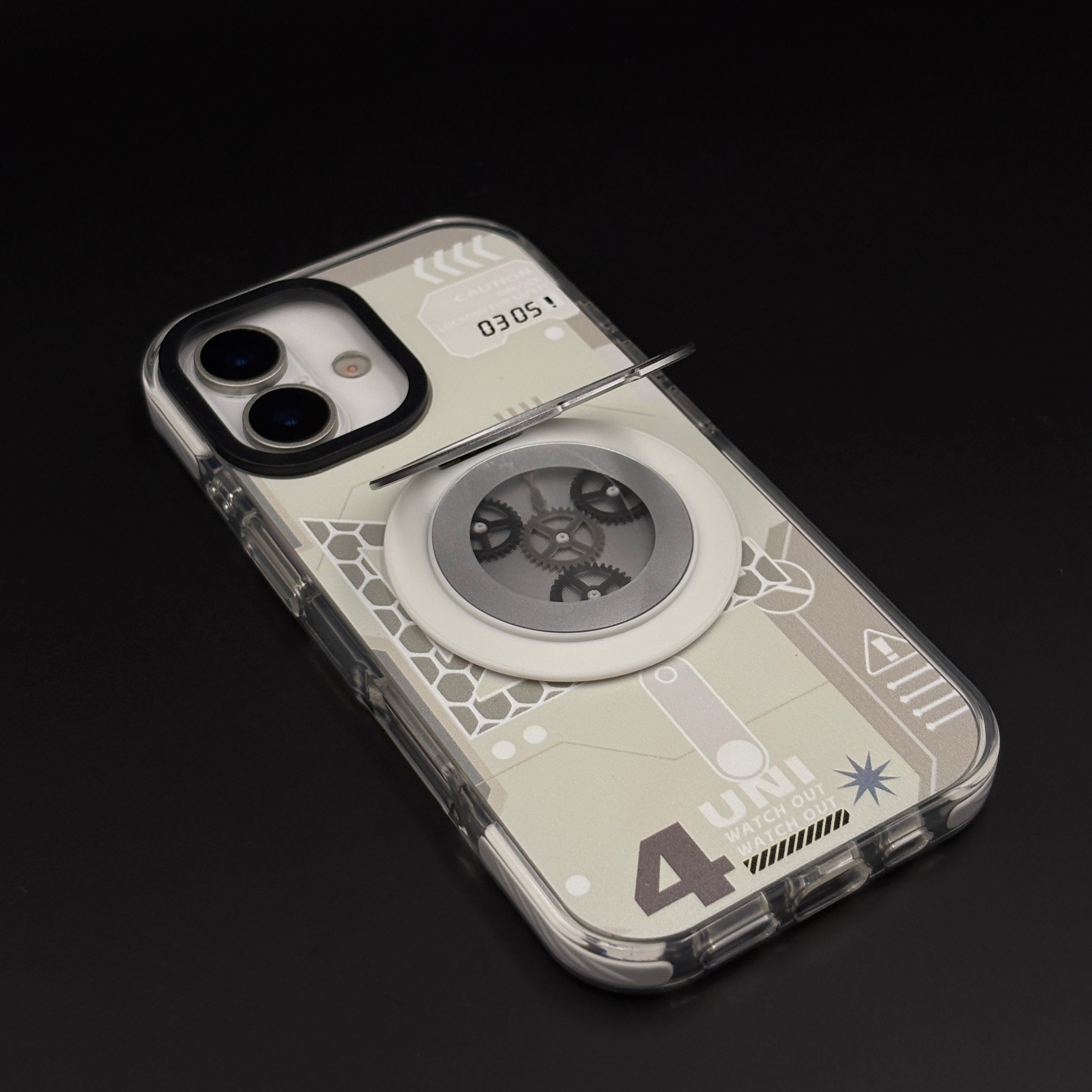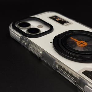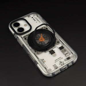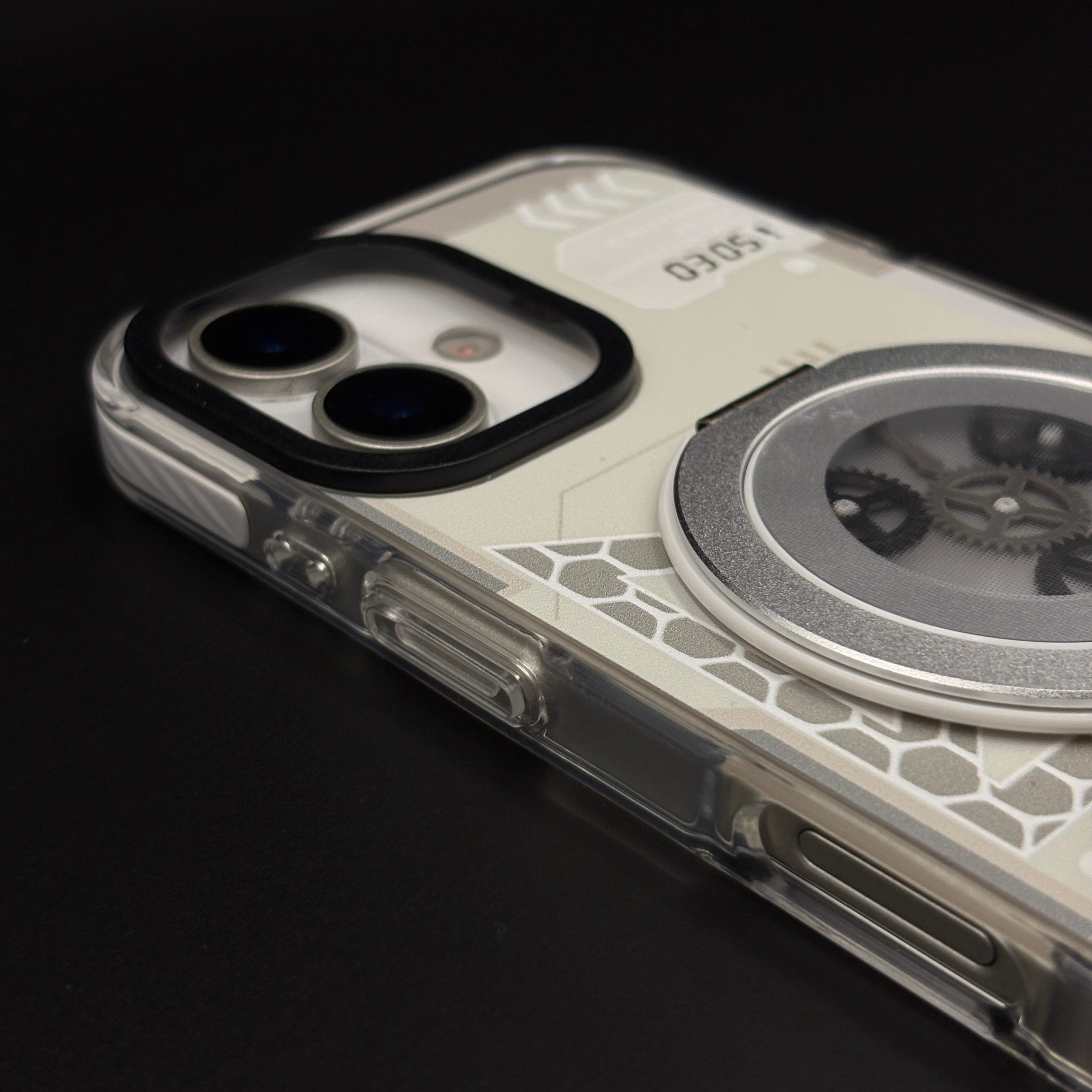 Transform your iPhone 17 with this metal rotating stand MagSafe case, featuring a cyberpunk-inspired transparent design, embedded gear-ring kickstand, and strong magnetic compatibility for hands-free viewing and wireless charging.