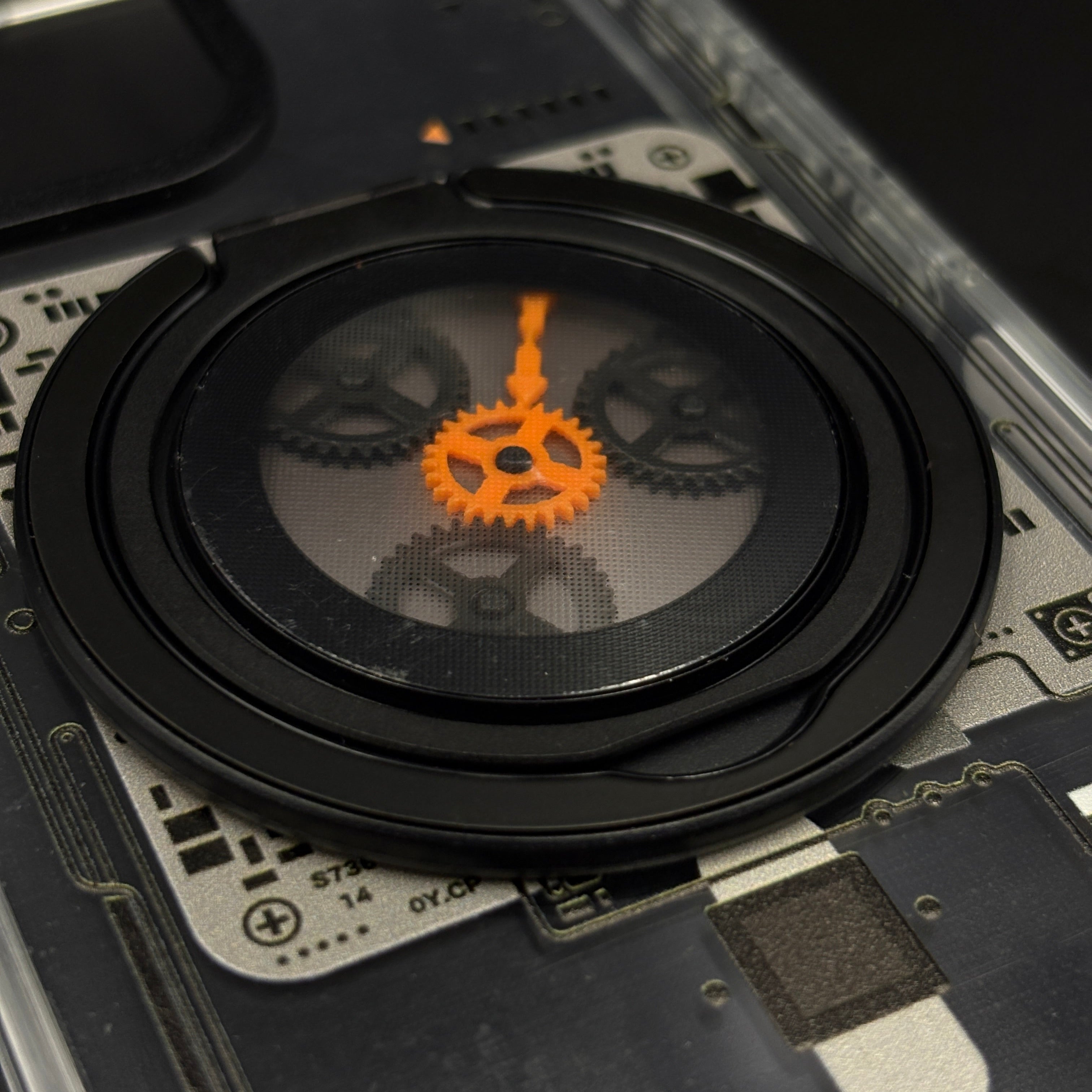 🔄 360° Rotating Gear Stand – Metal ring with intricate gear mechanism flips out as a multi-angle kickstand for stable landscape/portrait viewing during videos or calls.