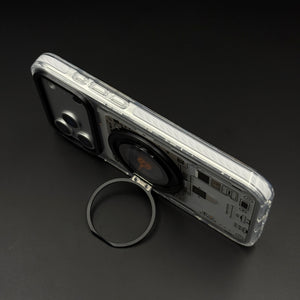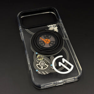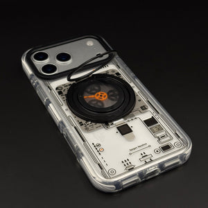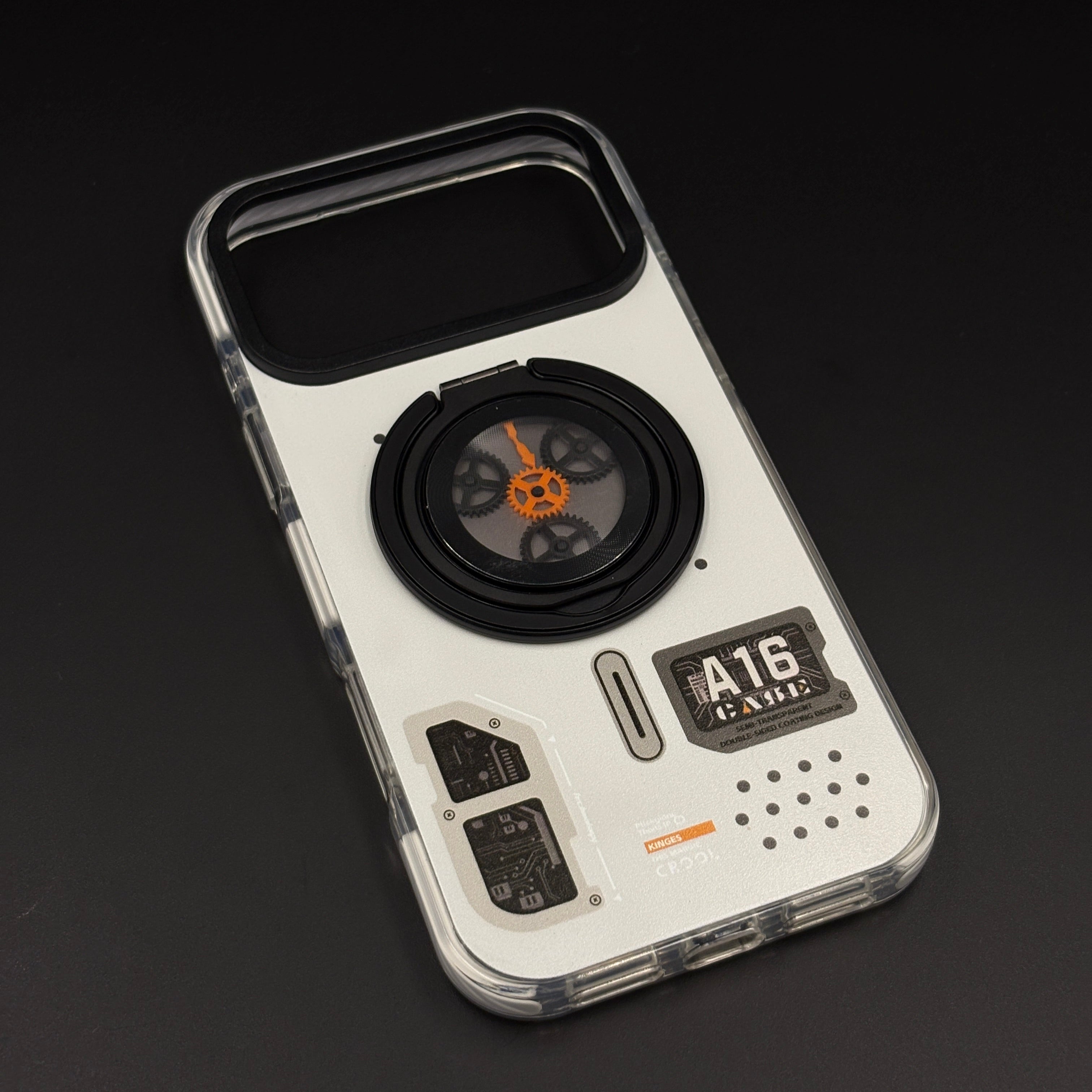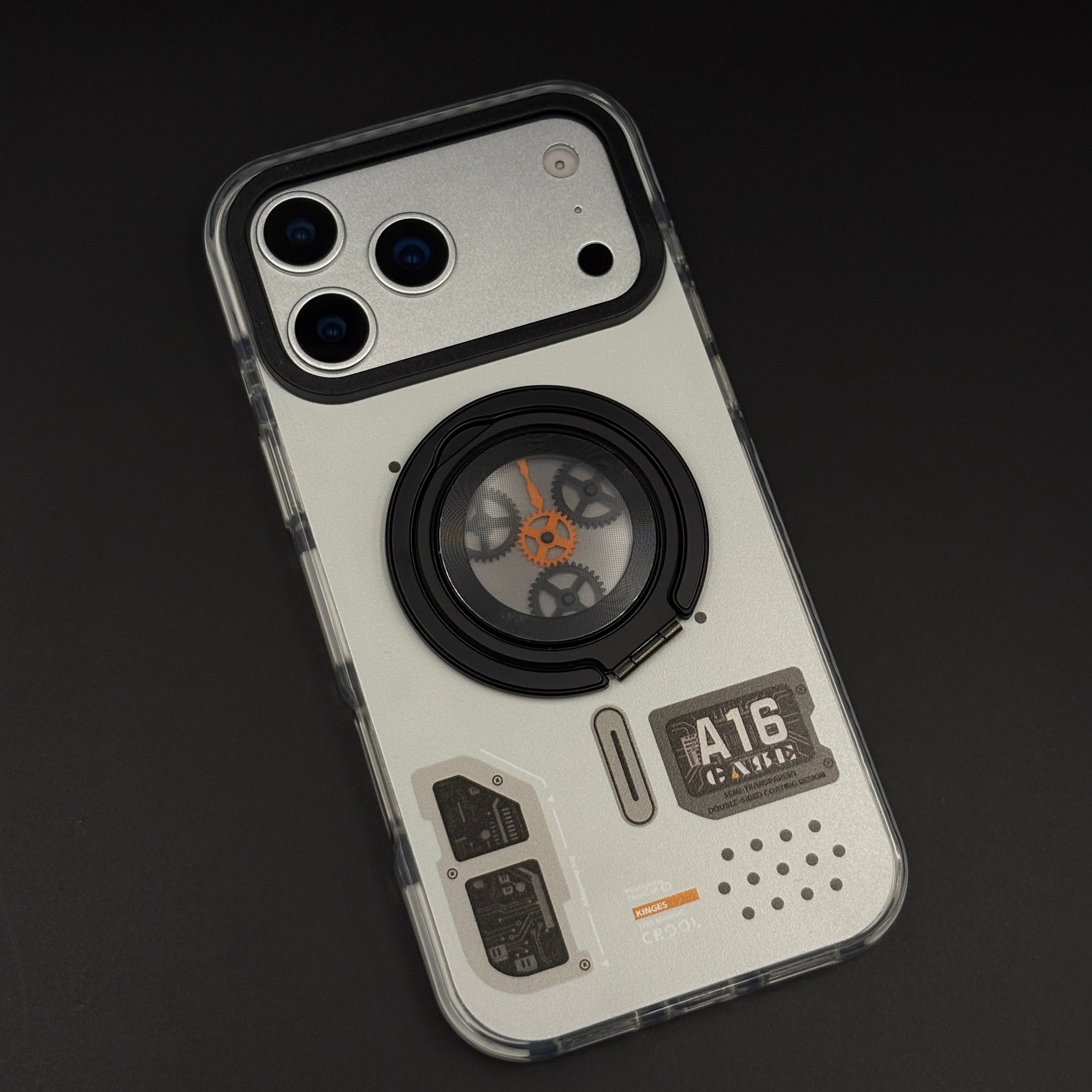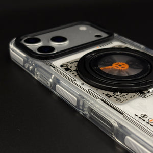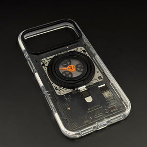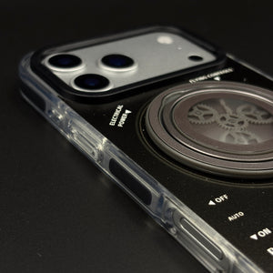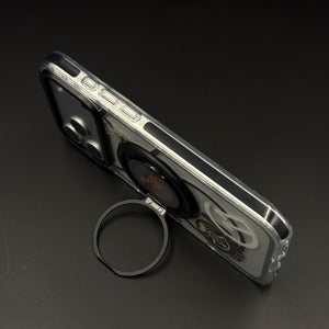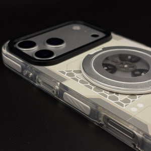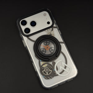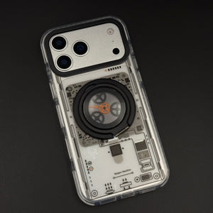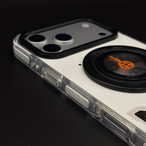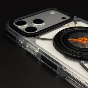 Transform your iPhone 17 series with this metal rotating stand MagSafe case, featuring a cyberpunk-inspired transparent design, embedded gear-ring kickstand, and strong magnetic compatibility for hands-free viewing and wireless charging.