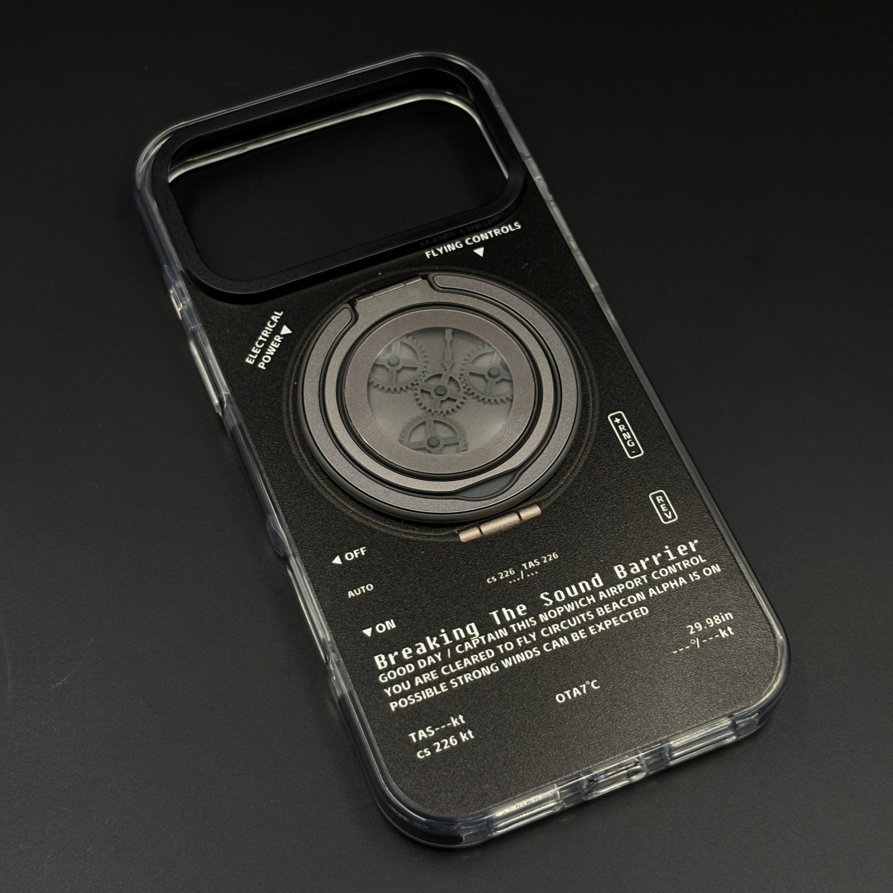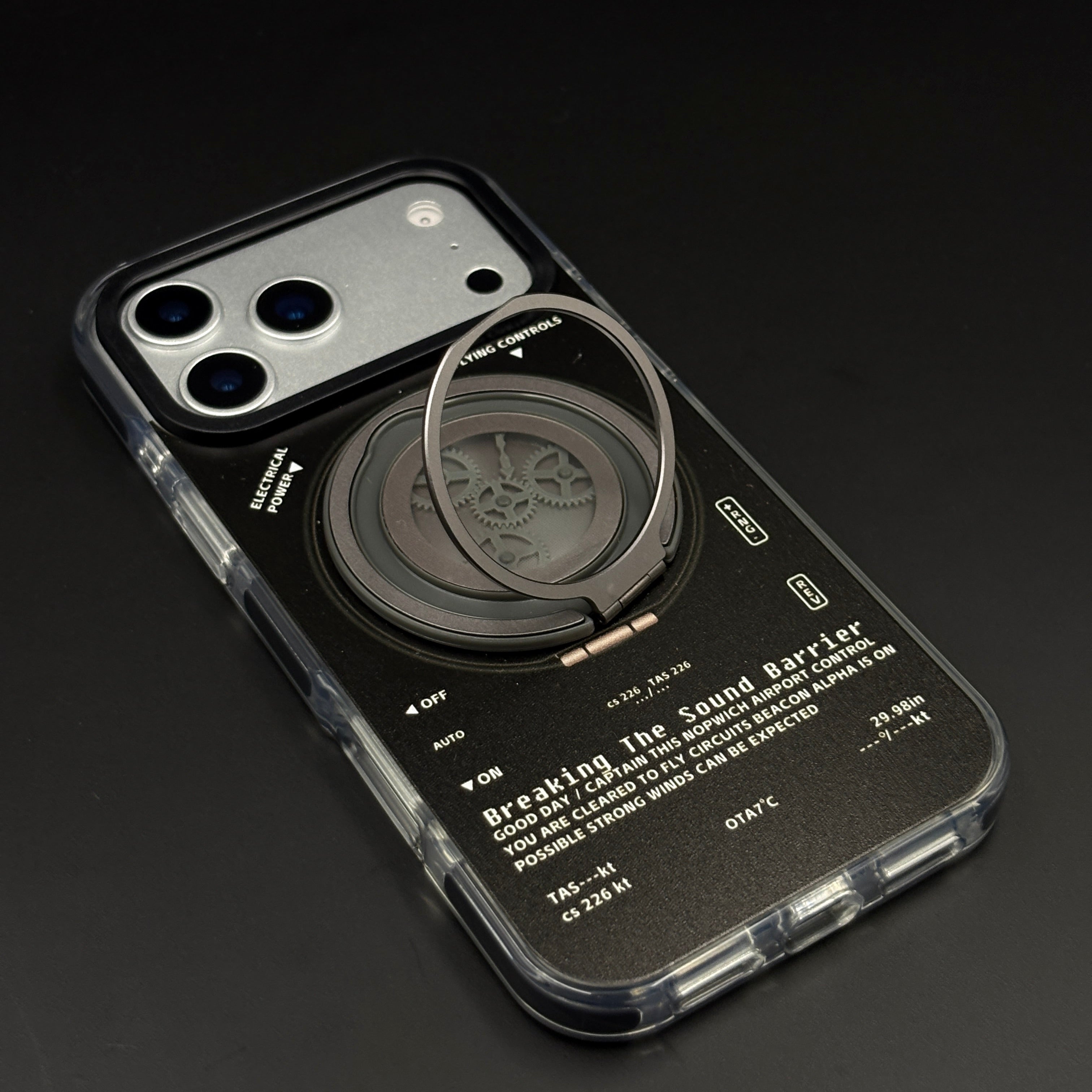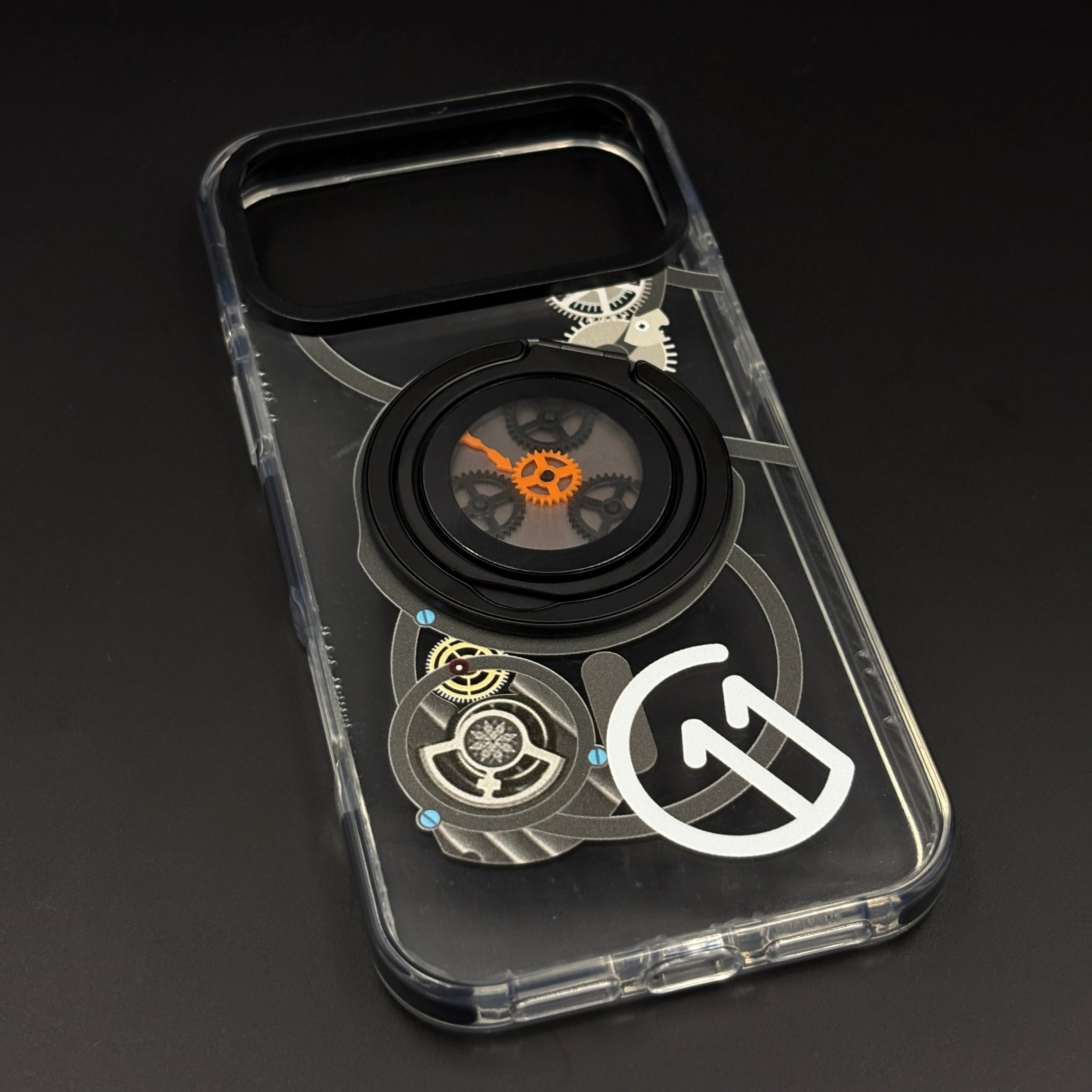 🔄 360° Rotating Gear Stand – Metal ring with intricate gear mechanism flips out as a multi-angle kickstand for stable landscape/portrait viewing during videos or calls.