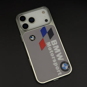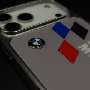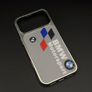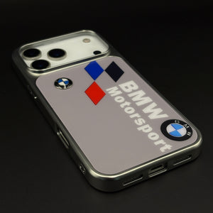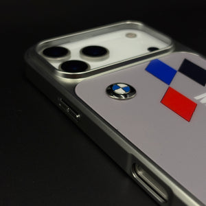 Bring track-bred energy to your iPhone with this motorsport metal style frame hard case cover — a sleek silver-framed design featuring bold Motorsport branding, tricolour racing graphics, and dual roundel emblems that make your phone look like a piece of pit-lane hardware.