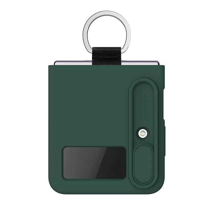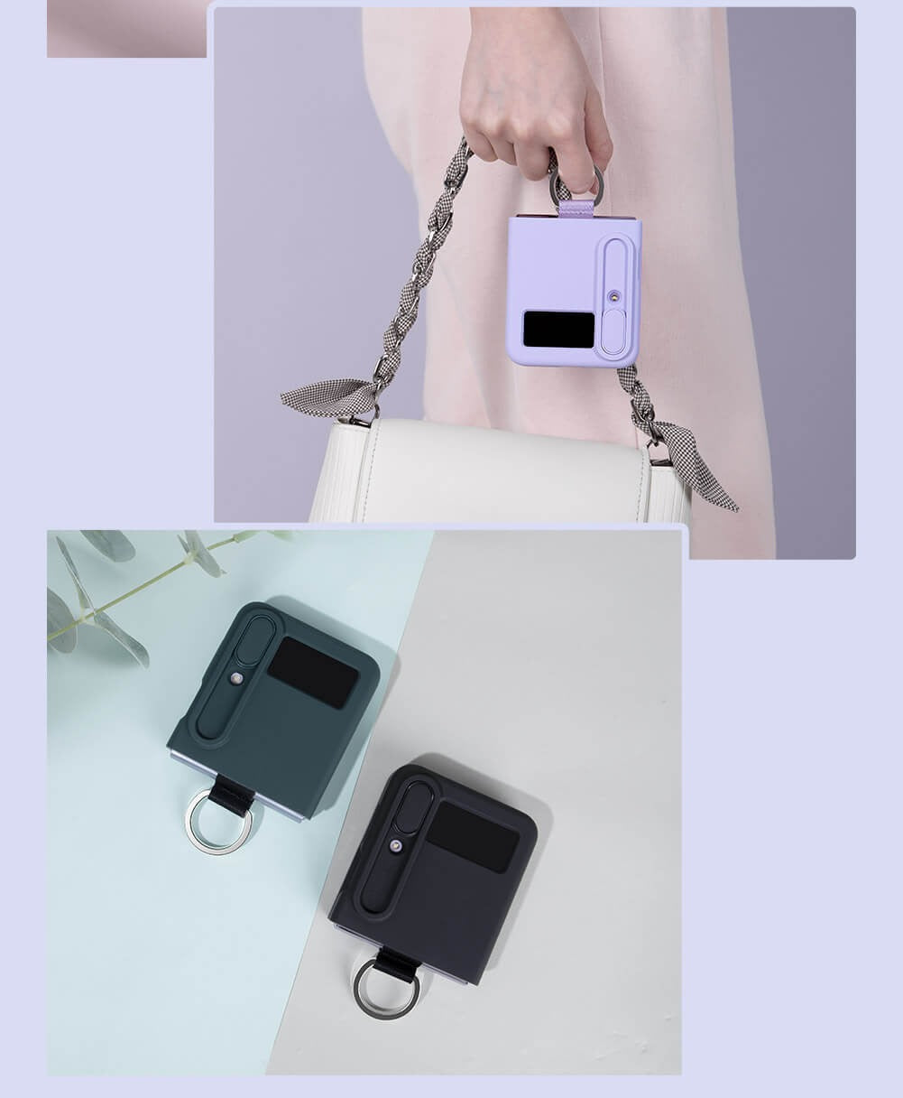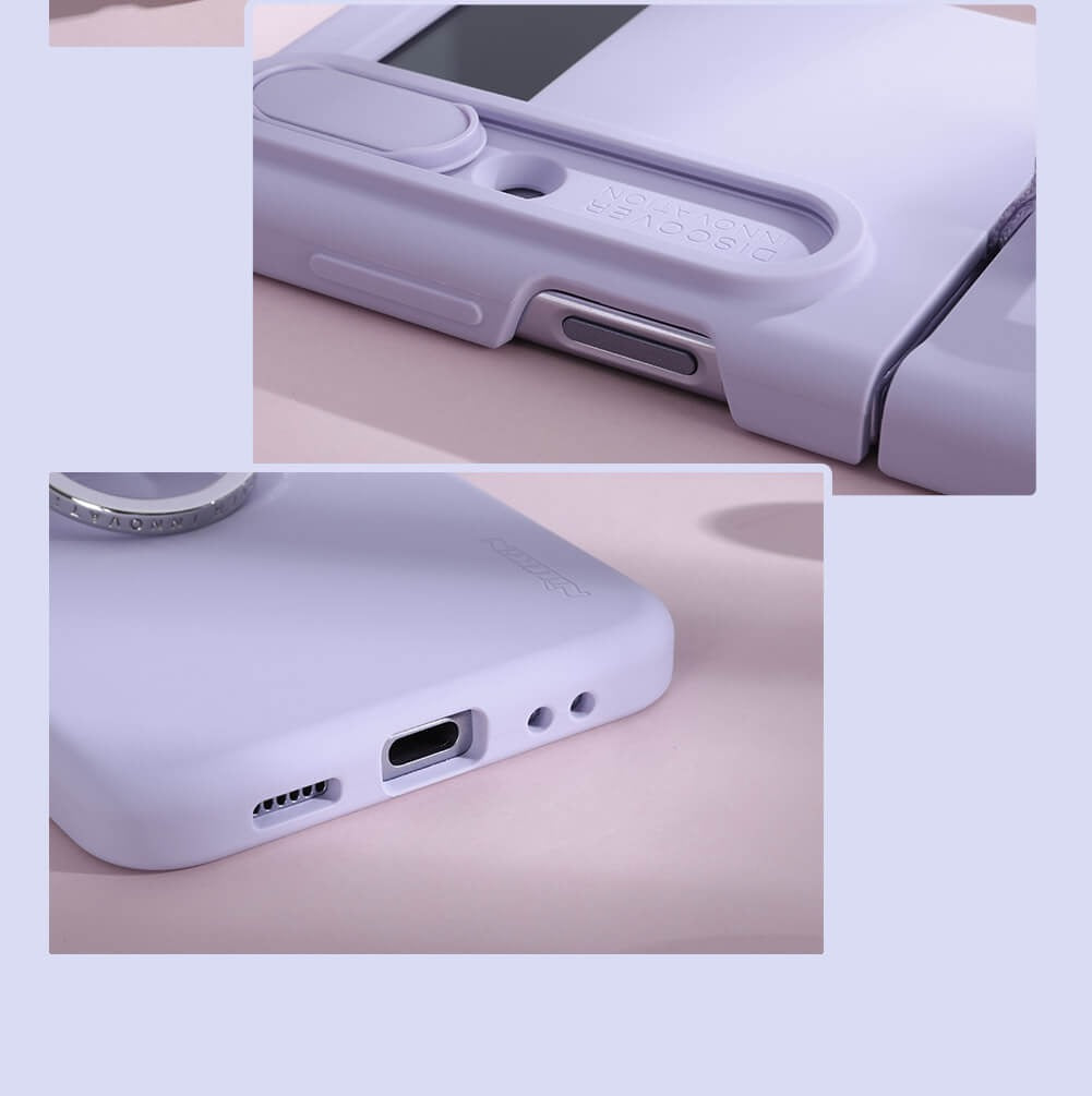 CamShield Silky Silicone Case combines fashion, feel and protection for Samsung Galaxy Z Flip4. Add the creative ring bracket for phone, adopt foldable structure at 180°. Using food-grade liquid silicone features delicate and soft touch, elegant and extraordinary texture. Patented lens sliding cover not only prevents phone camera from scratching, but phone's privacy from disclosure. It's surface of the case is coated with AF coating which effectively protects against fingerprints, sweat and oil stains. Soft fibers inside offers protection to your phone's body from wear.