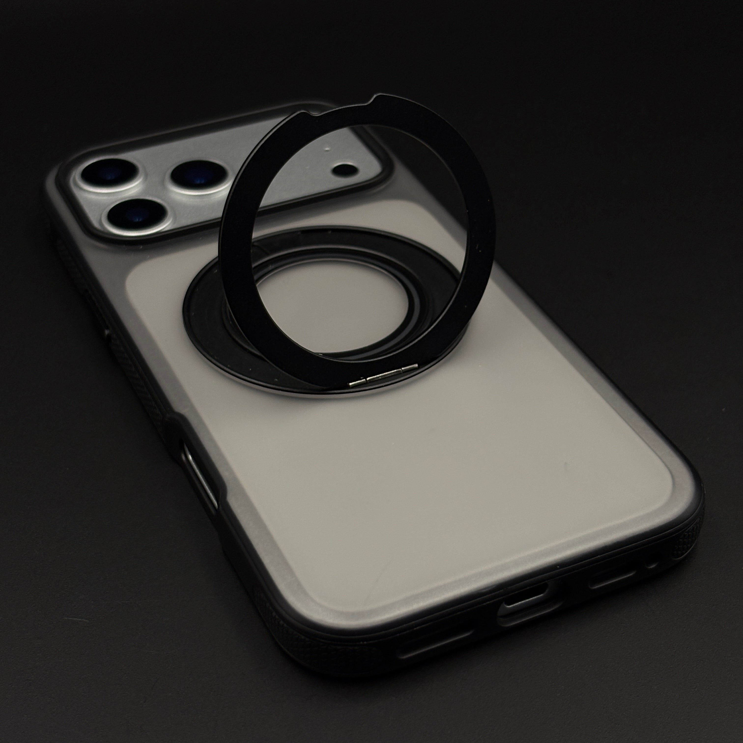 Showcase and protect your iPhone 17 Series with this clear case featuring a built-in rotating metal stand for flexible viewing. Designed with premium anti-yellowing materials and MagSafe compatibility for effortless charging and accessory use.