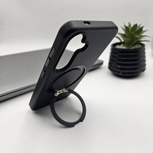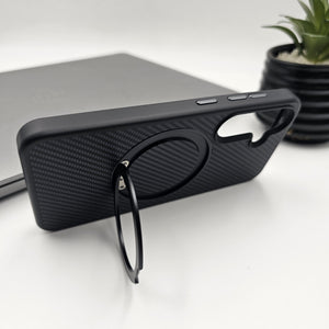 Transform your phone with our premium carbon fiber-inspired case, blending protection and elegance in one. Featuring a robust magnetic ring stand, this case is perfect for hands-free viewing and easy magnetic mounting. The textured finish offers a sophisticated look while ensuring a secure grip.